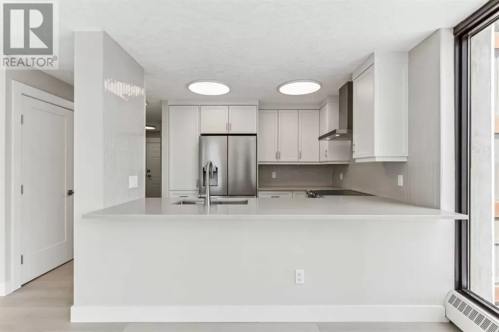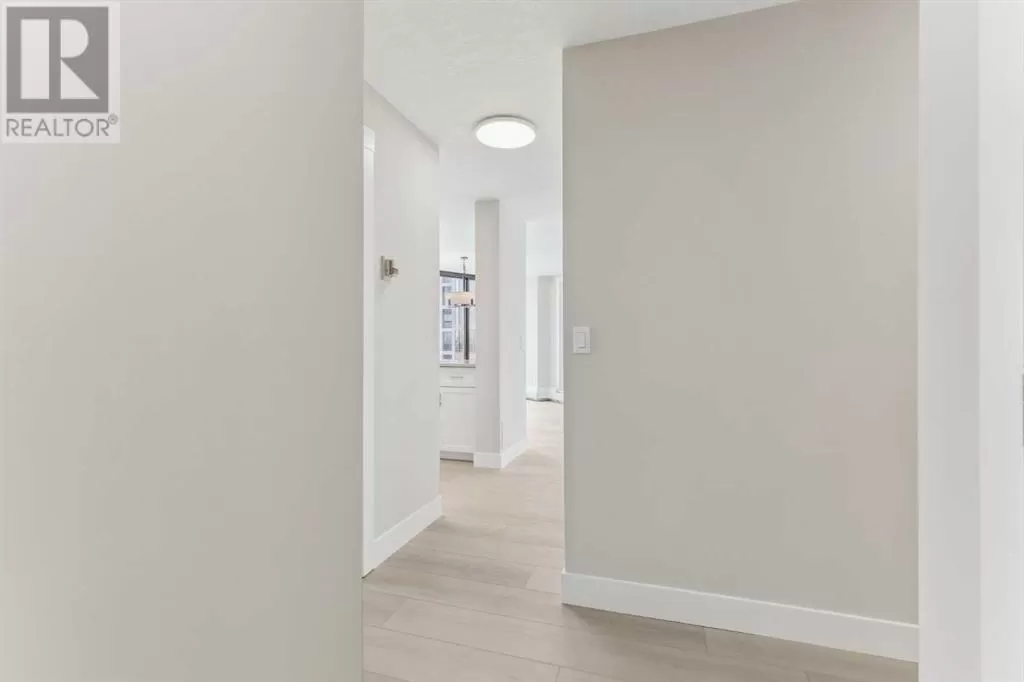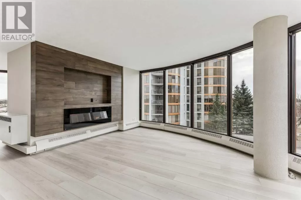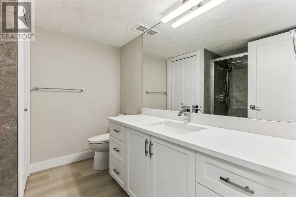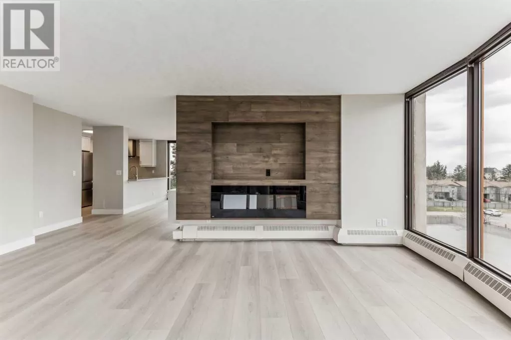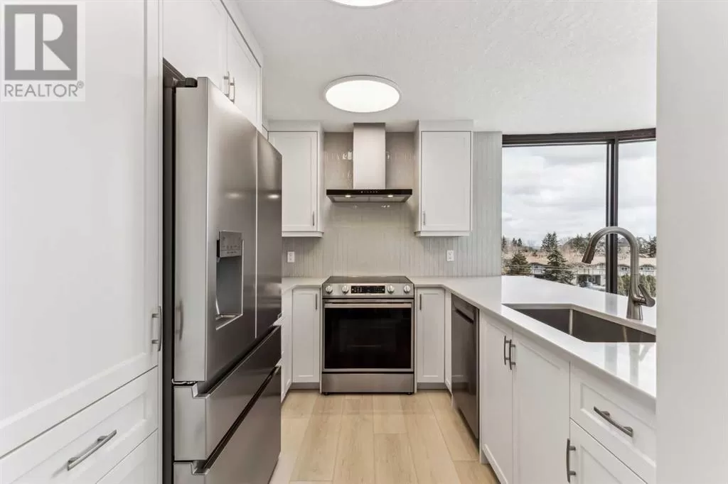 Impressive adult living 18+ COMPLETELY RENOVATED top to bottom 5th floor condo with exceptional workmanship and finishing in the exclusive Odyssey Towers of Coach Hill, with only four units per floor. Enjoy panoramic views from the floor-to-ceiling curved windows in this beautifully appointed 1178sq ft, bright and open floor plan. The condo features a CUSTOM KITCHEN, two bedrooms, an updated bathroom with a walk-in shower, in-suite laundry with a sink, a large in-suite storage room, and a generous-sized balcony. Renovations include a custom kitchen, vanities with quartz throughout, a complete stainless steel appliance package, air conditioning, a stunning feature wall with a built-in electric fireplace, new flooring throughout (luxury vinyl plank, and carpet), a new laundry sink, a wall-to-wall walk-in shower, knockdown textured ceilings throughout, upgraded plumbing and electrical, and much more. There are two parking stallsâone secured underground and a second convenient outdoor stall, as well as ample visitor parking. Amenities include a personalized building manager, a guest suite in each building for overnight guests, a sauna/steam room, a resident's club, beautifully manicured green spaces and gardens, and a very well-managed and maintained complex. Enjoy maintenance-free living in one of Calgary's premier adult living communities! Conveniently located within minutes to the bus stop/direct line to West Side LRT Station, Ambrose University, Rundle College, West Side Rec Center, parks, pathways, restaurants, and less than fifteen minutes to downtown. Quick possession and move-in ready! (id:27476)