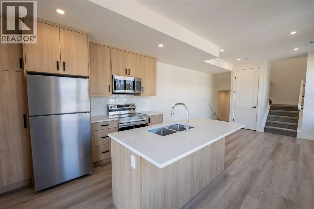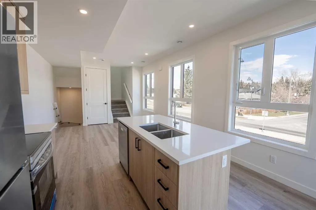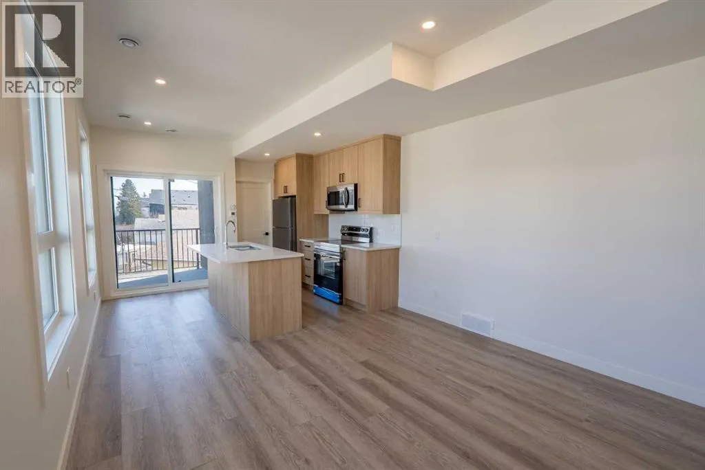 This brand-new unit offers modern living in a vibrant, well-connected location. Step into a bright and welcoming foyer with convenient access to the single-car garage, utility room, and front hall closet.Stylish vinyl plank flooring leads you to the main living area, filled with natural light from three expansive picture windows. Step out onto the east-facing deckâperfect for morning coffee or relaxed evenings.The chef-inspired kitchen features floor-to-ceiling cabinetry, quartz countertops, a deep stainless steel island sink, premium stainless steel appliances, and bar seating for three. The adjoining family room is thoughtfully designed for both intimate evenings and comfortable entertaining.Upstairs, youâll find two well-appointed bedrooms with built-in closet organizers and a shared three-piece bathroom. A plush, carpeted staircase enhances the cozy feel of this upper level.Located just steps from local shops and services, and offering quick access to the Trans-Canada Highway, Stoney Trail, Sholdice Park, and the Bow Riverâthis is a fantastic opportunity to enjoy the best of inner-city living. Now move-in ready and awaiting your personal touch! (id:27476)