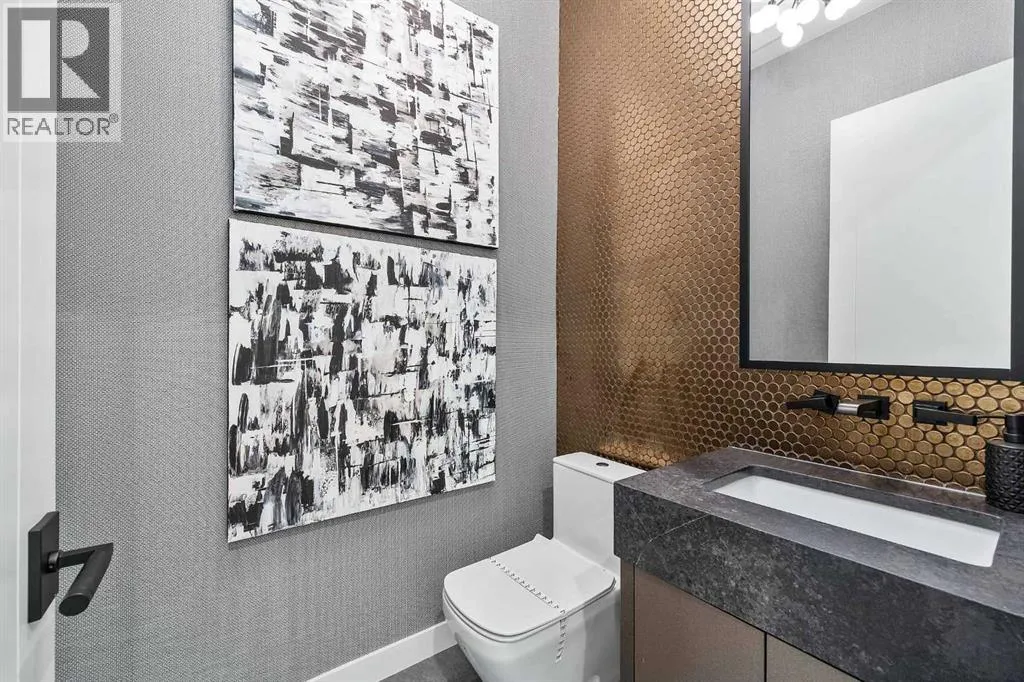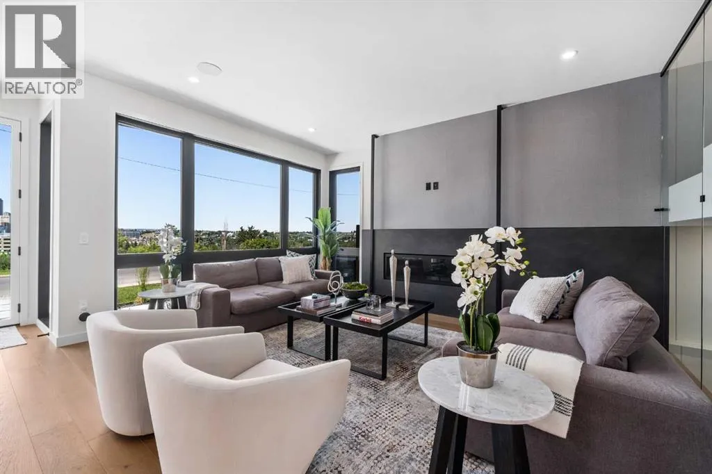 An architectural masterpiece by Silverpoint Custom Homes and Paul Lavoie Interior Design. Perched on a spectacular lot overlooking Bridgeland, and offering breathtaking views of the City and Rocky Mountains. A 5,200-square-foot gem, which seamlessly blends Hollywood Hills vibes, in a meticulous and one of a kind design. A fantastic open floor plan with a separate formal living and dining rooms overlooking the city. Boasting a truly magnificent kitchen, featuring a 13ft waterfall island and all MIELE appliances. Hardwood floors weave throughout the four levels including the basement, creating a harmonious atmosphere of seamless design. The main level surprises you with a hidden coat closet, a spacious mudroom, and a private den overlooking a backyard oasis with a large deck, (hot-tub ready) Move effortlessly between levels via the elevator or a captivating floor to ceiling glass-walled staircase leading to three generous bedrooms and a master top suite, simply like no other. The second floor offers 3 spacious bedrooms with panoramic city views from 2 bedrooms, private balconies, and a separate family lounge with access to a full guest bath. A fabulous laundry room and linen closet complete this level, not to mention large picture windows offering fulll sunrise worthy east views. The third-floor PRINCIPAL BEDROOM is a showstopper with a HUGE BALCONY showcasing the best panoramic city and mountain vews. A separate lounge area with coffee bar, fridge and a built in TV LIFT separate the bedroom area. As you enter the ensuite, flooded with natural light, a magical SMARTGLASS window gives you the option of privacy, or to enjoy the fabulous city views while soaking in the tub. A luxurious dual vanity, dual spa shower area surrounded by glass, featuring heated floors and shower bench. The walk-in wardrobe suite is a one of a kind dream space, with built in's that will rival a designer shop. Large skylights, a huge window and your own washer/dryer, make this the p erfect dressing area. The lower level caters to the extended family and features a media area with full bar, gym, and a large bedroom. A full bath including a steam shower completes this level with all heated hardwood flooring. The outdoor spaces surrounding the house lets you indulge in extended year round outdoor living. A large front patio with a fire pit option, and seating lets you indulge in the west city and mountain views. The rear yard offers you a great dining space, and private relaxation areas with an optional hot tub, and a multi purpose sports area or green space. This home as expected includes all Smart home features, an elevator, extensive internal glass walls, AC, infloor heat, and an oversized garage with a full third car garage option which can be built prior to possession for the buyer. An amazingly unique home with modern, yet classic design elements, encompassing every luxury option a discerning home owner would desire in their dream home. (id:27476)