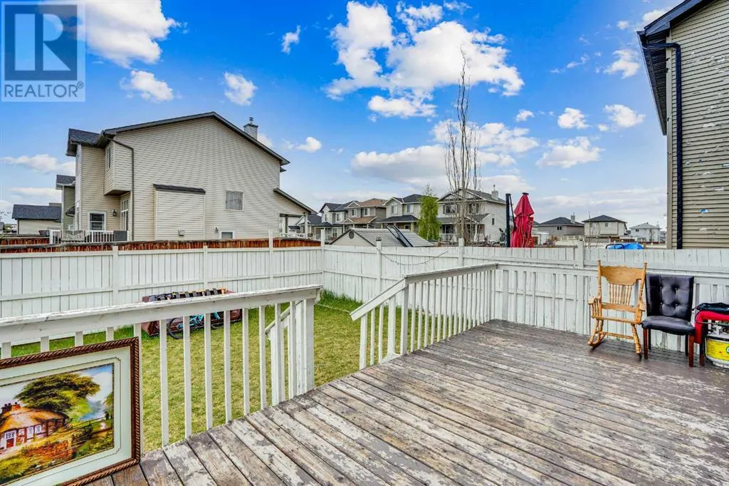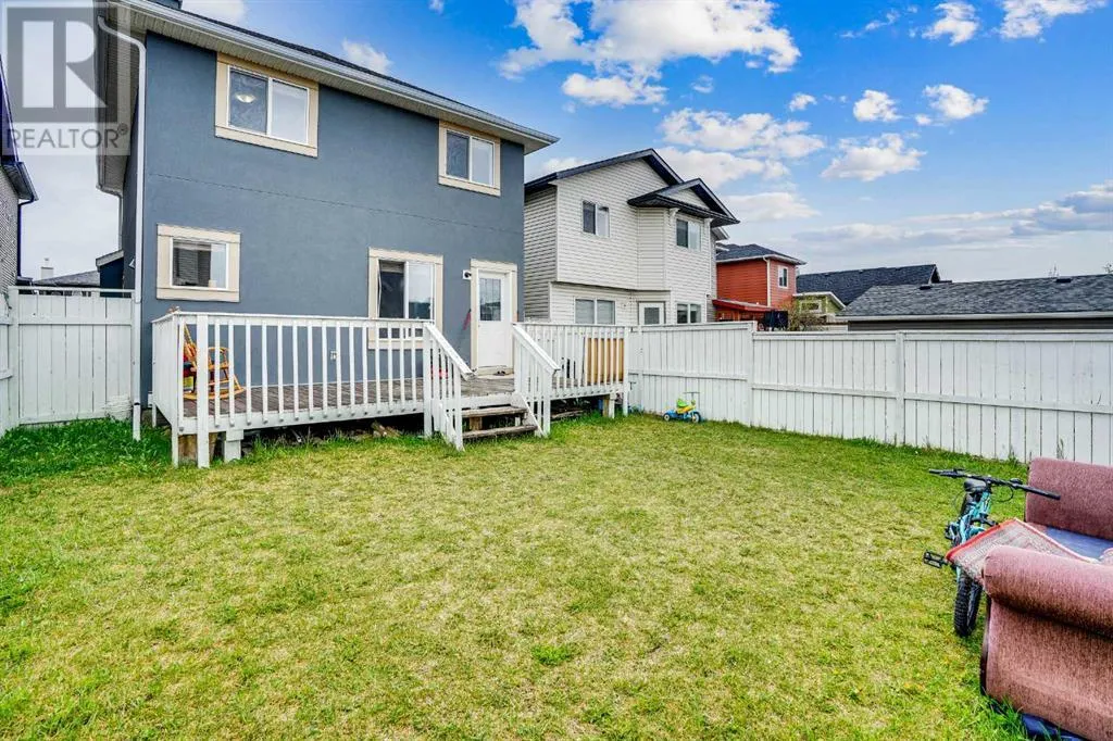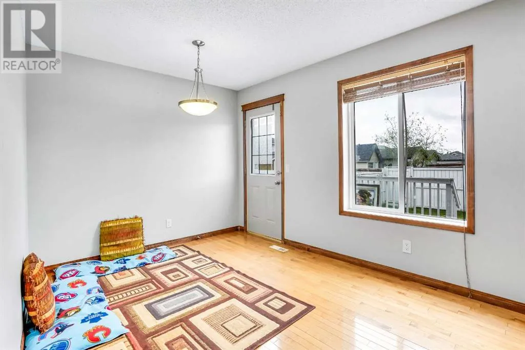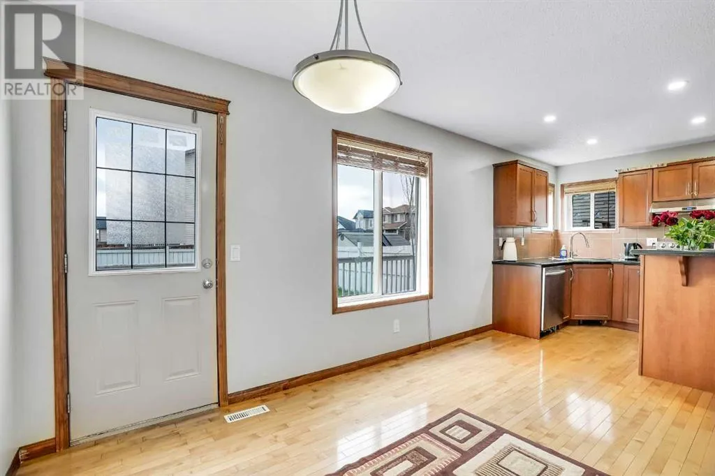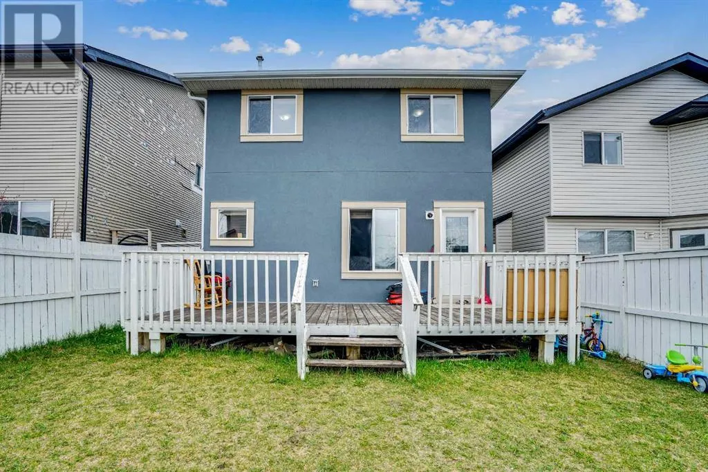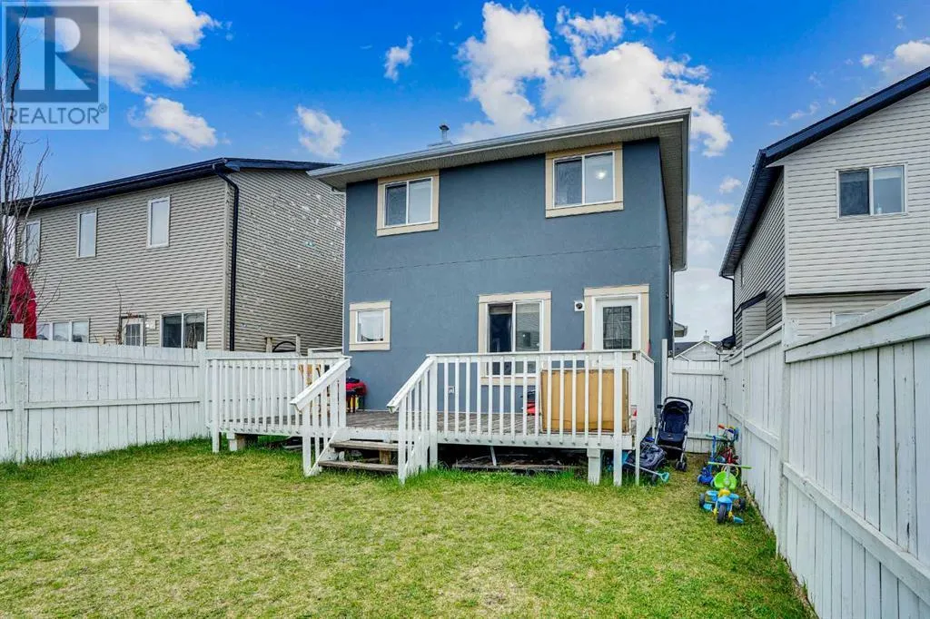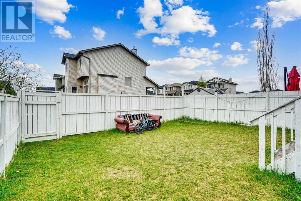 Welcome to this beautifully maintained two-storey detached home with an ATTACHED DOUBLE GARAGEStep inside to discover an open-concept main floor featuring gleaming HARDWOOD floors, a spacious and inviting family room with a cozy gas fireplace, a bright breakfast nook, and a stylish kitchen equipped with GRANITE countertops and STAINLESS STEEL APPLIANCES.Upstairs, youâll find a generous primary bedroom complete with a 4-PIECE ENSUITE that includes a JETTED TUB and a large WALK-IN CLOSET. The upper level also offers two additional well-sized bedrooms and a 4-piece main bathroom.The illegally suited basement has a SEPARATE SIDE ENTRANCE and has with egress windows. It features a MODERN kitchen with granite countertops and backsplash, a full bathroom, one bedroom, and its OWN LAUNDRY facilities.Exterior highlights include durable stucco siding, a private backyard with a FULLY FENCED and landscaped yard, and a BACK PATIO perfect for outdoor enjoyment.Located close to schools, parks, grocery stores, the Genesis Centre (with library and YMCA), as well as convenient access to Stoney Trail, Calgary International Airport, bus stops, and the train station. A wonderful place to call home in a highly accessible community! (id:27476)