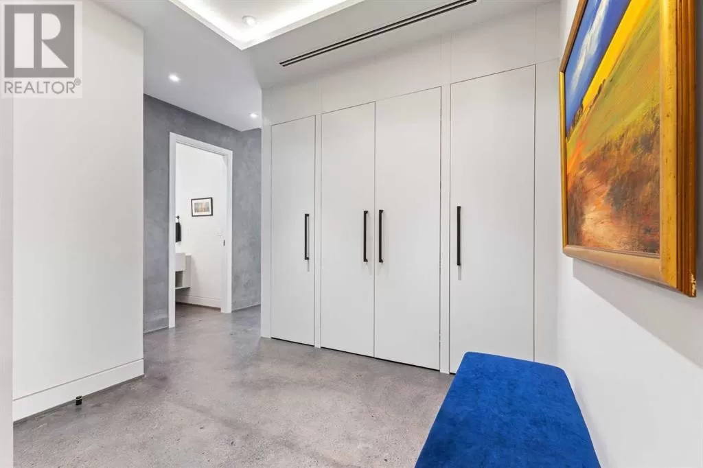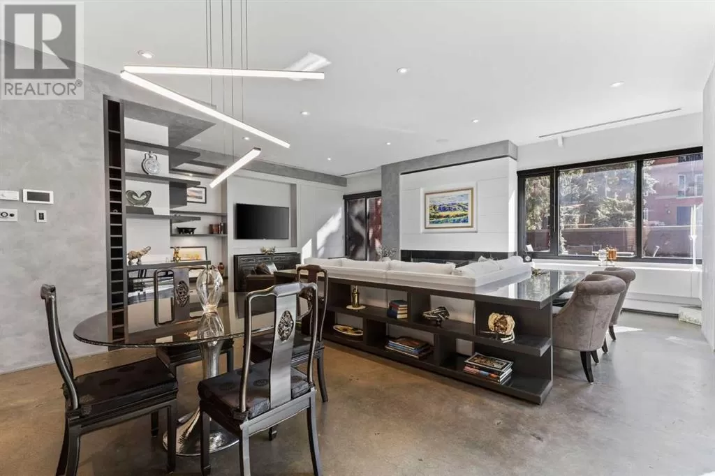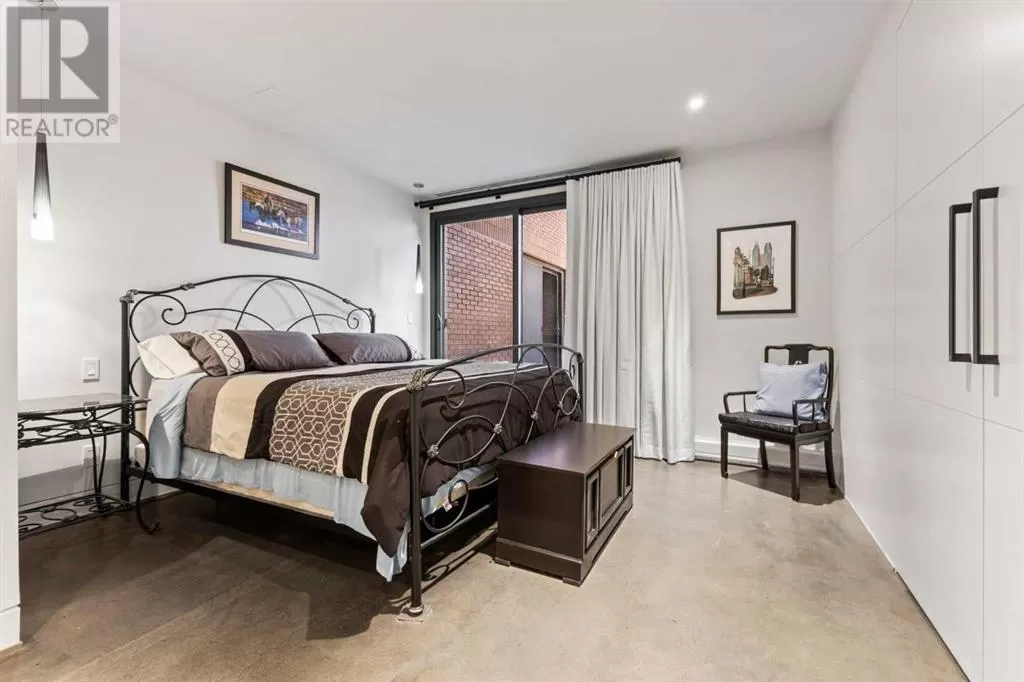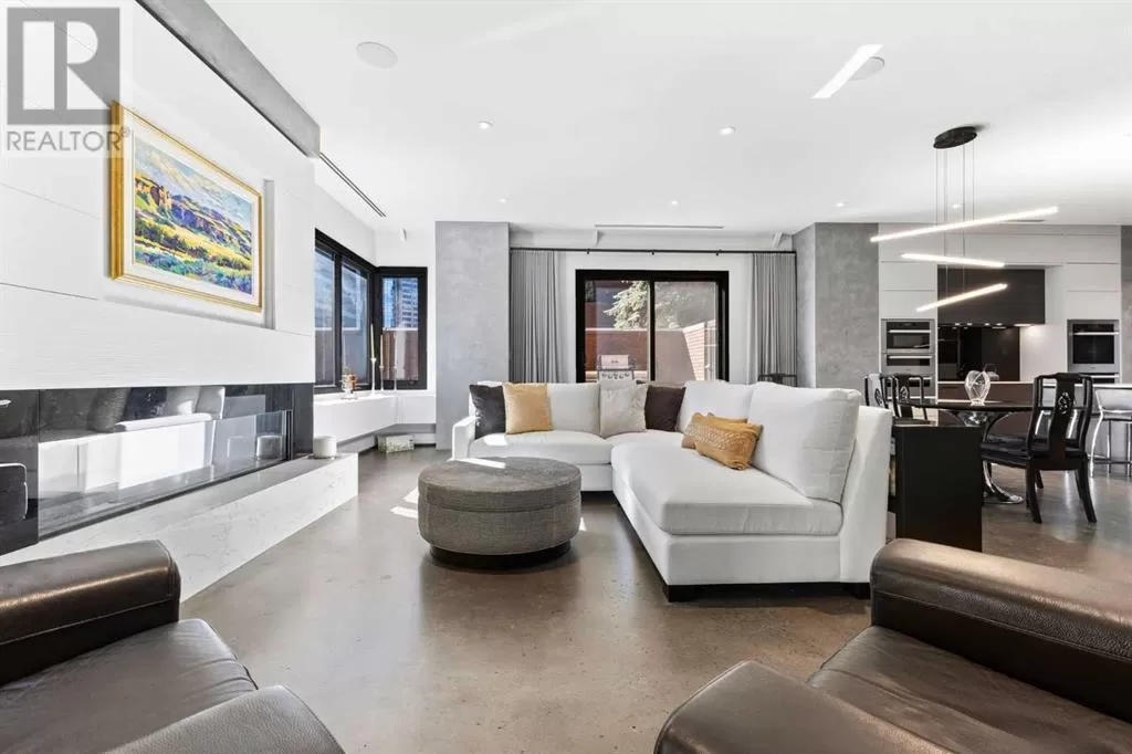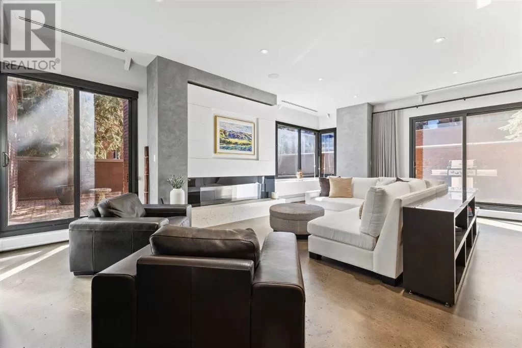 This meticulously renovated residence by Stephanie Martin Interior Design presents an unparalleled balance of contemporary elegance, and curated living. 10ft. ceilings create an immediate sense of grandeur, complementing the high design where every detail maximizes functionality, including integrated storage solutions for a streamlined aesthetic. The inviting living area, featuring a fireplace with painted glass surround, a custom-built sectional, including a bespoke desk for optimized remote workâseamlessly blends high design with productivity. The dining space is anchored by a suspended lighting fixture, large kitchen island, and a premier appliance package for a true chef's experience. This thoughtfully executed one-bedroom layout includes a custom walk-in closet for superior organization. The European spa-inspired ensuite bathroom offers a luxurious escape, featuring an Ultra bath air tub and an open-style shower. A well appointed powder room, and laundry room complete your home. Beyond the refined interiors, this main-floor unit home has two private patios, extending the living space and offering an immersive urban experience. Located within the prestigious 500 Eau Claire Estates, it provides a unique balance of tranquility and accessibility, discreetly positioned in a secluded section of the building. The details of the renovation are precisely implemented, and must be experienced to appreciate this level of exemplar design. (id:27476)