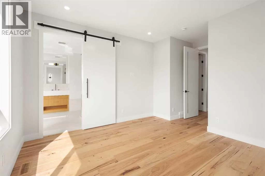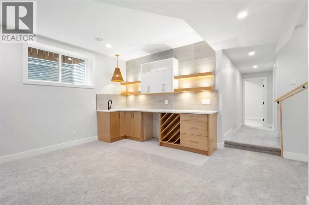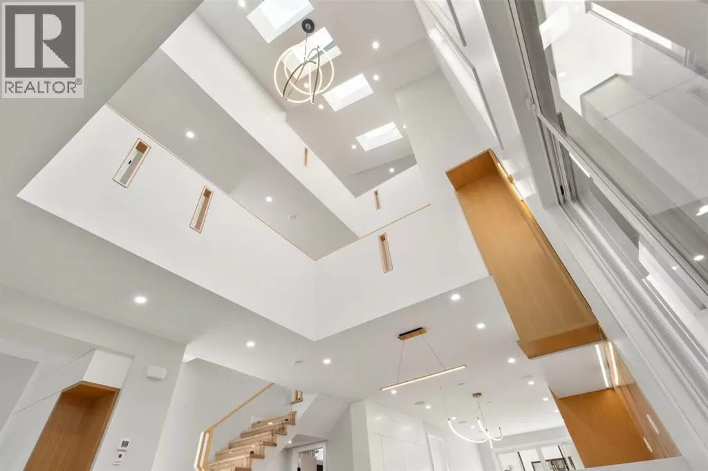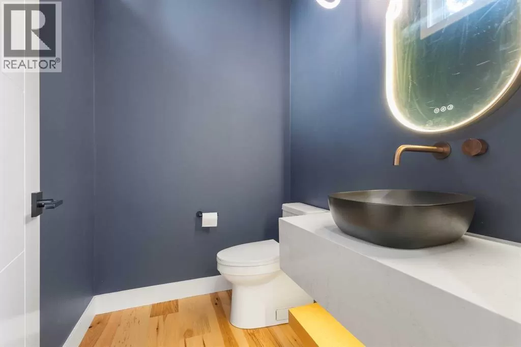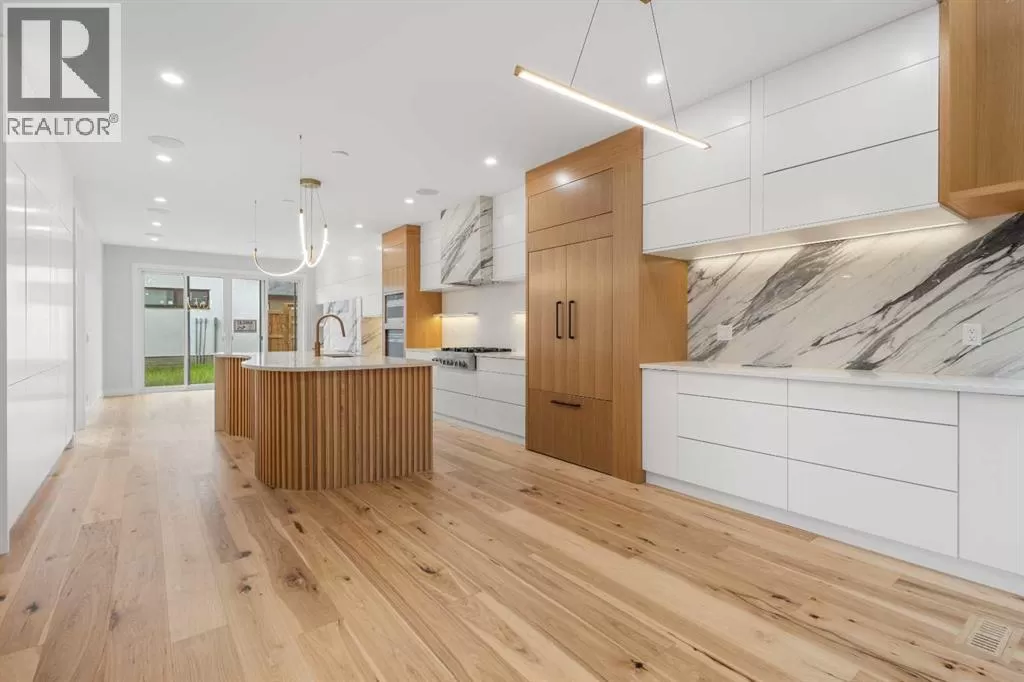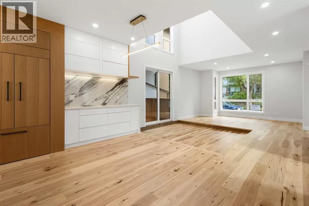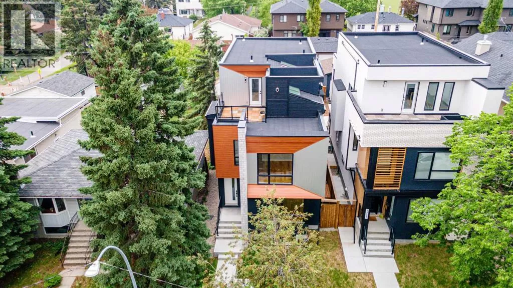 Welcome to an exceptional contemporary residence boasting over 4,000 sq ft of exquisitely designed living space, nestled on a quiet, tree-lined street in the prestigious Capitol Hill community. This architectural gem blends sophisticated style, artistic character, and practical functionalityâall just steps from top-rated elementary schools, SAIT, 16th Ave, Nose Hill Park, and a short drive to the University of Calgary, Foothills Hospital, Childrenâs Hospital, and Downtown Calgary. The one-of-a-kind luxury infill features artistic architecture with open-to-above design. Step inside and experience a warm, inviting ambiance highlighted by rich hardwood flooring throughout. The gourmet kitchen is a showpieceâfeaturing a curved center island, custom cabinetry, and fully integrated JennAir appliances, including a hidden fridge and dishwasher. This seamless flow continues into the open-concept dining and living areas, where a striking modern gas fireplace is framed with designer tile. Enjoy indoor-outdoor living with sliding patio doors that lead to a sun-soaked south-facing deck, complete with a natural gas lineâperfect for summer BBQs. A versatile flex room offers space for a home office or reading lounge, while a contemporary powder room, and a well-organized mudroom with lockers round off the thoughtfully designed main floor. Upstairs, a cozy family lounge and a large laundry room with a sink provide everyday convenience. Each of the three bedrooms on this level comes with its own private ensuite, ensuring comfort and privacy for family or guests. The master bedroom ensuite is a luxurious retreat featuring in-floor heating, dual vanities, a deep soaker tub, and a spa-style glass walk-in shower with multiple showerheads. All bedrooms are equipped with Vanair doors, providing both soundproofing and enhanced air circulation. The top floor features a stunning bonus flex room with a wet bar, full bathroom, and access to two rooftop patiosâa south-facing terrace offering pan oramic city skyline views, and a spacious north-facing deck ready for your personal touch. This level is perfect for entertaining or could easily convert into a fourth bedroom or office. The fully developed basement with in-floor heating offers even more flexibility with an expansive recreation room, a second wet bar, a fifth bedroom, and another full bathroom. Donât miss your chance to make this extraordinary property your own. Book your private showing today. (id:27476)