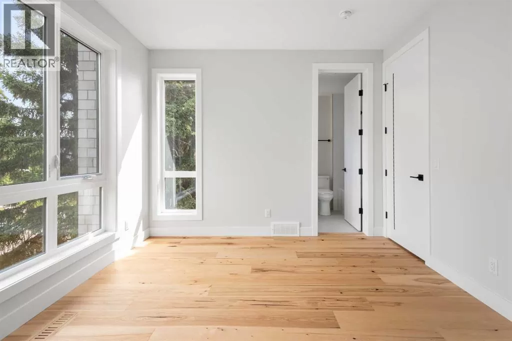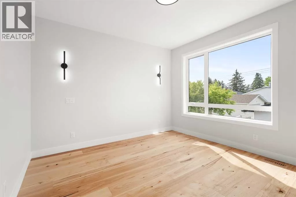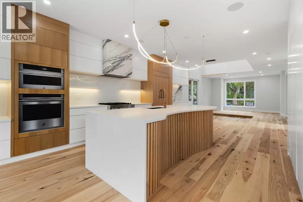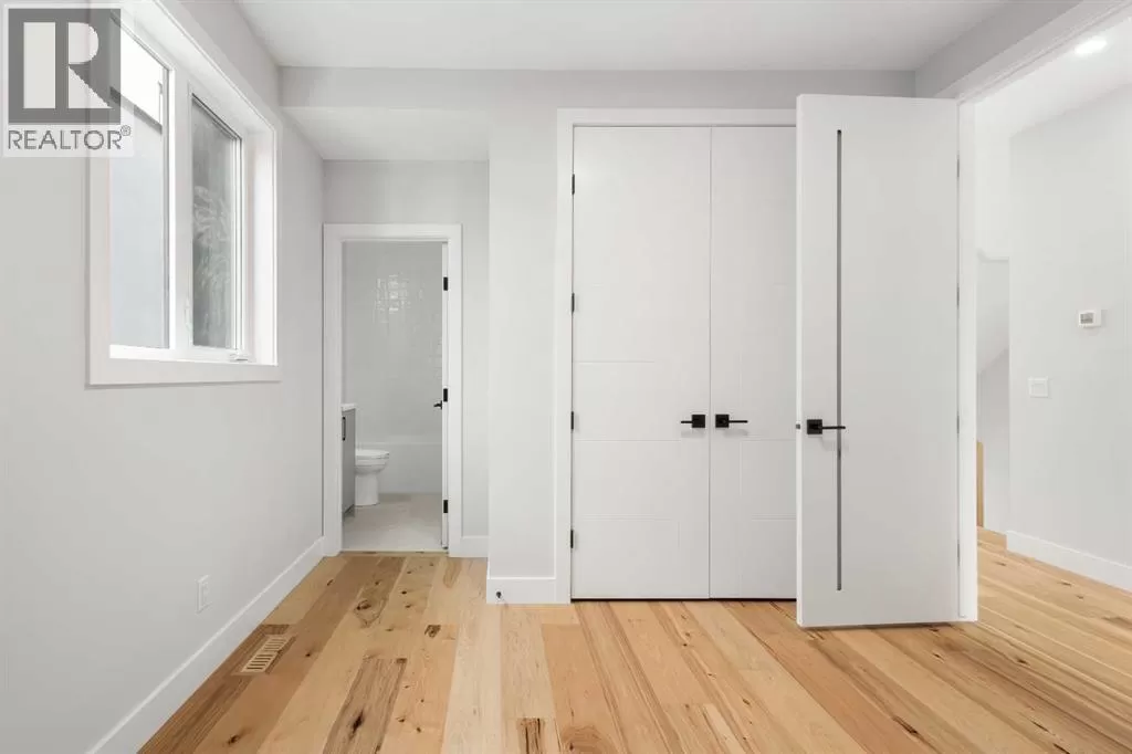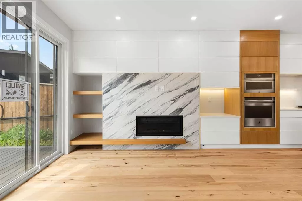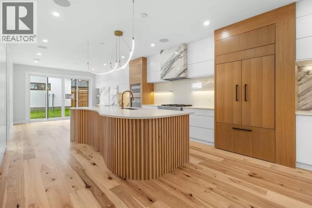 Welcome to an exceptional contemporary residence boasting over 4,000 sq ft of exquisitely designed living space, nestled on a quiet, tree-lined street in the prestigious Capitol Hill community. This architectural gem blends sophisticated style, artistic character, and practical functionalityâall just steps from top-rated elementary schools, SAIT, 16th Ave, Nose Hill Park, and a short drive to the University of Calgary, Foothills Hospital, Childrenâs Hospital, and Downtown Calgary. The one-of-a-kind luxury infill features artistic architecture with open-to-above design. Step inside and experience a warm, inviting ambiance highlighted by rich hardwood flooring throughout. The gourmet kitchen is a showpieceâfeaturing a curved center island, custom cabinetry, and fully integrated JennAir appliances, including a hidden fridge and dishwasher. This seamless flow continues into the open-concept dining and living areas, where a striking modern gas fireplace is framed with designer tile. Enjoy indoor-outdoor living with sliding patio doors that lead to a sun-soaked south-facing deck, complete with a natural gas lineâperfect for summer BBQs. A versatile flex room offers space for a home office or reading lounge, while a contemporary powder room, and a well-organized mudroom with lockers round off the thoughtfully designed main floor. Upstairs, a cozy family lounge and a large laundry room with a sink provide everyday convenience. Each of the three bedrooms on this level comes with its own private ensuite, ensuring comfort and privacy for family or guests. The master bedroom ensuite is a luxurious retreat featuring in-floor heating, dual vanities, a deep soaker tub, and a spa-style glass walk-in shower with multiple showerheads. All bedrooms are equipped with Vanair doors, providing both soundproofing and enhanced air circulation. The top floor features a stunning bonus flex room with a wet bar, full bathroom, and access to two rooftop patiosâa south-facing terrace offering pan oramic city skyline views, and a spacious north-facing deck ready for your personal touch. This level is perfect for entertaining or could easily convert into a fourth bedroom or office. The fully developed basement with in-floor heating offers even more flexibility with an expansive recreation room, a second wet bar, a fifth bedroom, and another full bathroom. Donât miss your chance to make this extraordinary property your own. Book your private showing today. (id:27476)