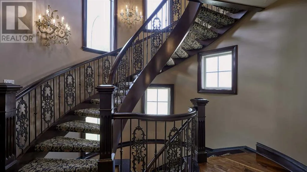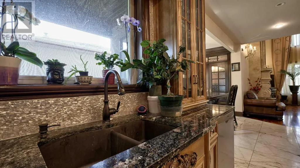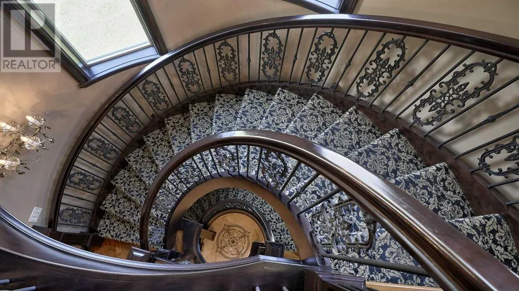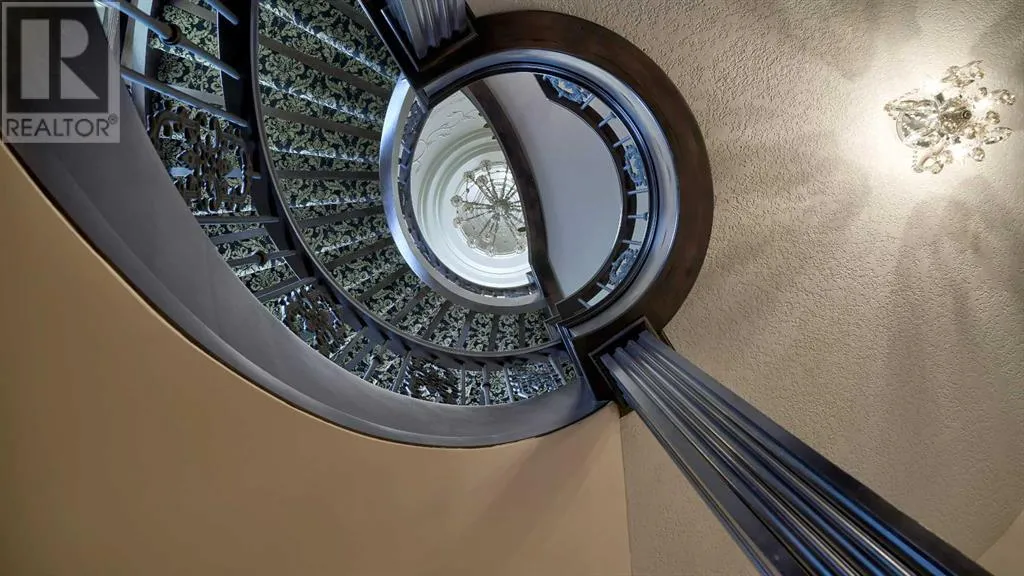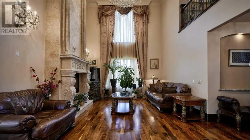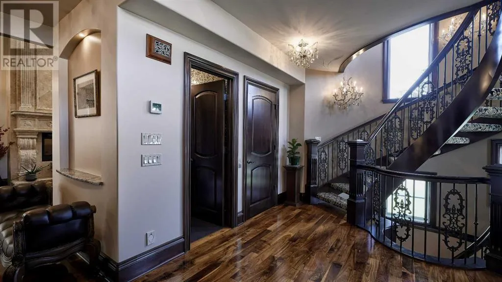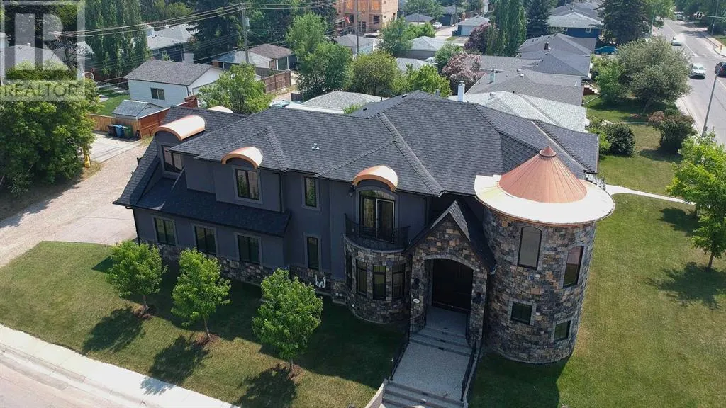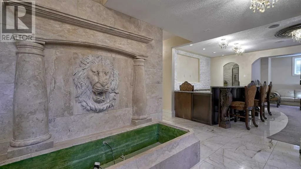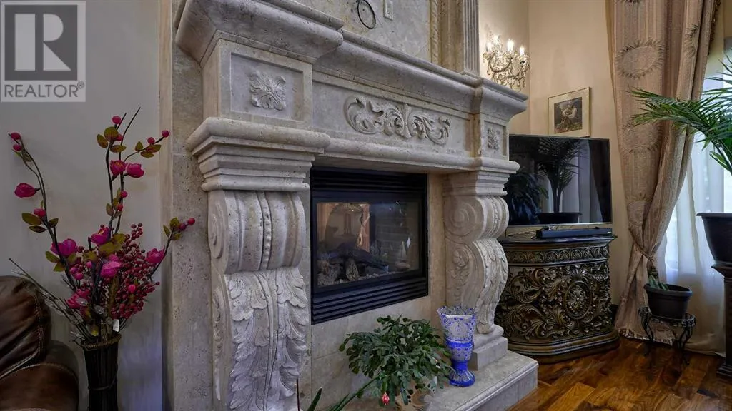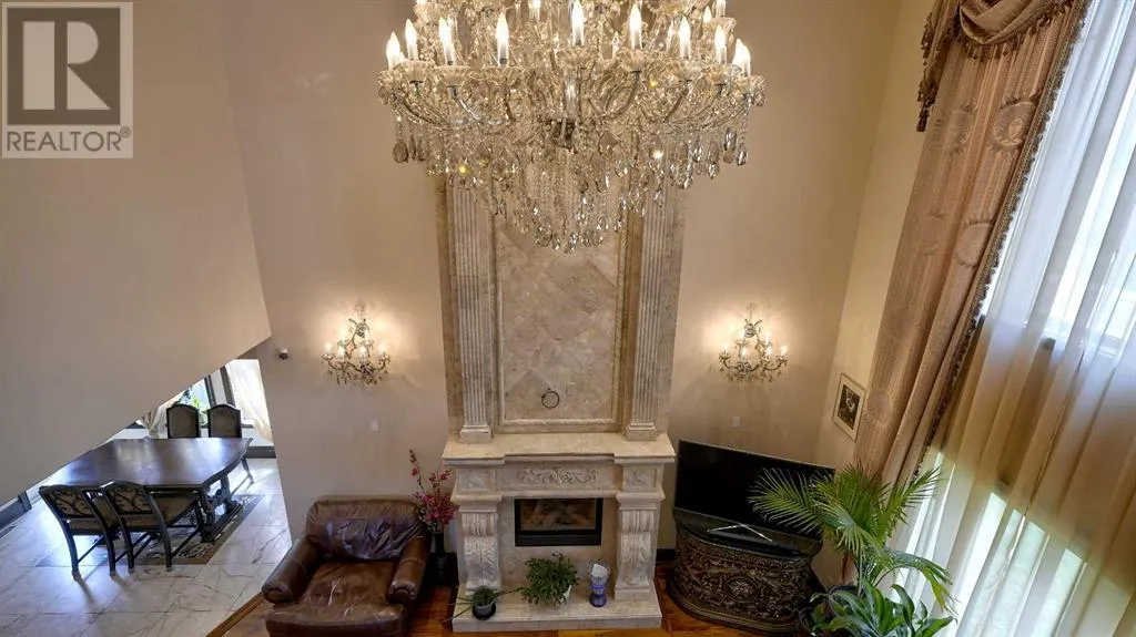 Itâs tempting to call this residence âThe Castleââwith its turreted stone corner capped in copperâbut even that title canât capture the refinement and craftsmanship within.From the moment you step inside, a marble inlay set within gleaming hardwood floors and a stunning crystal chandelier create an unforgettable first impression. A grand circular staircase spirals gracefully through the turret, showcasing exquisite millwork, solid-core maple doors, and even a private elevator.The formal dining room exudes timeless elegance with a second chandelier, rich hardwood cornices, paneled walls, and a built-in service bar complete with a wine coolerâperfect for entertaining.The living room soars with dramatic height, anchored by a full-height imported limestone fireplace framed by sweeping draperies. To the left, the gourmet kitchen impresses with heated marble floors, custom maple cabinetry, granite countertops, and a large island adorned with hand-carved maple corbels. A matching limestone range hood and a mother-of-pearl backsplash add a luxurious touch, all beneath a custom plaster ceiling.Double French doors open to a versatile main-floor officeâprivate when needed, open when desiredâadorned with the same bronze hardware featured throughout the home. A stylish powder room with a black seashell backsplash and agate stone sink, a walk-in pantry, and a well-appointed laundry room with garage access complete the main level.Upstairs, a custom plaster ceiling and another dazzling chandelier crown the landing, overlooking both the grand foyer and living room below. The master suite is a serene retreat featuring custom millwork, a two-sided fireplace, and a luxurious ensuite with maple cabinetry, a jetted tub, and an expansive tile shower with a circular inlaid medallion. The custom walk-in closet offers impeccable organization and design.Three additional bedrooms each feature walk-in closets. Two share a beautifully detailed Jack-and-Jill bathroom, while the third enjoys a private ensuite.Descending the circular staircase, the lower level reveals another showpieceâa striking limestone waterfall wall. The spacious family room centers around the homeâs third fireplace and a full wet bar, with nearby access to the wine room. A fifth bedroom with walk-in closet and a four-piece bath provide comfort for guests or extended family.Outside, a sun-soaked south-facing yard offers privacy and elegance with its stone fireplace and full fencing. A heated triple-car garage and generous driveway complete this extraordinary home.Every inch of this residence speaks to artistry and attention to detail. Truly a home that must be experienced to be fully appreciated. (id:27476)