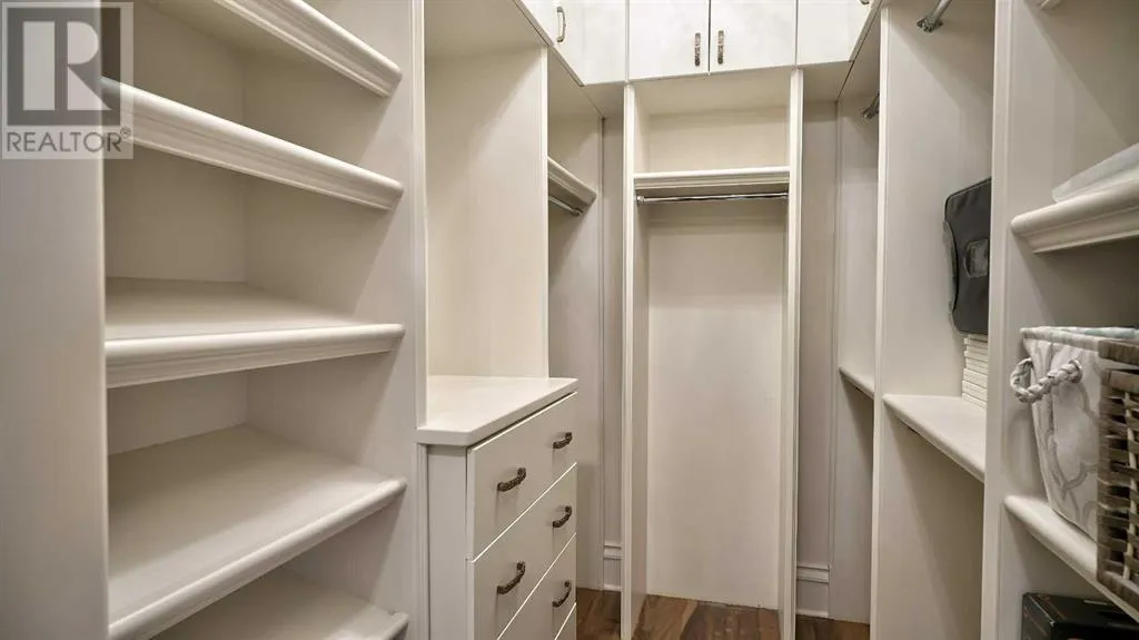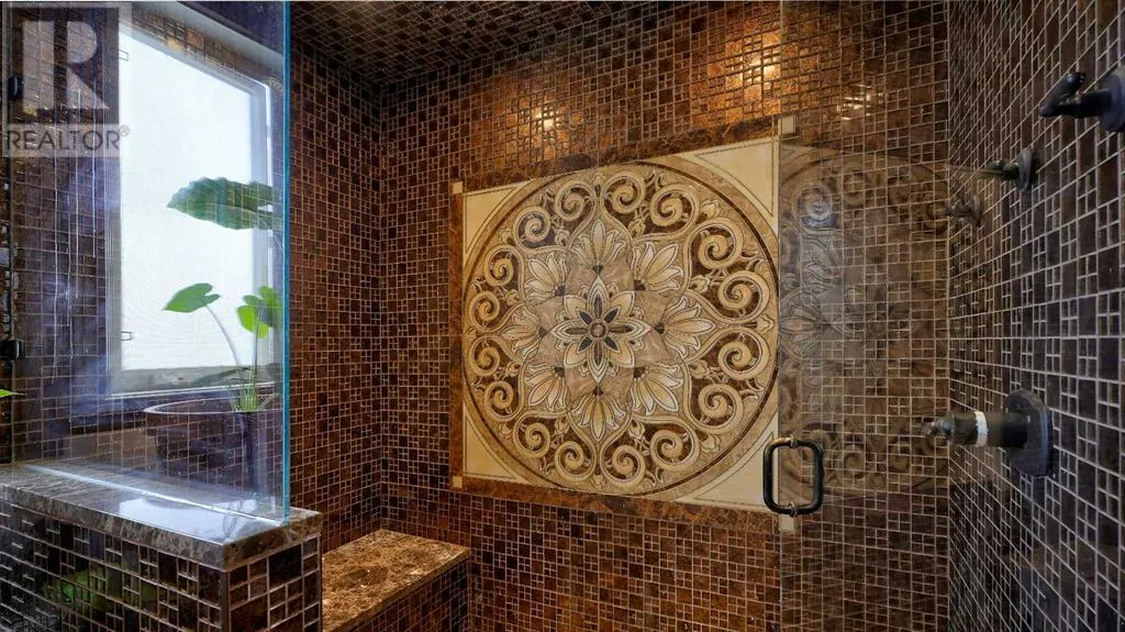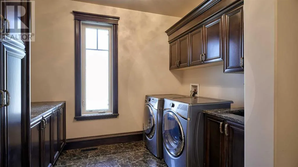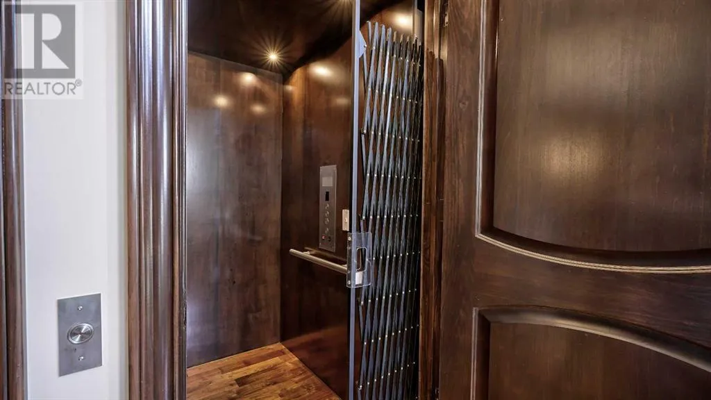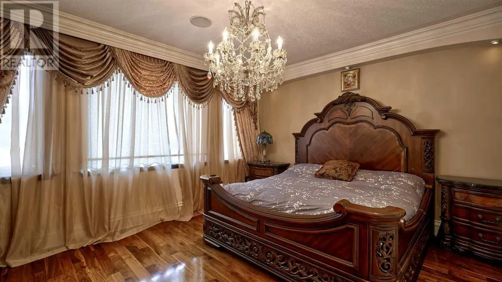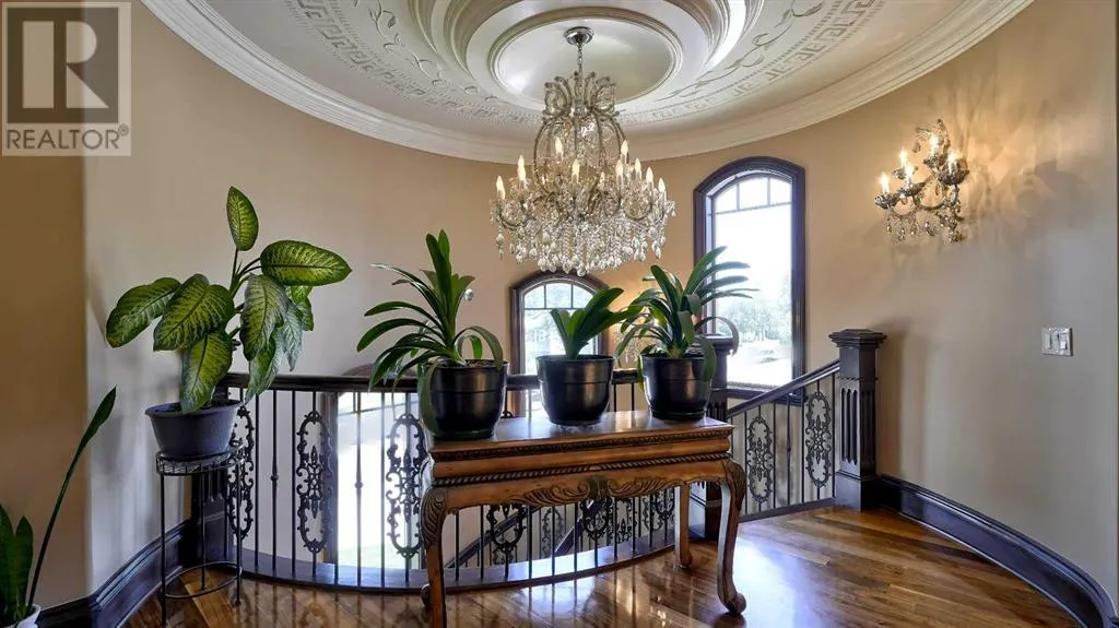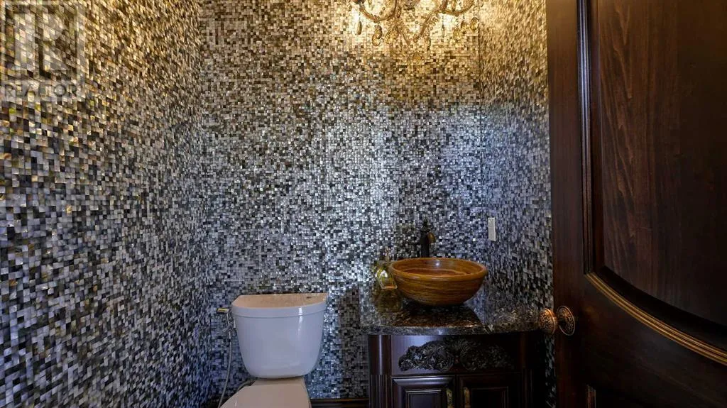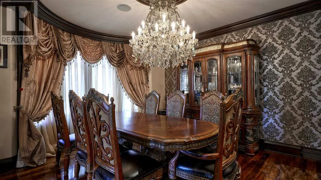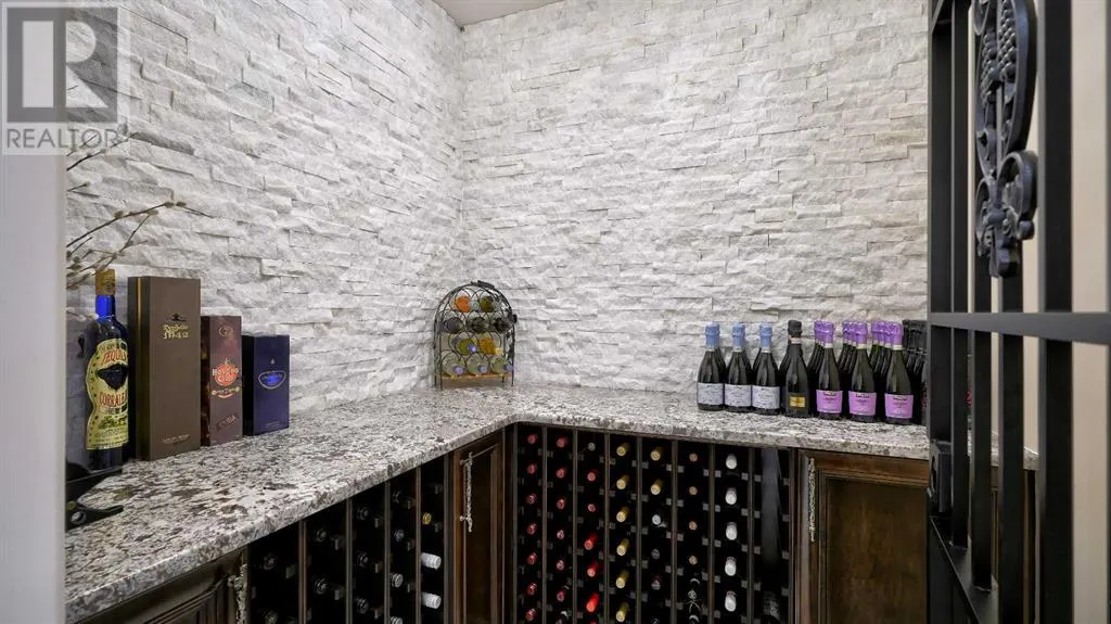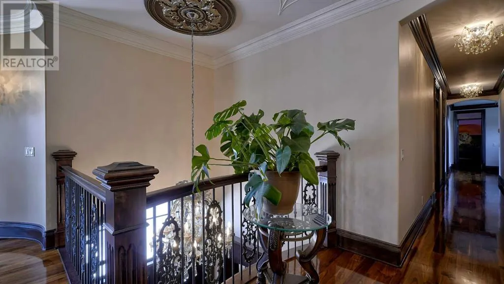 Itâs tempting to call this residence âThe Castleââwith its turreted stone corner capped in copperâbut even that title canât capture the refinement and craftsmanship within.From the moment you step inside, a marble inlay set within gleaming hardwood floors and a stunning crystal chandelier create an unforgettable first impression. A grand circular staircase spirals gracefully through the turret, showcasing exquisite millwork, solid-core maple doors, and even a private elevator.The formal dining room exudes timeless elegance with a second chandelier, rich hardwood cornices, paneled walls, and a built-in service bar complete with a wine coolerâperfect for entertaining.The living room soars with dramatic height, anchored by a full-height imported limestone fireplace framed by sweeping draperies. To the left, the gourmet kitchen impresses with heated marble floors, custom maple cabinetry, granite countertops, and a large island adorned with hand-carved maple corbels. A matching limestone range hood and a mother-of-pearl backsplash add a luxurious touch, all beneath a custom plaster ceiling.Double French doors open to a versatile main-floor officeâprivate when needed, open when desiredâadorned with the same bronze hardware featured throughout the home. A stylish powder room with a black seashell backsplash and agate stone sink, a walk-in pantry, and a well-appointed laundry room with garage access complete the main level.Upstairs, a custom plaster ceiling and another dazzling chandelier crown the landing, overlooking both the grand foyer and living room below. The master suite is a serene retreat featuring custom millwork, a two-sided fireplace, and a luxurious ensuite with maple cabinetry, a jetted tub, and an expansive tile shower with a circular inlaid medallion. The custom walk-in closet offers impeccable organization and design.Three additional bedrooms each feature walk-in closets. Two share a beautifully detailed Jack-and-Jill bathroom, while the third enjoys a private ensuite.Descending the circular staircase, the lower level reveals another showpieceâa striking limestone waterfall wall. The spacious family room centers around the homeâs third fireplace and a full wet bar, with nearby access to the wine room. A fifth bedroom with walk-in closet and a four-piece bath provide comfort for guests or extended family.Outside, a sun-soaked south-facing yard offers privacy and elegance with its stone fireplace and full fencing. A heated triple-car garage and generous driveway complete this extraordinary home.Every inch of this residence speaks to artistry and attention to detail. Truly a home that must be experienced to be fully appreciated. (id:27476)