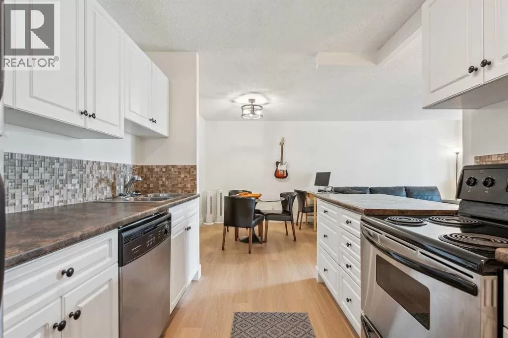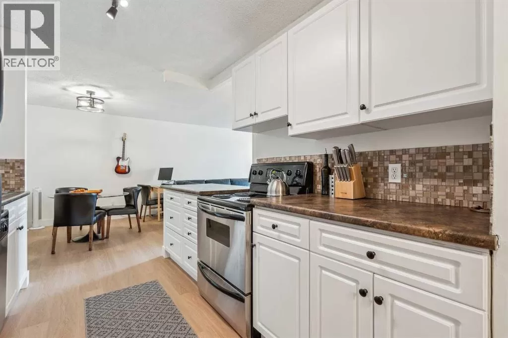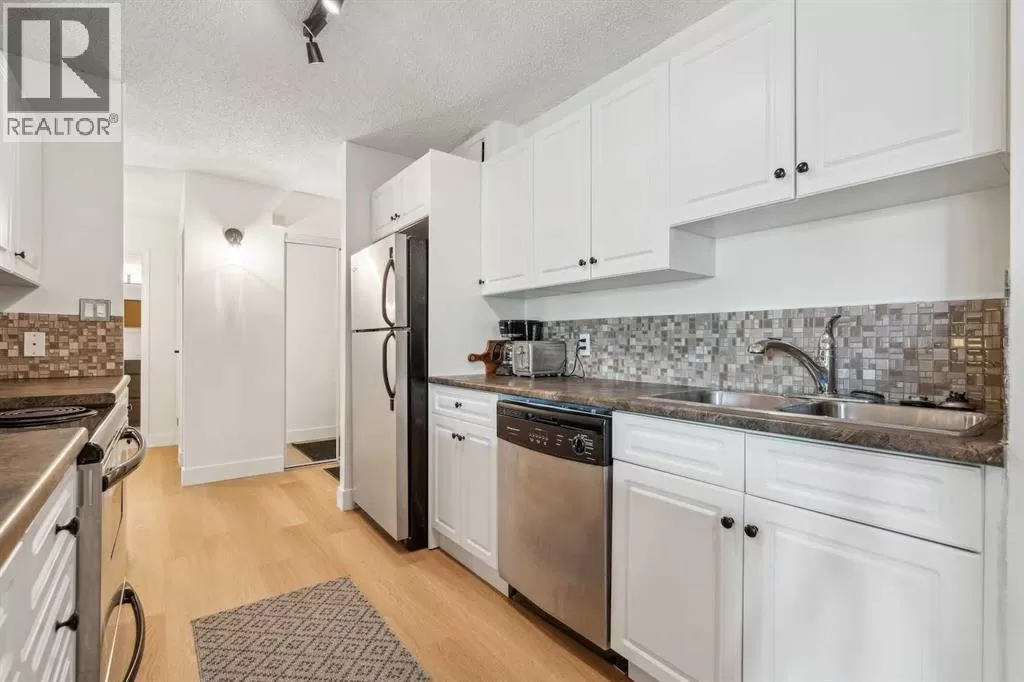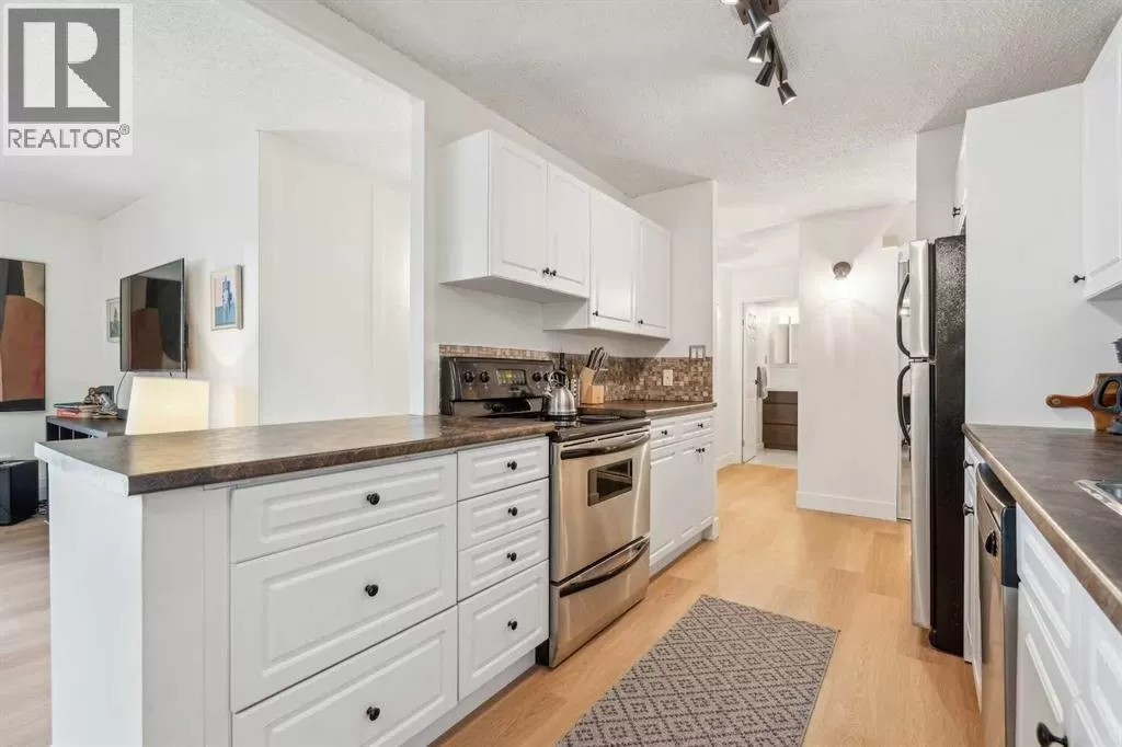 AirBnB Friendly! This beautifully updated 2-bedroom, 1-bathroom home offers a fresh and modern interior paired with thoughtful design details. Step inside to a spacious entryway featuring a board and batten feature wall that sets the tone for the rest of the home. Enjoy the warmth of south exposure and the convenience of heated underground parking.The kitchen is both functional and stylish, boasting white cabinetry with striking black hardware, stainless steel appliances, a mosaic tile backsplash, and contemporary black metal and glass light fixtures. Newly installed oak vinyl plank flooring runs seamlessly throughout the space, adding a touch of elegance.The fully renovated bathroom features a deep soaker tub with subway tile surround, ceramic tile flooring, and a sleek vanity with roll-out drawers for added storage. The entire home has been freshly painted, creating a bright, welcoming atmosphere.Enjoy two unique outdoor spaces: a cozy sunroom with a built-in reading nook and a separate balcony perfect for BBQs. Additional amenities include main floor common laundry and a secure, a large in-suite storage room and heated underground parking stall. Pet policy: weight restriction of 50kg. Move-in ready and full of charmâthis is a must-see! (id:27476)