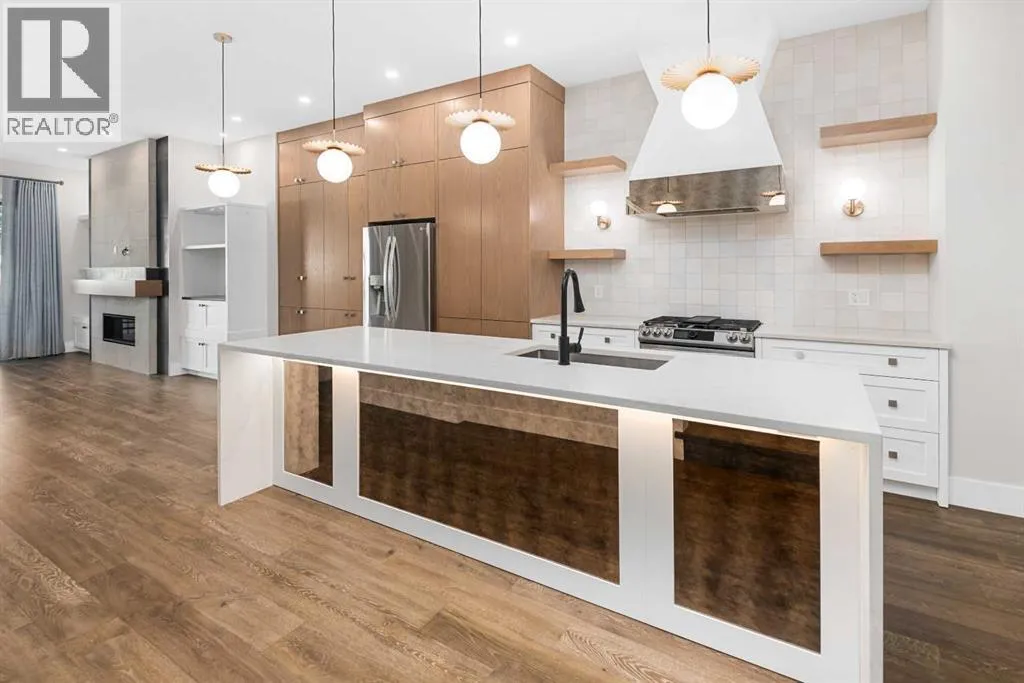 OPEN HOUSE SUNDAY NOVEMBER 9 2-4. Experience premier living in the heart of North Glenmore Park! This custom-built estate, designed in collaboration with the acclaimed House of Bishop, is a striking blend of timeless architecture and modern luxury. Situated on a quiet street bordering Altadore, this newly built single-family home offers standout curb appeal and over 2,700 sq. ft. of meticulously finished living space.Inside, youâll find a spacious open floor plan with 10-foot ceilings, designer lighting, wide plank hardwood floors, and a show-stopping gas fireplace with blower. The dream kitchen is a chefâs delight, featuring custom cabinetry, quartz countertops, a striking beveled backsplash, under-mount LED lighting, floor-to-ceiling oak built-ins, and premium stainless steel appliances including a 5-burner gas stove and custom hood fan.The upper level hosts a luxurious primary retreat with vaulted ceilings, a walk-in California Closet, and a stunning 5-piece ensuite complete (including bench), standalone tub. Two more bedrooms, a 4-piece bath, a laundry room, and linen storage complete the floor.The fully finished basementâaccessible via a private side entranceâoffers amazing flexibility, ideal for a future legal/illegal suite (subject to municipal approval). It includes 2 large bedrooms, a full bath, rough-ins for laundry, a wet bar or kitchenette, and hydronic in-floor heat rough-ins. Upgrades such as vinyl plank flooring, a stylish basement bar, and Hush City soundproofing on all walls and stairs elevate the comfort and function of this level.Extensive upgrades and features include:Gemstone lighting on house and garageHeated, insulated, and finished garageAquasana whole-house water filtration systemNew boiler and extra-large hot water tankAir conditioningLocking wrought iron gates & railings (stairs and deck)UV and privacy window film on all windows (except deck)Hunter Douglas blinds with blackout in all bedroomsBlackout curtains throughoutUpgraded California Closets in all key areasAdditional highlights include smart home lighting controlled by phone, rough-ins for a central vacuum system, and full exterior landscaping including fencing, softscaping, and cement walkways. Enjoy entertaining on the large rear deck or relax in the privacy of your fully landscaped backyard.Ideally located just minutes from downtown, public transit, Marda Loop, and some of Calgaryâs best schools, this home sets a new standard in thoughtful design and upscale living. Donât miss your chance to own one of North Glenmore Parkâs most impressive custom homes. (id:27476)