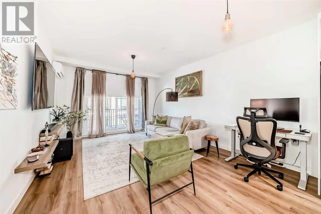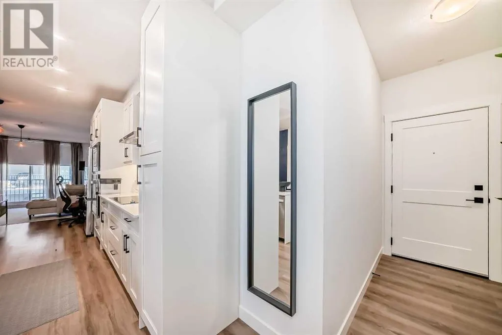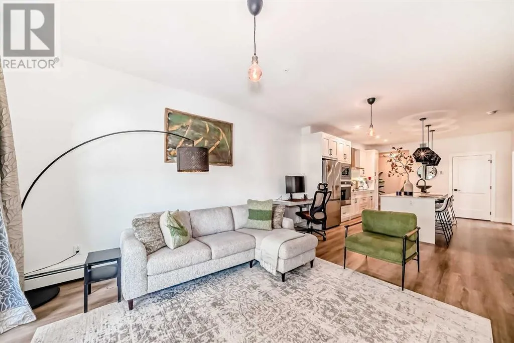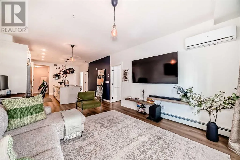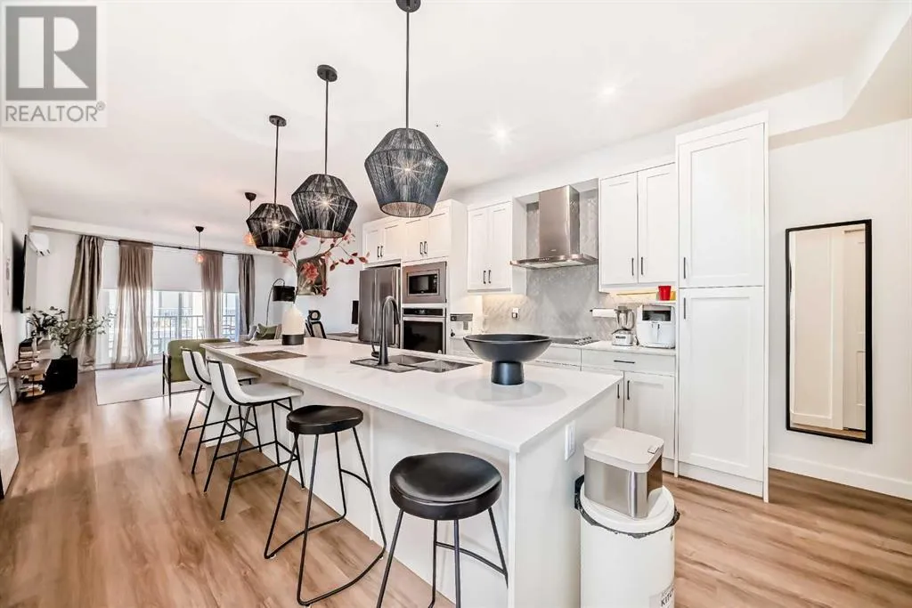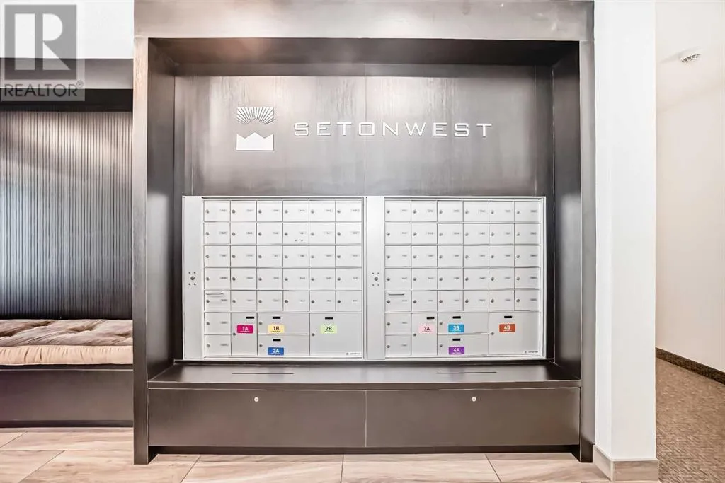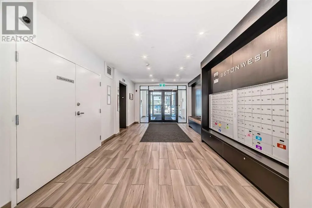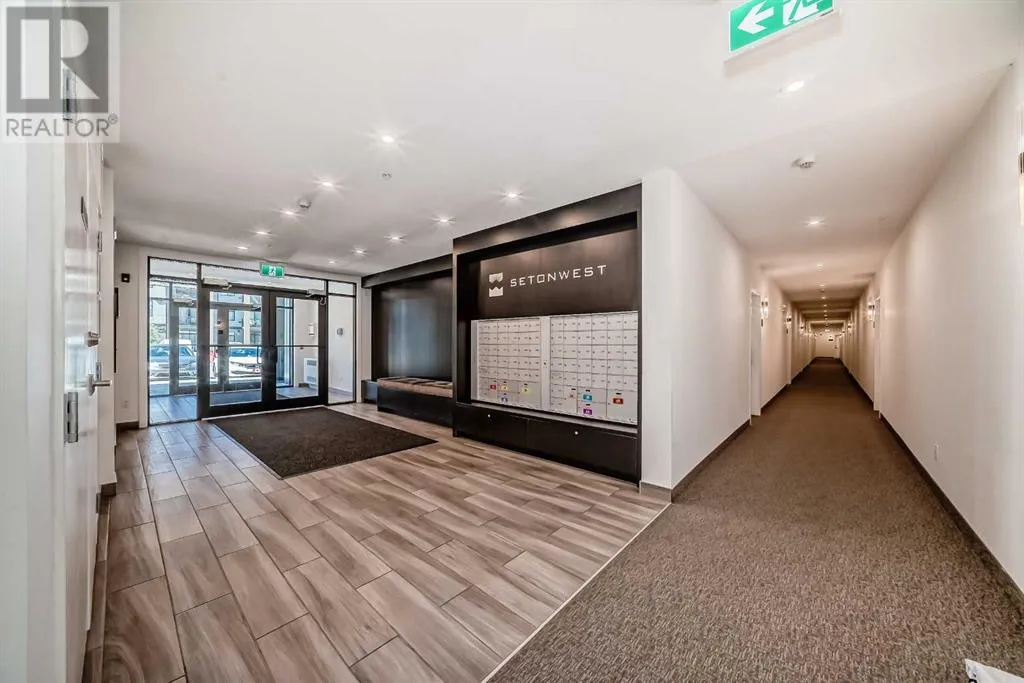 Welcome to this beautifully upgraded second-floor corner unit in the heart of Setonâoffering over 957 sq. ft. of thoughtfully designed living space with premium builder enhancements throughout. Perfect for first-time buyers, professionals, or those looking to downsize without compromising on quality, this home offers a perfect blend of comfort, style, and location.Situated in the vibrant Seton West community, you'll enjoy unrivaled access to shops, restaurants, the South Health Campus, the YMCA, and the future Green Line LRT. With quick access to Deerfoot and Stoney Trail, commuting across the city is effortless.Inside, a welcoming foyer leads you into an expansive open-concept living area. The designer kitchen is a true centrepieceâfeaturing a custom-extended island, full-height quartz backsplash, built-in wall oven, and a chimney-style hood fan. Pot drawers, upgraded fixtures, and a sleek matte black faucet complete this culinary showstopper.The kitchen flows seamlessly into the spacious dining and living areas, enhanced by large windows and luxury vinyl plank (LVP) flooring that extends throughout, including both bedrooms. Step outside to your 130 sq. ft. private patioâideal for morning coffee, summer BBQs (gas line included), or simply unwinding in comfort.The primary suite is a tranquil retreat with a large walk-in closet and a fully upgraded ensuite featuring dual under-mount sinks, a tiled walk-in shower, and quartz finishes. The second bedroom offers generous space and direct access to the main bathroomâperfect for guests or family.Additional features include central air conditioning, in-suite Samsung laundry, pot lighting, upgraded pendant fixtures, and a wall-mount TV package with hidden cable routing.This meticulously maintained home also comes with a titled underground parking stall (#605). Monthly condo fees include heat, water, building insurance, and moreâensuring both convenience and value.Enjoy a bright and balanced atmosphere with you r northeast-facing balcony, offering pleasant morning sunlight and cooler afternoonsâideal for outdoor living without the heat intensity of west-facing units.Move-in ready and better than new, this is your opportunity to enjoy a refined lifestyle in one of Calgary's most sought-after communities. Contact your favourite real estate agent today to schedule a private showing of this exceptional home! (id:27476)