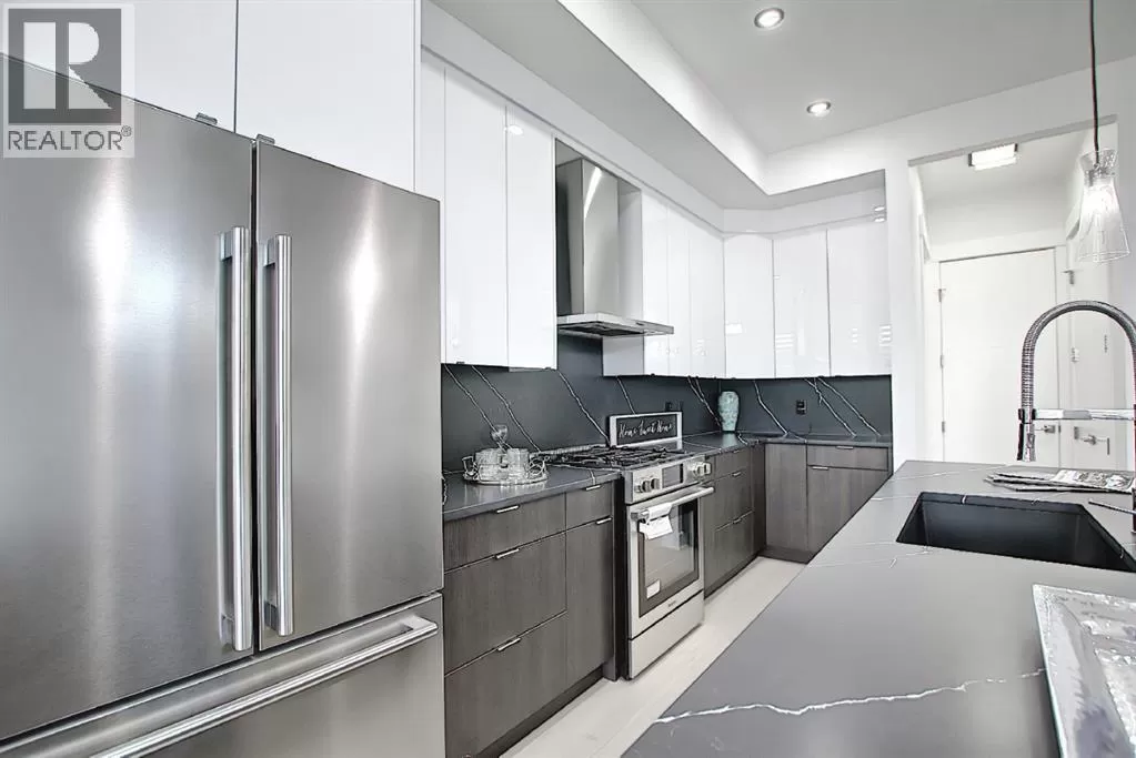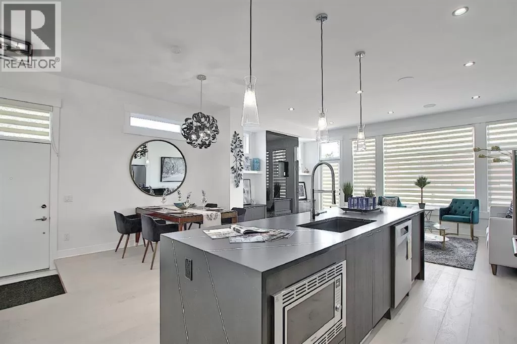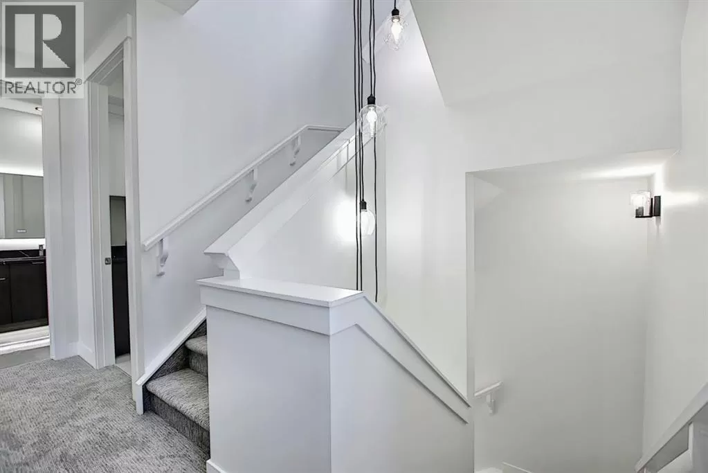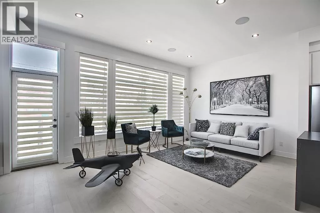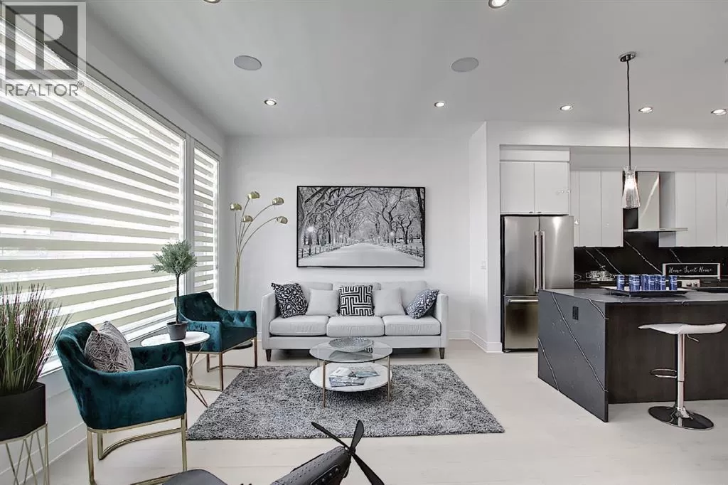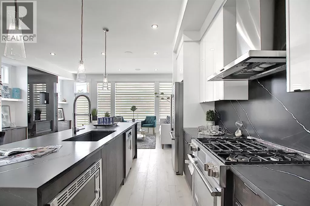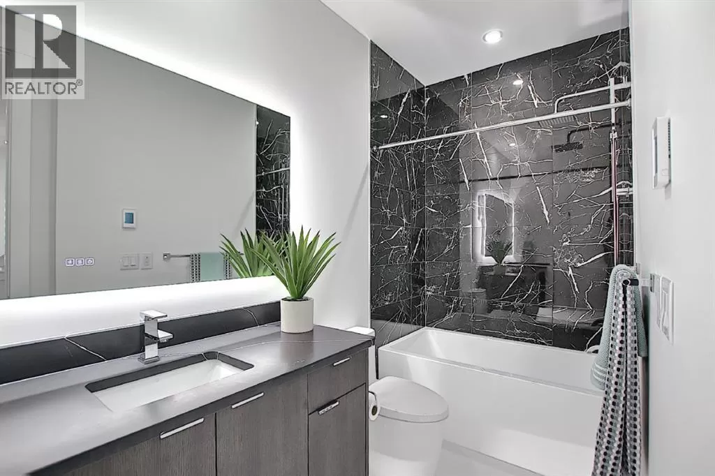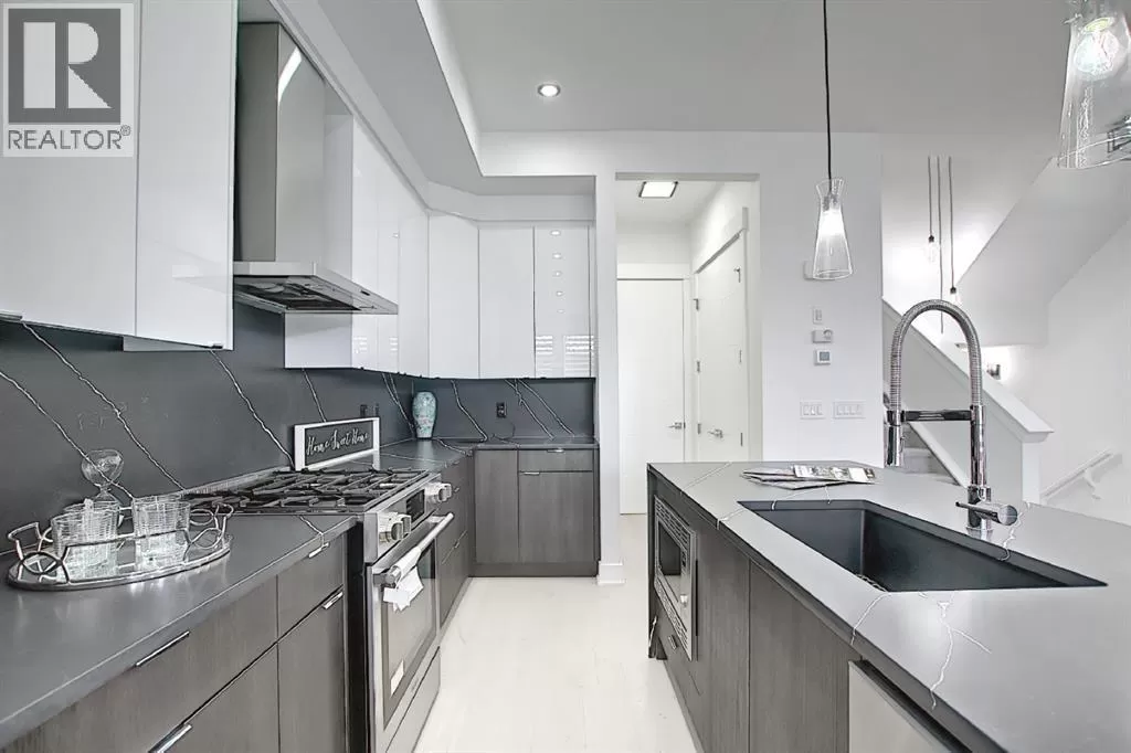 Gorgeous inner city fully finished 3-storey DREAM HOME with 2125 sqft of developed living space, VIEWS of DOWNTOWN Calgary & community, 3 large beds + 3.5 stunning baths + 3rd floor flex room. Unit is located on the back Northside of the building. M-C2 zoning perfect for a work from home or home-based business set up. Upscale urban living at an exceptional price point. Check out 3D TOUR. Impressive forward-thinking features, modern and contemporary design & stylish floorplans. 3 large decks offer either DOWNTOWN Calgary or community VIEWS. Natural light flows through this exceptionally spacious floor plan with large windows + 10-foot ceilings on main floor + 9-foot ceilings. Beautifully designed & equipped kitchen, includes a European Blomberg appliance package, PREMIUM quartz counter-tops & backsplash, giant island w/stunning double waterfall quartz feature for guests to gather is perfectly located adjacent to the large living & dining rooms. The focal point of the living room is a simply stunning gas fireplace with a one piece marble tile surround. A wall of windows leads to a giant deck complete w/gas BBQ hookup. DOUBLE master bedrooms. The 1st master bedroom on the 2nd floor features a large walk-in closet, luxurious spa inspired ensuite, a jetted tub, shower, floating double sink vanity & quartz countertops. Bedroom #2 is a generous size, a full luxury bathroom + a handy 2nd floor laundry room equipped with a front-load washer & dryer, quartz countertops, cabinets & a sink. The 3rd floor offers a 2nd master bedroom featuring DOWNTOWN VIEWS from the deck, walk-in closet, a luxurious spa inspired ensuite, freestanding soaker tub, unforgettable custom shower, a floating vanity with double sinks & quartz countertops + a flex room, equipped with a wet bar and private deck with beautiful community views. Luxurious features throughout include a blind package, engineered oak hardwood, solid 8 ft doors throughout, smooth painted level 5 ceilings, designer LED lighting p ackage. full height built-in custom cabinetry, built-in Bluetooth speaker system. Bathrooms w/heated tiled floors + sound-enabled backlit LED mirrors + under vanity lighting. Energy-efficient and well-insulated, a high-efficiency furnace, tankless hot water on demand system, humidifier and central A/C. Roughed in for a central vacuum system & water softener. Lower level offers a mudroom, access to a single attached garage + storage/ mechanical room. Additional driveway parking. Roughed in electric vehicle charging station in the garage. No permits required for additional street parking. Exceptional curb appeal with high-end modern exterior finishes & architectural design. Centrally located inner-city community on the Westside. Minutes drive to Downtown, steps to Westbrook mall, Library/LRT Station, golf, schools, shops, dining, aquatic centre, bike & transit routes. Balance of 10 year Progressive New Home Warranty. Professionally managed. LOW condo fee. Owner pay their own utilities. NO grass to cut (id:27476)