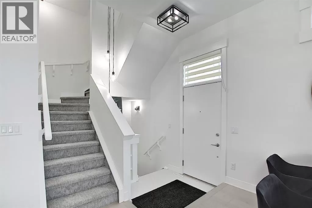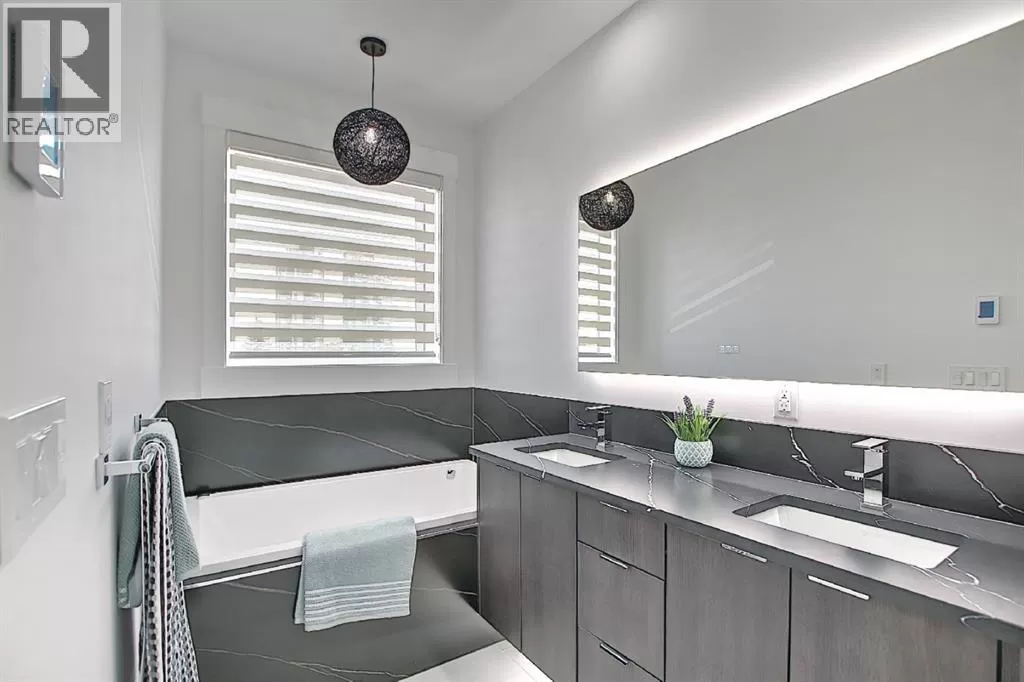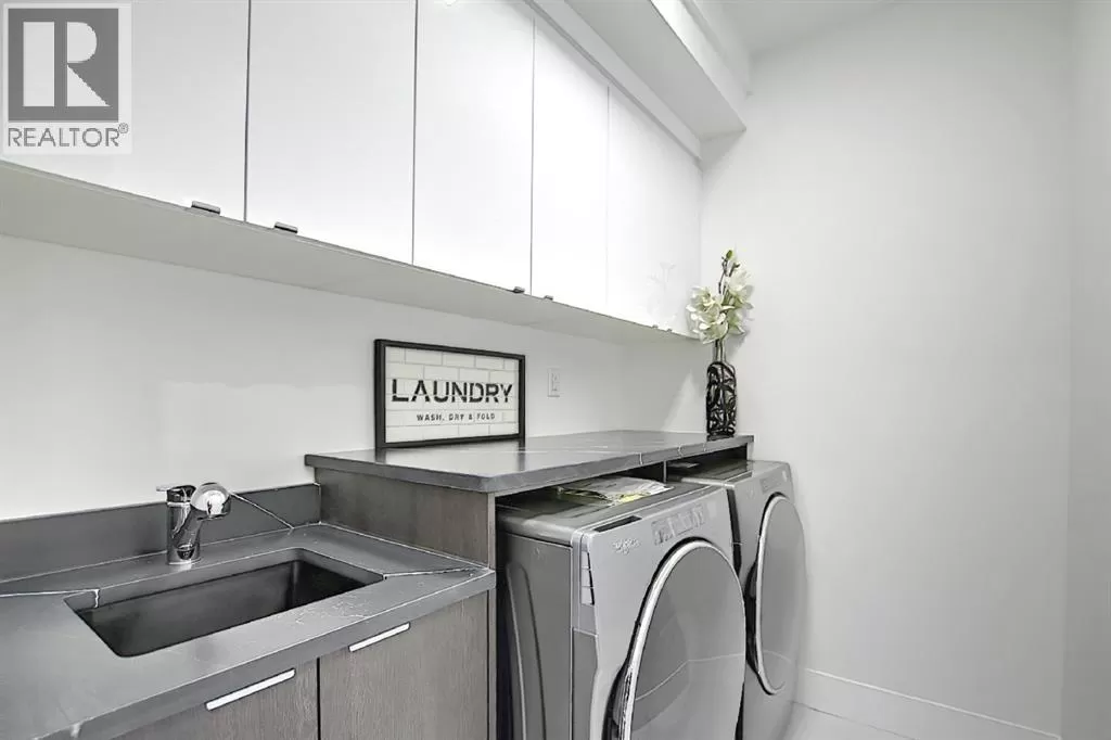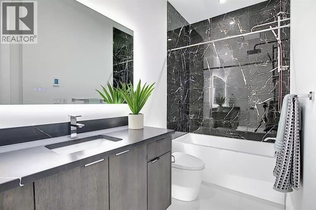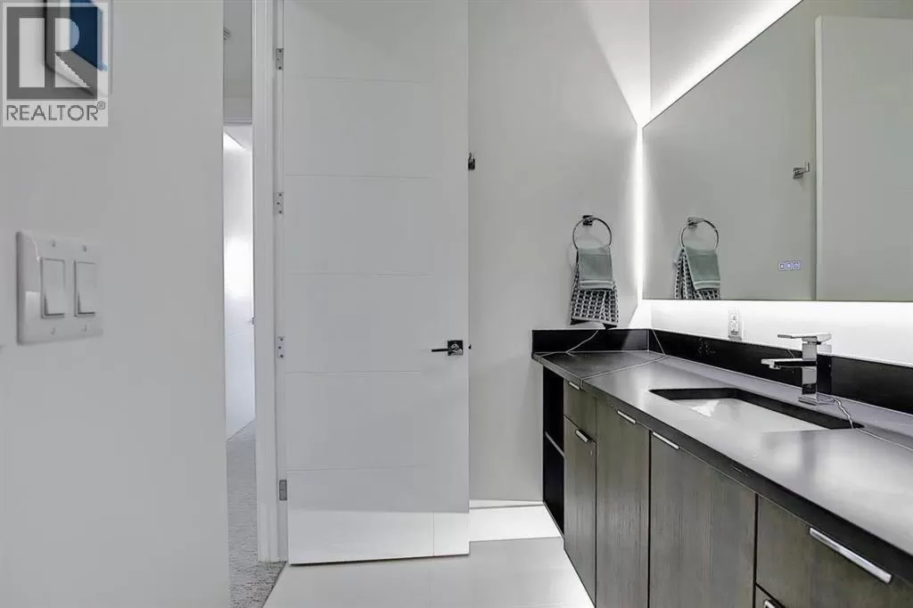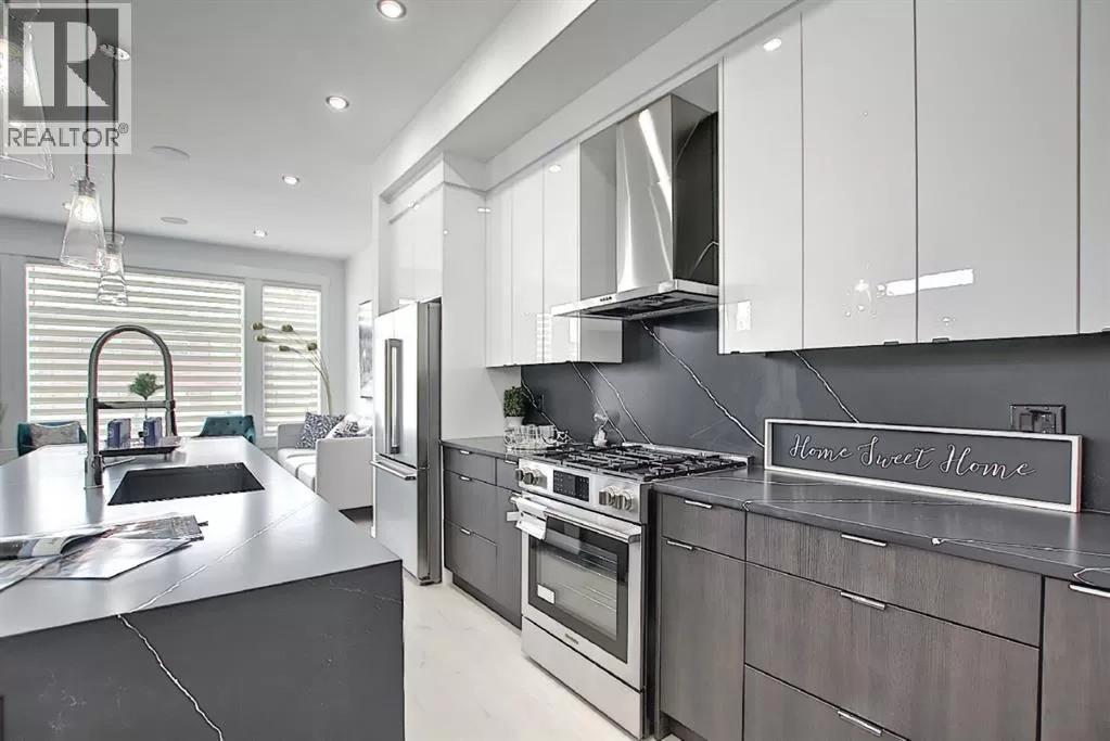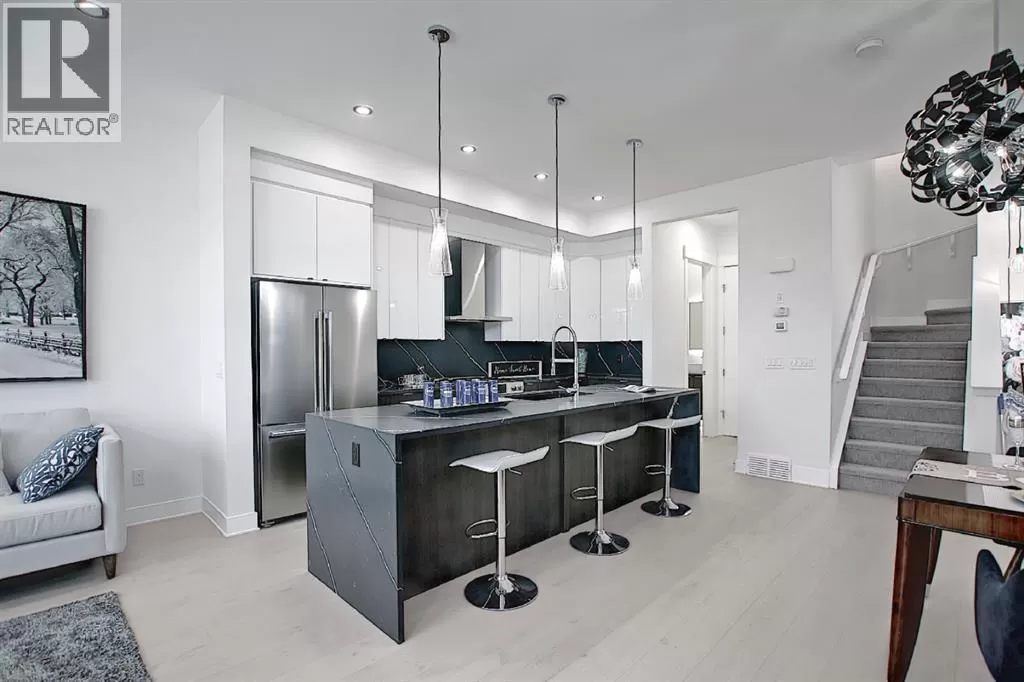 Gorgeous inner city fully finished 3-storey DREAM HOME with 2125 sqft of developed living space, VIEWS of DOWNTOWN Calgary & community, 3 large beds + 3.5 stunning baths + 3rd floor flex room. Unit is located on the back Northside of the building. M-C2 zoning perfect for a work from home or home-based business set up. Upscale urban living at an exceptional price point. Check out 3D TOUR. Impressive forward-thinking features, modern and contemporary design & stylish floorplans. 3 large decks offer either DOWNTOWN Calgary or community VIEWS. Natural light flows through this exceptionally spacious floor plan with large windows + 10-foot ceilings on main floor + 9-foot ceilings. Beautifully designed & equipped kitchen, includes a European Blomberg appliance package, PREMIUM quartz counter-tops & backsplash, giant island w/stunning double waterfall quartz feature for guests to gather is perfectly located adjacent to the large living & dining rooms. The focal point of the living room is a simply stunning gas fireplace with a one piece marble tile surround. A wall of windows leads to a giant deck complete w/gas BBQ hookup. DOUBLE master bedrooms. The 1st master bedroom on the 2nd floor features a large walk-in closet, luxurious spa inspired ensuite, a jetted tub, shower, floating double sink vanity & quartz countertops. Bedroom #2 is a generous size, a full luxury bathroom + a handy 2nd floor laundry room equipped with a front-load washer & dryer, quartz countertops, cabinets & a sink. The 3rd floor offers a 2nd master bedroom featuring DOWNTOWN VIEWS from the deck, walk-in closet, a luxurious spa inspired ensuite, freestanding soaker tub, unforgettable custom shower, a floating vanity with double sinks & quartz countertops + a flex room, equipped with a wet bar and private deck with beautiful community views. Luxurious features throughout include a blind package, engineered oak hardwood, solid 8 ft doors throughout, smooth painted level 5 ceilings, designer LED lighting p ackage. full height built-in custom cabinetry, built-in Bluetooth speaker system. Bathrooms w/heated tiled floors + sound-enabled backlit LED mirrors + under vanity lighting. Energy-efficient and well-insulated, a high-efficiency furnace, tankless hot water on demand system, humidifier and central A/C. Roughed in for a central vacuum system & water softener. Lower level offers a mudroom, access to a single attached garage + storage/ mechanical room. Additional driveway parking. Roughed in electric vehicle charging station in the garage. No permits required for additional street parking. Exceptional curb appeal with high-end modern exterior finishes & architectural design. Centrally located inner-city community on the Westside. Minutes drive to Downtown, steps to Westbrook mall, Library/LRT Station, golf, schools, shops, dining, aquatic centre, bike & transit routes. Balance of 10 year Progressive New Home Warranty. Professionally managed. LOW condo fee. Owner pay their own utilities. NO grass to cut (id:27476)