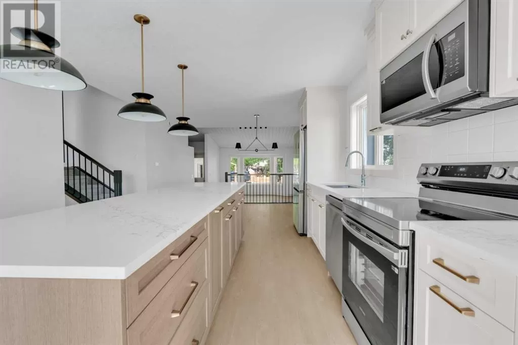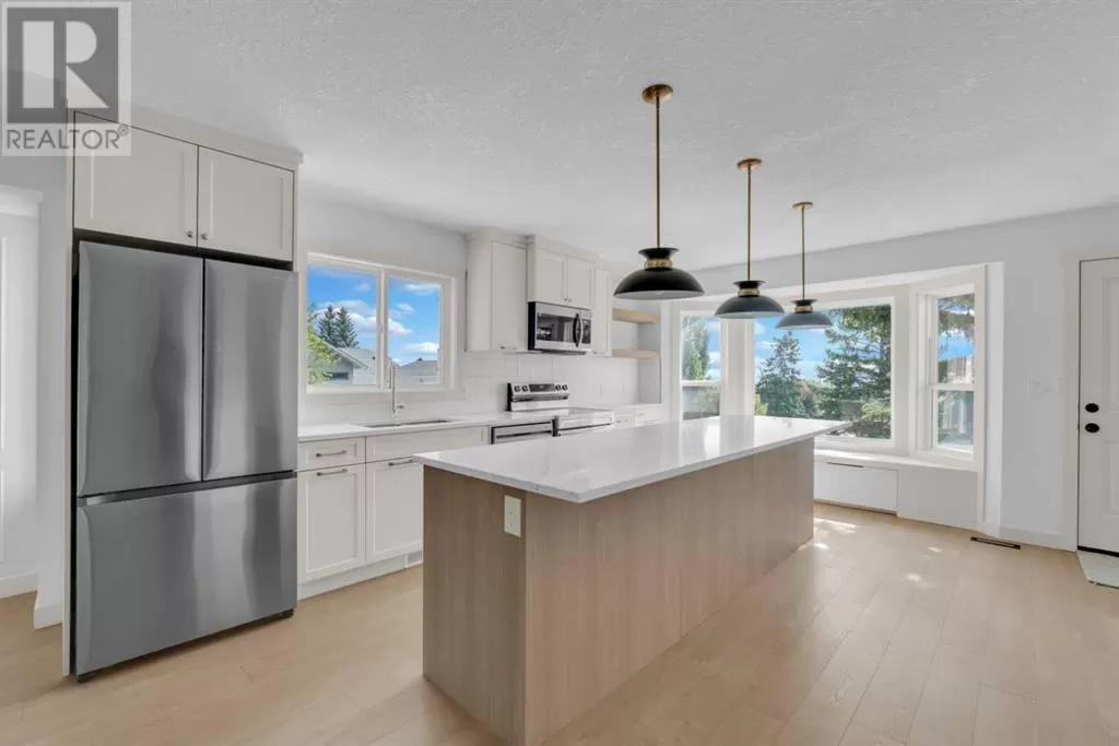 Prepare to be captivated by this fully gutted 4-level split, offering a perfect blend of modern luxury and functional family living. Nestled in a friendly, sought-after neighborhood, this home is just a short distance from shopping, sprawling parks, and schools.Step inside to discover a bright and airy open-concept main level, where natural light cascades through the newer windows. The brand-new kitchen boasts quartz countertops, brand new stainless steel appliances, a large island with seating, and custom cabinetry. It seamlessly flows into the spacious living and dining areas, creating an ideal space for entertaining family and friends.Ascend a short flight of stairs to the private upper level, where you'll find a serene primary suite complete with a luxurious ensuite bathroom and a walk-in closet. An additional bedroom and associated updated full bathroom complete this level, offering comfortable accommodations for the entire family.The lower level provides a cozy and versatile family room with a new fireplace and a separate custom laundry room with new machines. This level also features a third bedroom and another beautifully finished bathroom. The finished basement offers even more flexible living space, perfect for a home gym, media room, or hobby space, along with ample storage.Outside, enjoy the private, fully-fenced backyard with a new patio, offering the perfect setting for summer barbecues and outdoor relaxation. The attached double garage provides convenience and additional storage.All plumbing, mechanical and electrical systems have been updated to meet current building codes. The roof was also replaced this year and the house is full of custom finishes throughout.This home's location is second to none. Enjoy the convenience of being within walking distance to Nose Hill park and a short drive to major shopping centres, lush community parks with playgrounds and walking trails, and schools. Commuting is a breeze with easy access to maj or transportation routes that are only 15 minutes to downtown via 14th street.Don't miss your opportunity to own this exceptional, never lived in and completely updated home. (id:27476)