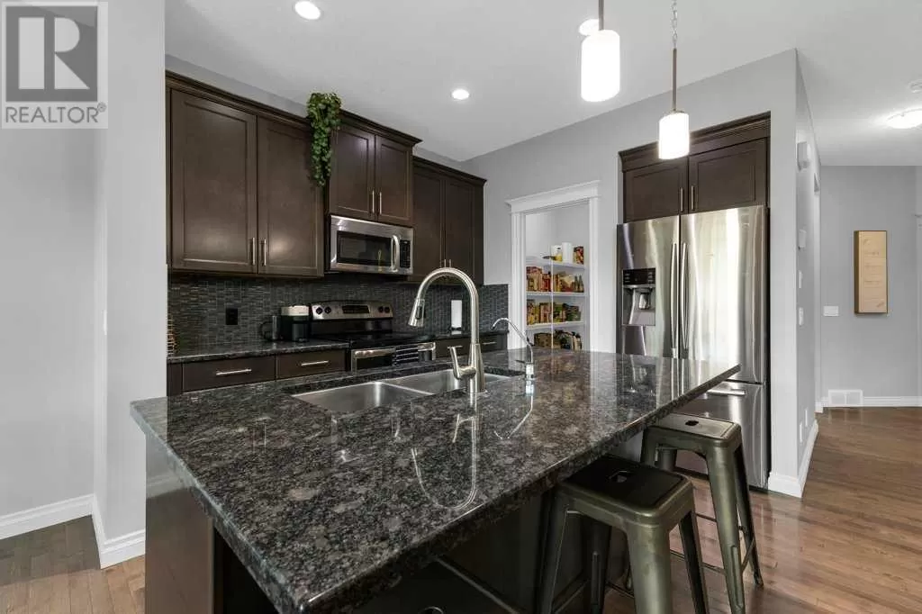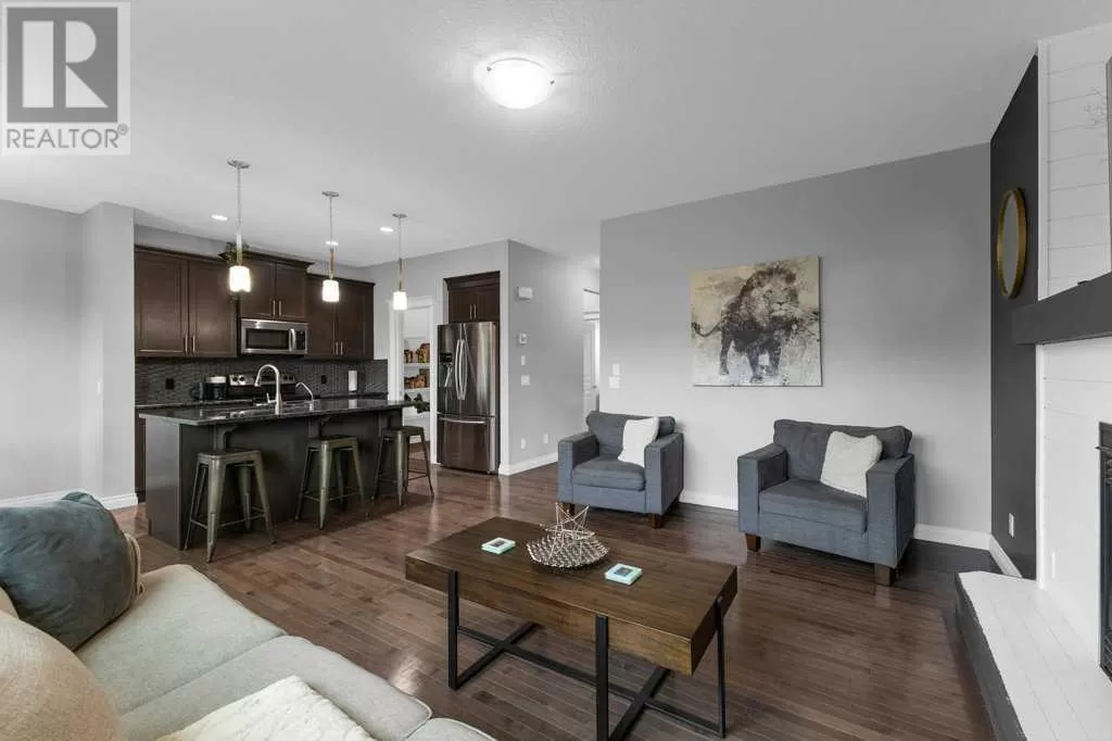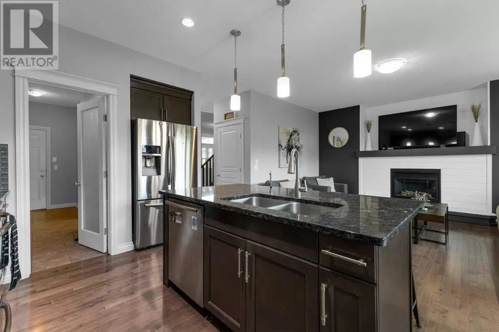 Cozy family home in Evanston offers over 1900 sf of beautifully designed living space. The open concept main floor features a bright family room with gas fireplace, and dining nook that flow into a stylish island kitchen with granite countertops, a large walk-through pantry that connects to a spacious mudroom off the double attached garage. Great deck and backyard for entertaining, and walks along the greenspace. Upstairs, you'll find three spacious bedrooms, including a generous primary suite with a four-piece ensuite and a large walk-in closet. A spacious bonus room with bright windows for family time and movie nights. The upper floor also includes a convenient laundry room. With hardwood flooring, tile in high-traffic areas, 9â ceilings, and knockdown ceiling texture throughout the main level, this home blends comfort, style, and functionality. Located in northwest Calgaryâs most vibrant communities with scenic pathways, parks, playgrounds, and quick access to major roads, shopping and amenities. (id:27476)