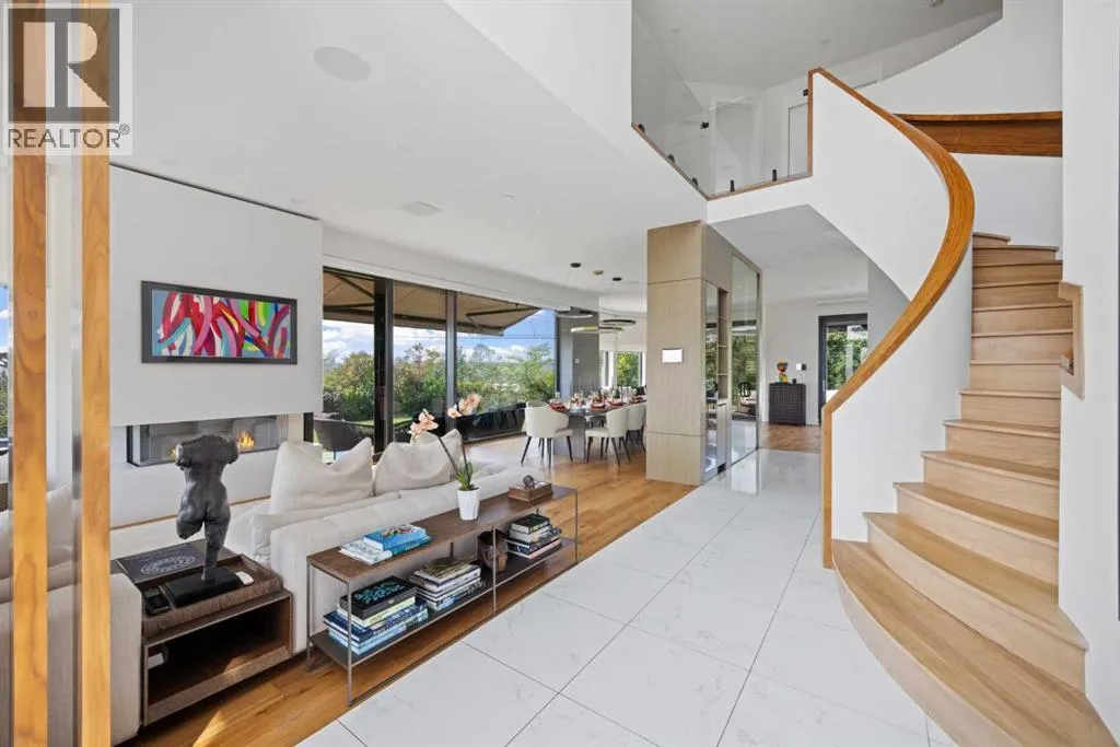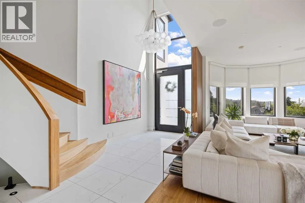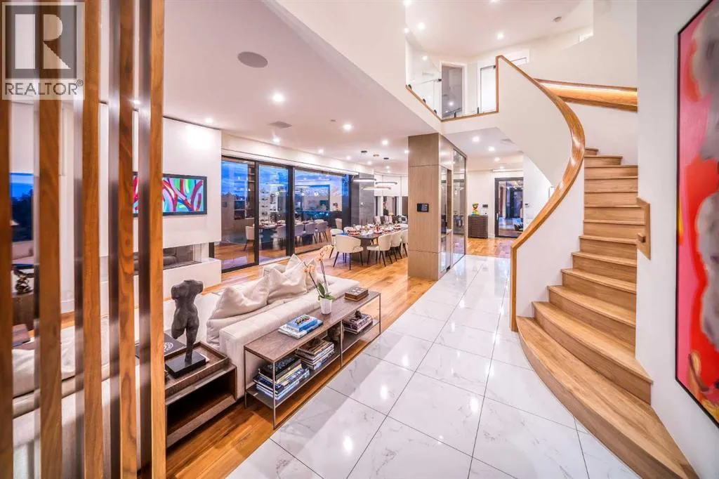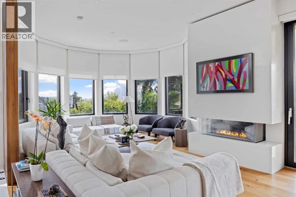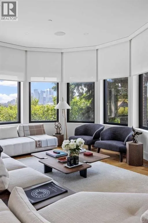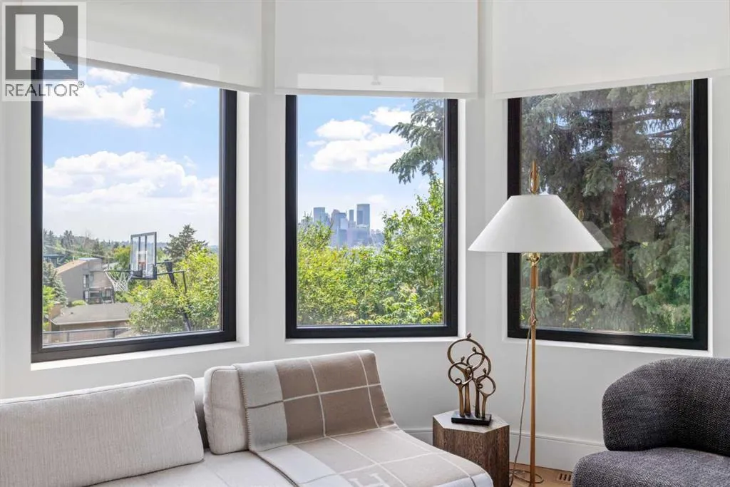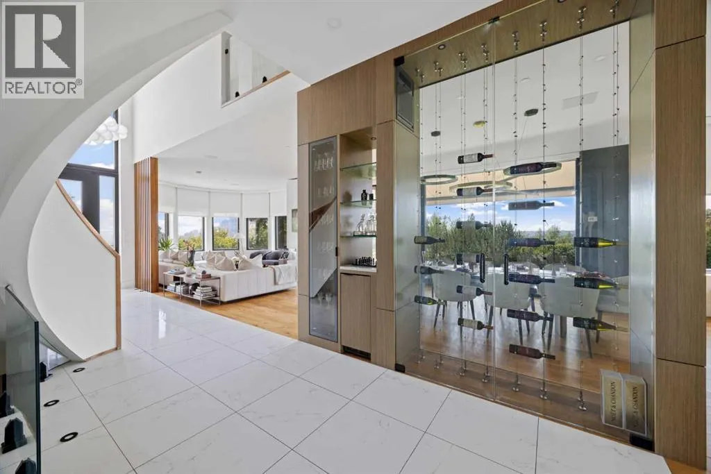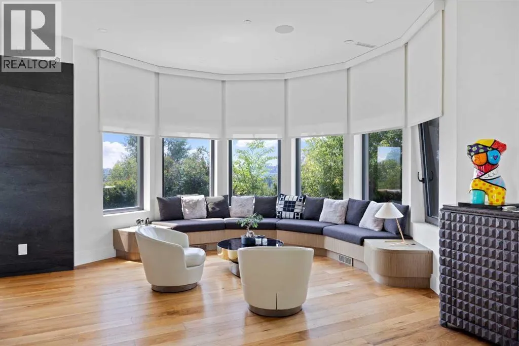 OPEN HOUSE October 25th 2-4PM. The Glasshaus is a REMARKABLE offering in Calgaryâs coveted Briar Hill. This lock-and-leave luxury residence is perched on an ULTRA-EXCLUSIVE ridge lot surrounded by PARKLAND on three sides, offering unmatched PRIVACY and PANORAMIC VIEWS from east to west. A true retreat in the heart of the city, The Glasshaus blends iconic architecture with a low-maintenance lifestyle â perfect for those seeking sophisticated living without compromise. REIMAGINED FROM THE STUDS with nearly $3 million in upgrades â including new electrical, plumbing, HVAC, triple-pane windows, and custom structural reengineering â The Glasshaus is a seamless expression of comfort, functional beauty, refined living, and purposeful minimalism. Smooth stucco, brick detailing, and composite wood-look siding wrap the exterior in a sophisticated, warm-modern finish. Gaulhofer triple-pane windows from Austria, paired with a solar film, provide exceptional energy efficiency, sound attenuation, and soft natural light throughout the day. The entry opens to a 19-foot foyer anchored by the sculptural Apparatus Studio "Cloud" chandelier, floating beneath an architectural window and setting the tone for the artful design within. Airy living spaces flow around a dramatic, climate-controlled glass wine cellar â the centerpiece of the home. The Italian Pedini kitchen â with integrated Miele appliances, a curved quartz island, Matthew McCormick pendants, and handle-free cabinets â is a functional space for those with a passion for culinary arts. Finishes include Spanish hardwood flooring, Italian tile, and New Zealand wool carpet. A Control4 system manages lighting, blinds, audio, video, temperature, intercom, and security. Bowers & Wilkins speakers deliver rich sound throughout. The main level also includes a soundproof office with custom millwork and leather upholstery, a designer powder room, and laundry with quartz surfaces and smart storage. The architecturally striking curved stai rwell leads to the upper level where FOUR IMMENSE bedrooms EACH INCLUDE AN ENSUITE, spacious walk-in closets, motorized blackout blinds, and incredible sunrise and sunset views. The primary suite features a downtown-facing, custom-designed bed wall, a double-sided fireplace, a built-in wardrobe, and a spa-inspired ensuite with radiant quartz counters, âgoldâ European fixtures, a freestanding tub, a frameless glass shower, and a Japanese-style smart toilet. The lower level hosts a second wine cellar, a wet bar, a state-of-the-art home theatre system, a glass-enclosed gym with cork flooring, a steam spa bathroom, and an open recreation space. Advanced Radon mitigation, water filtration, UV air purification, and a whole-home fire suppression system add peace of mind. Exterior upgrades include full concrete work, electric awnings, and a multi-sport court. The heated 3-vehicle garage offers lift potential. A one-of-a-kind residence, redefined for effortless living. Schedule your private showing today. (id:27476)