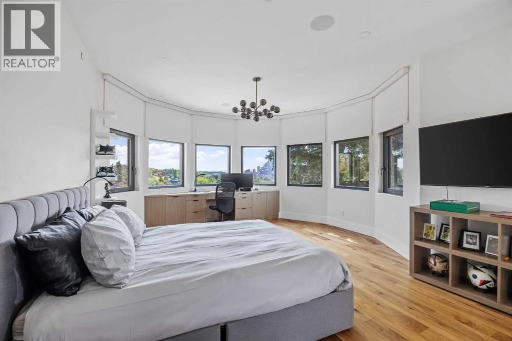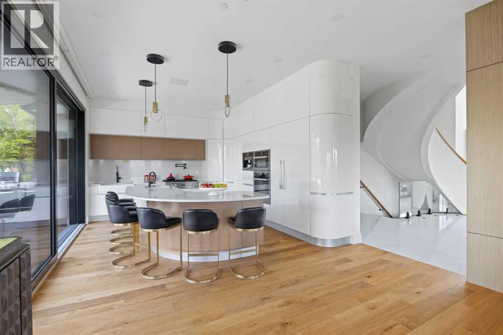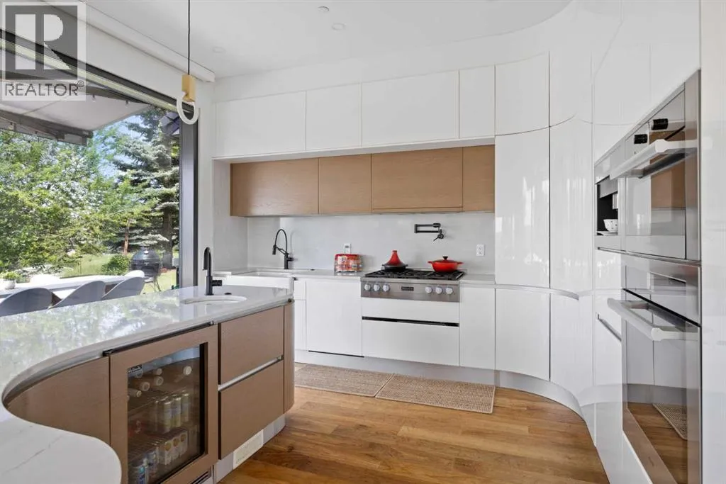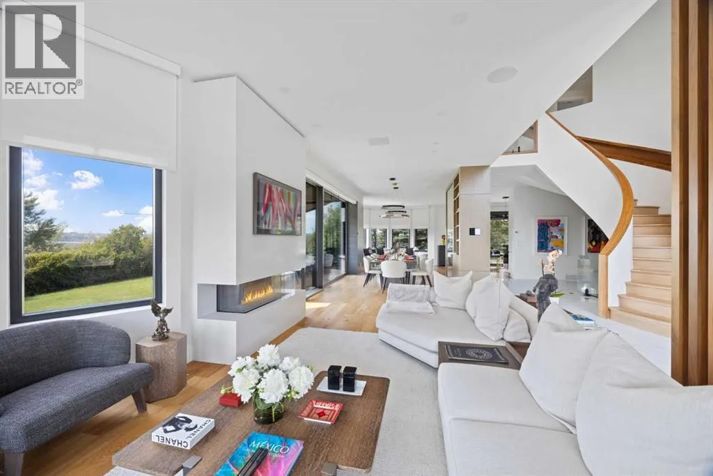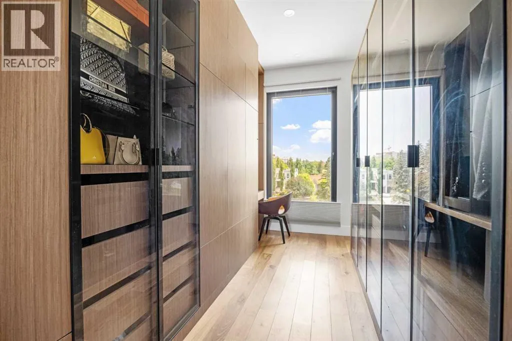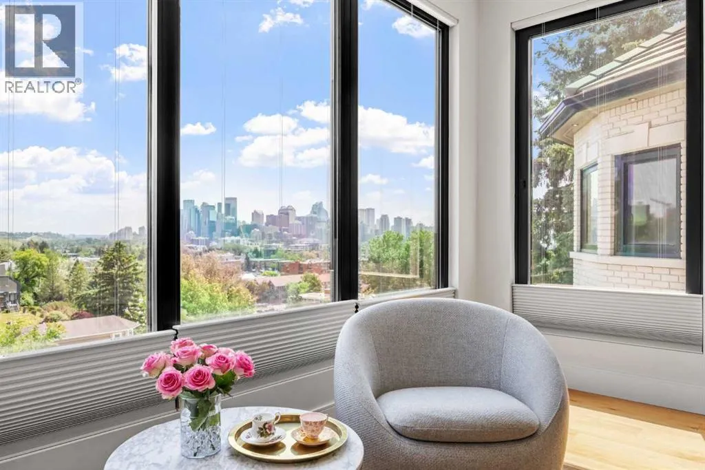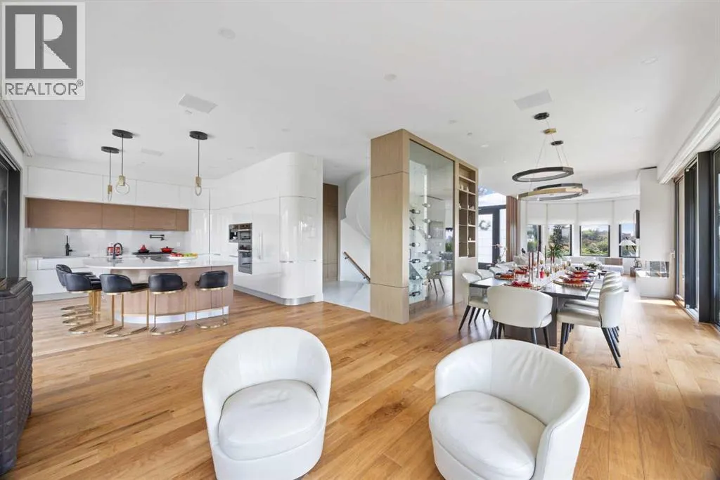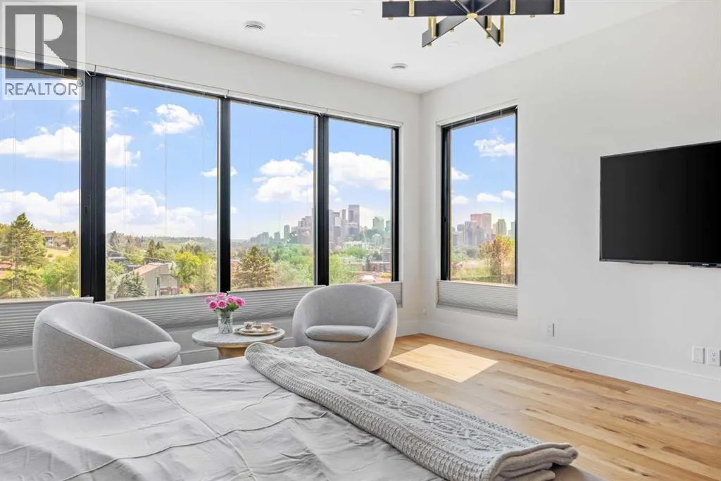 OPEN HOUSE October 25th 2-4PM. The Glasshaus is a REMARKABLE offering in Calgaryâs coveted Briar Hill. This lock-and-leave luxury residence is perched on an ULTRA-EXCLUSIVE ridge lot surrounded by PARKLAND on three sides, offering unmatched PRIVACY and PANORAMIC VIEWS from east to west. A true retreat in the heart of the city, The Glasshaus blends iconic architecture with a low-maintenance lifestyle â perfect for those seeking sophisticated living without compromise. REIMAGINED FROM THE STUDS with nearly $3 million in upgrades â including new electrical, plumbing, HVAC, triple-pane windows, and custom structural reengineering â The Glasshaus is a seamless expression of comfort, functional beauty, refined living, and purposeful minimalism. Smooth stucco, brick detailing, and composite wood-look siding wrap the exterior in a sophisticated, warm-modern finish. Gaulhofer triple-pane windows from Austria, paired with a solar film, provide exceptional energy efficiency, sound attenuation, and soft natural light throughout the day. The entry opens to a 19-foot foyer anchored by the sculptural Apparatus Studio "Cloud" chandelier, floating beneath an architectural window and setting the tone for the artful design within. Airy living spaces flow around a dramatic, climate-controlled glass wine cellar â the centerpiece of the home. The Italian Pedini kitchen â with integrated Miele appliances, a curved quartz island, Matthew McCormick pendants, and handle-free cabinets â is a functional space for those with a passion for culinary arts. Finishes include Spanish hardwood flooring, Italian tile, and New Zealand wool carpet. A Control4 system manages lighting, blinds, audio, video, temperature, intercom, and security. Bowers & Wilkins speakers deliver rich sound throughout. The main level also includes a soundproof office with custom millwork and leather upholstery, a designer powder room, and laundry with quartz surfaces and smart storage. The architecturally striking curved stai rwell leads to the upper level where FOUR IMMENSE bedrooms EACH INCLUDE AN ENSUITE, spacious walk-in closets, motorized blackout blinds, and incredible sunrise and sunset views. The primary suite features a downtown-facing, custom-designed bed wall, a double-sided fireplace, a built-in wardrobe, and a spa-inspired ensuite with radiant quartz counters, âgoldâ European fixtures, a freestanding tub, a frameless glass shower, and a Japanese-style smart toilet. The lower level hosts a second wine cellar, a wet bar, a state-of-the-art home theatre system, a glass-enclosed gym with cork flooring, a steam spa bathroom, and an open recreation space. Advanced Radon mitigation, water filtration, UV air purification, and a whole-home fire suppression system add peace of mind. Exterior upgrades include full concrete work, electric awnings, and a multi-sport court. The heated 3-vehicle garage offers lift potential. A one-of-a-kind residence, redefined for effortless living. Schedule your private showing today. (id:27476)