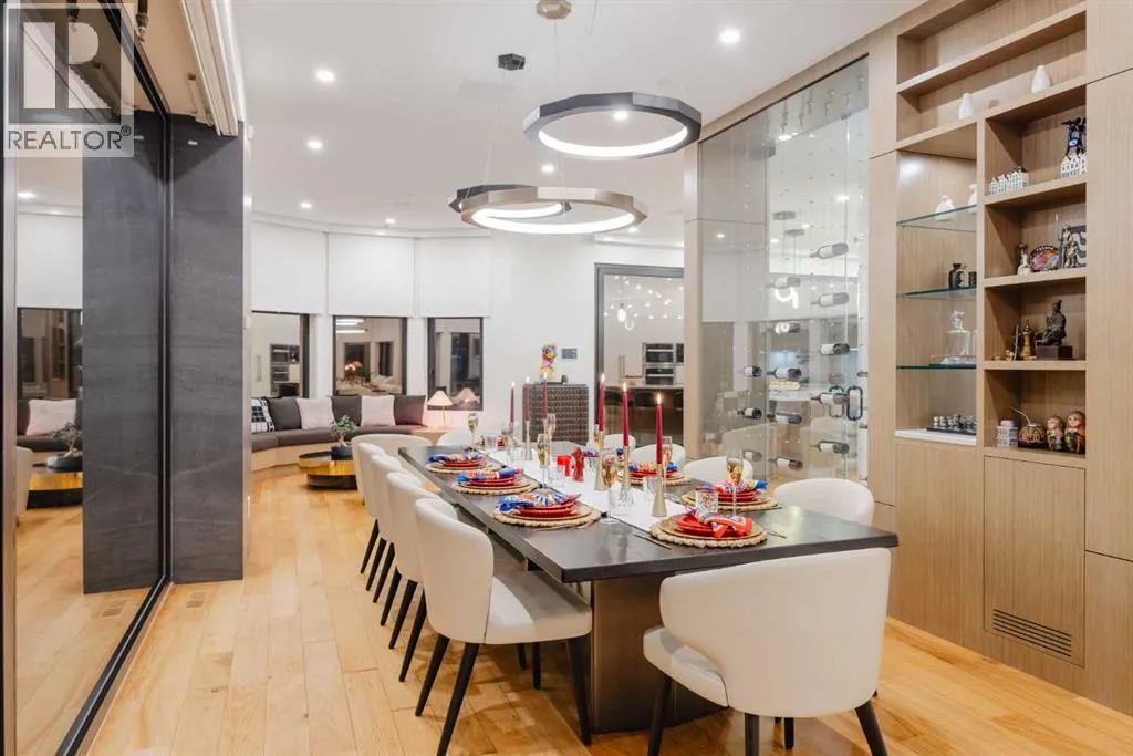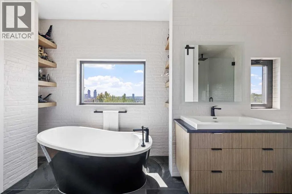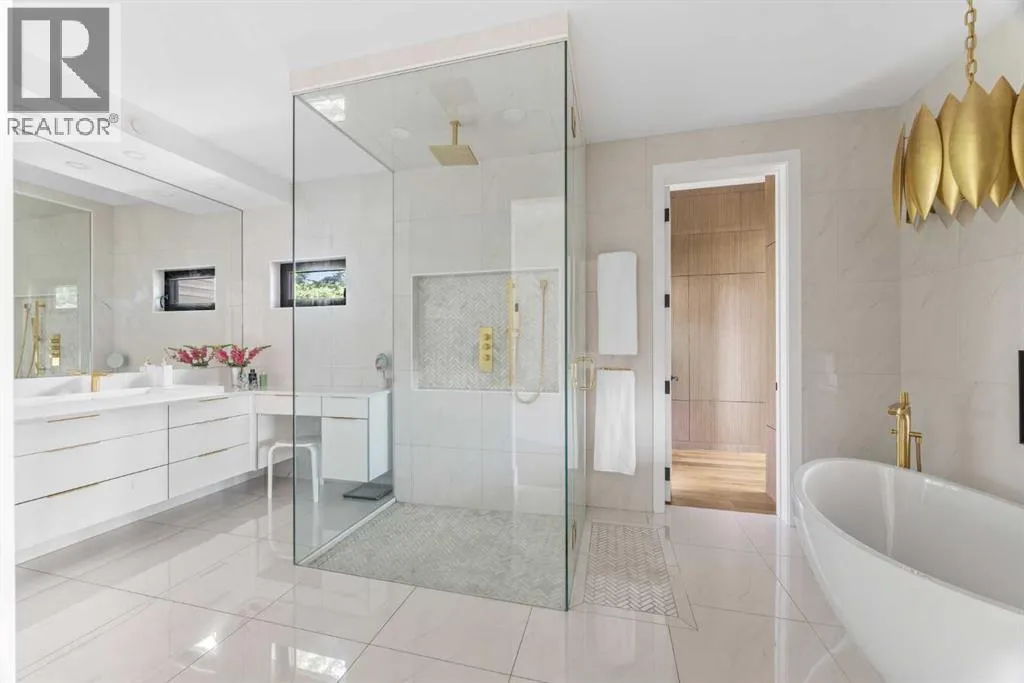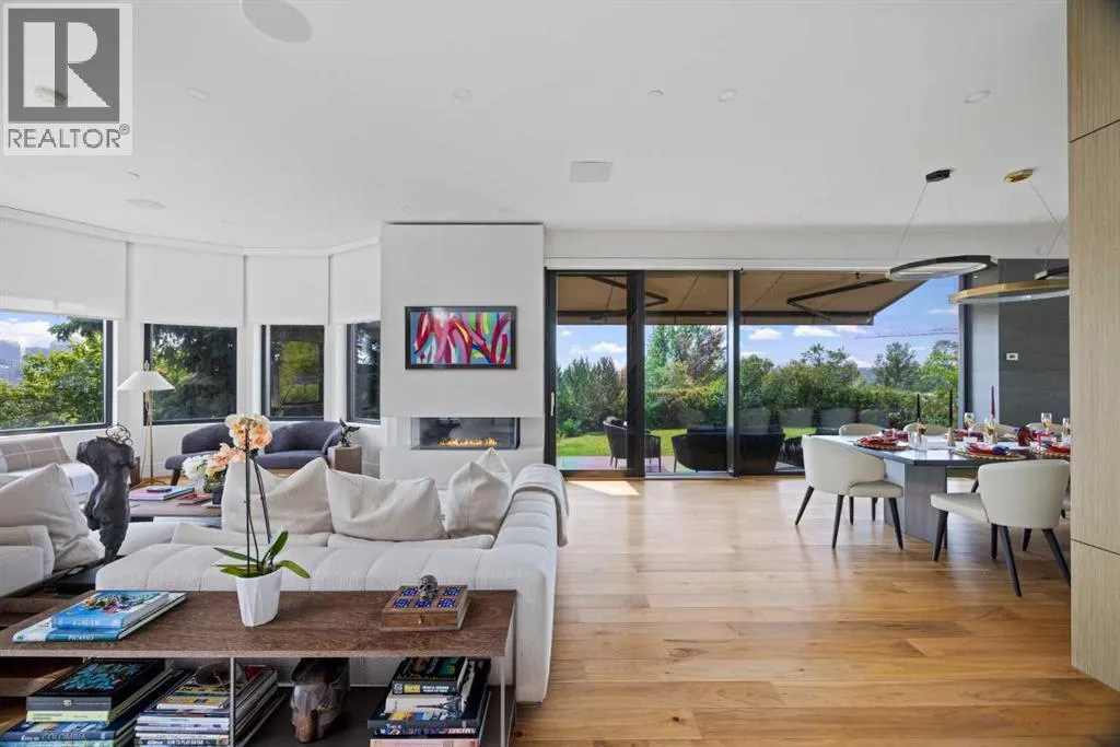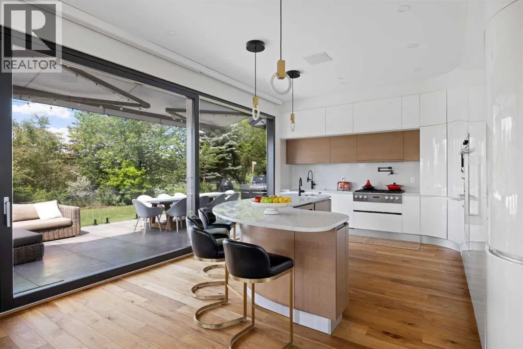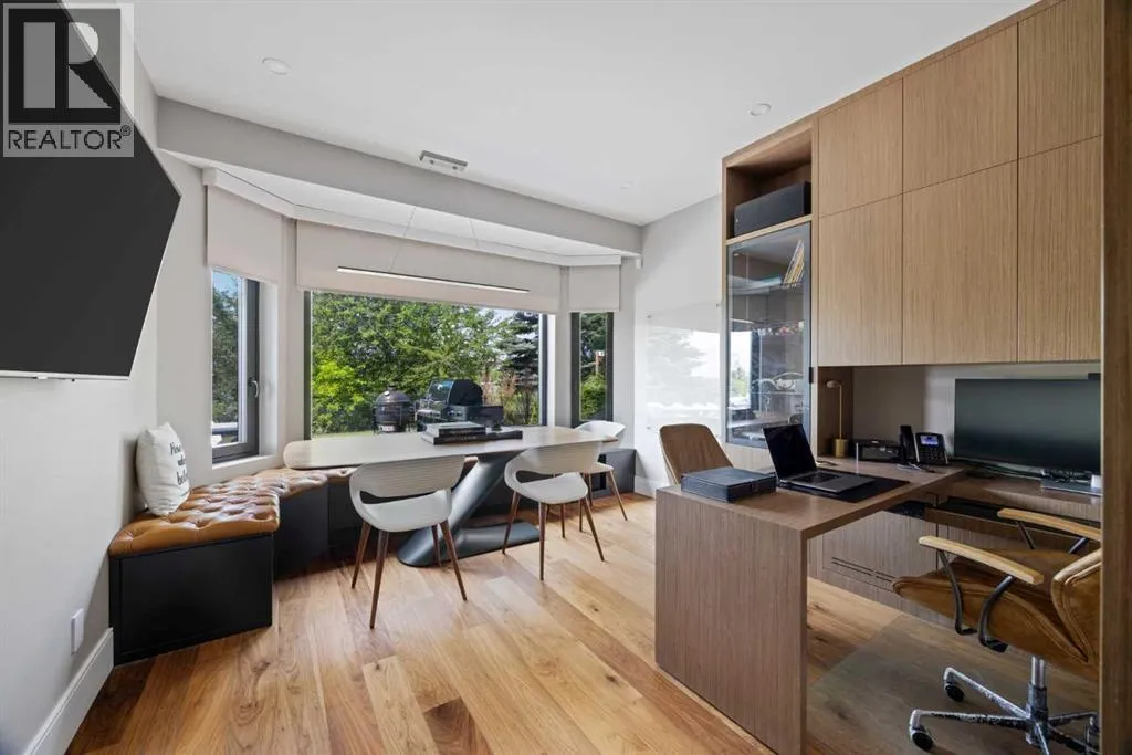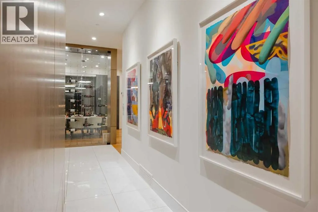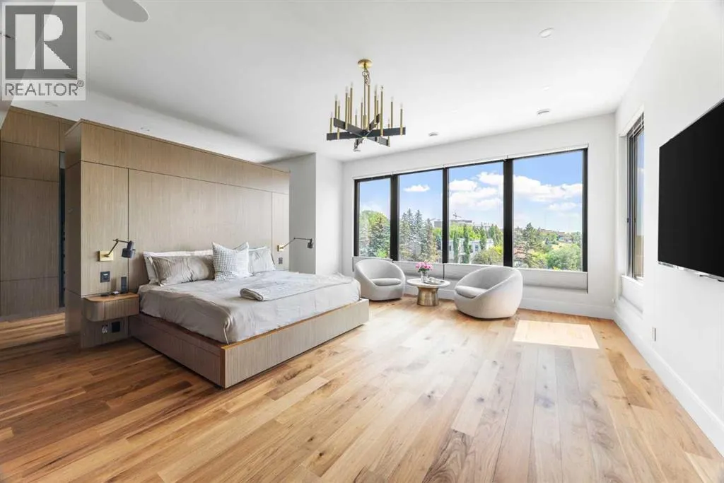 OPEN HOUSE October 25th 2-4PM. The Glasshaus is a REMARKABLE offering in Calgaryâs coveted Briar Hill. This lock-and-leave luxury residence is perched on an ULTRA-EXCLUSIVE ridge lot surrounded by PARKLAND on three sides, offering unmatched PRIVACY and PANORAMIC VIEWS from east to west. A true retreat in the heart of the city, The Glasshaus blends iconic architecture with a low-maintenance lifestyle â perfect for those seeking sophisticated living without compromise. REIMAGINED FROM THE STUDS with nearly $3 million in upgrades â including new electrical, plumbing, HVAC, triple-pane windows, and custom structural reengineering â The Glasshaus is a seamless expression of comfort, functional beauty, refined living, and purposeful minimalism. Smooth stucco, brick detailing, and composite wood-look siding wrap the exterior in a sophisticated, warm-modern finish. Gaulhofer triple-pane windows from Austria, paired with a solar film, provide exceptional energy efficiency, sound attenuation, and soft natural light throughout the day. The entry opens to a 19-foot foyer anchored by the sculptural Apparatus Studio "Cloud" chandelier, floating beneath an architectural window and setting the tone for the artful design within. Airy living spaces flow around a dramatic, climate-controlled glass wine cellar â the centerpiece of the home. The Italian Pedini kitchen â with integrated Miele appliances, a curved quartz island, Matthew McCormick pendants, and handle-free cabinets â is a functional space for those with a passion for culinary arts. Finishes include Spanish hardwood flooring, Italian tile, and New Zealand wool carpet. A Control4 system manages lighting, blinds, audio, video, temperature, intercom, and security. Bowers & Wilkins speakers deliver rich sound throughout. The main level also includes a soundproof office with custom millwork and leather upholstery, a designer powder room, and laundry with quartz surfaces and smart storage. The architecturally striking curved stai rwell leads to the upper level where FOUR IMMENSE bedrooms EACH INCLUDE AN ENSUITE, spacious walk-in closets, motorized blackout blinds, and incredible sunrise and sunset views. The primary suite features a downtown-facing, custom-designed bed wall, a double-sided fireplace, a built-in wardrobe, and a spa-inspired ensuite with radiant quartz counters, âgoldâ European fixtures, a freestanding tub, a frameless glass shower, and a Japanese-style smart toilet. The lower level hosts a second wine cellar, a wet bar, a state-of-the-art home theatre system, a glass-enclosed gym with cork flooring, a steam spa bathroom, and an open recreation space. Advanced Radon mitigation, water filtration, UV air purification, and a whole-home fire suppression system add peace of mind. Exterior upgrades include full concrete work, electric awnings, and a multi-sport court. The heated 3-vehicle garage offers lift potential. A one-of-a-kind residence, redefined for effortless living. Schedule your private showing today. (id:27476)