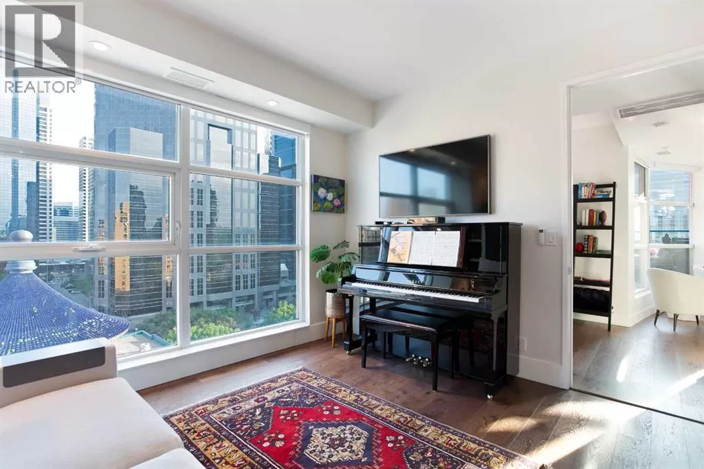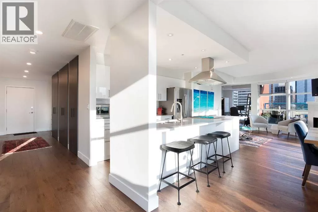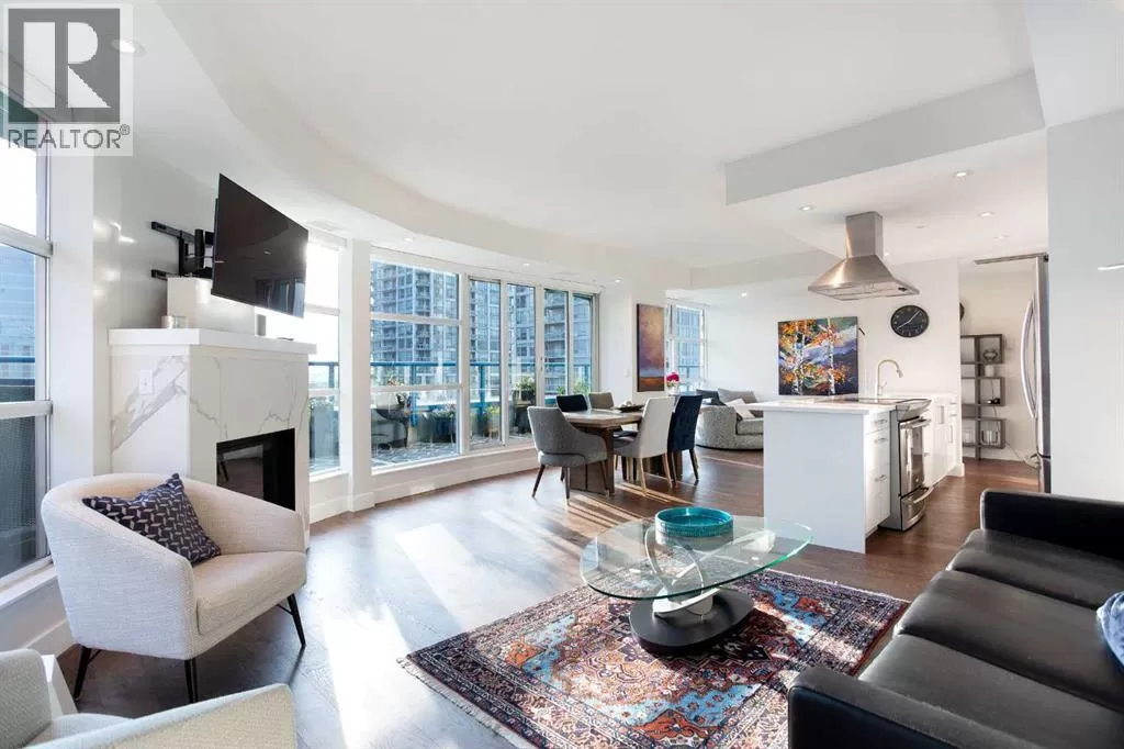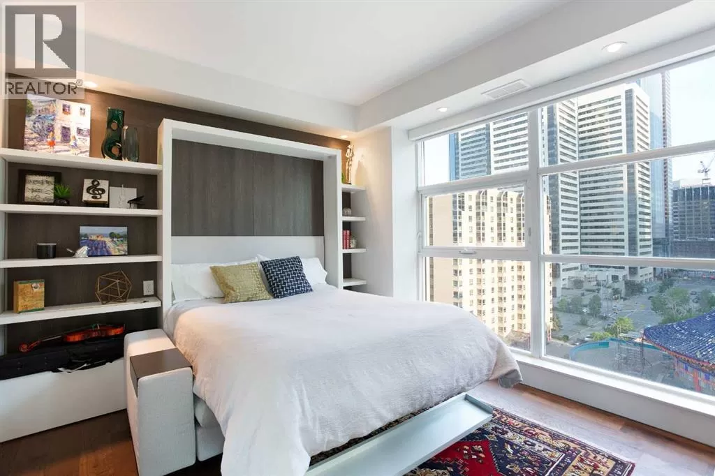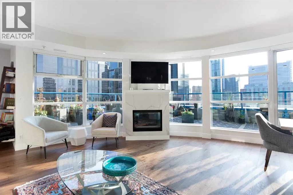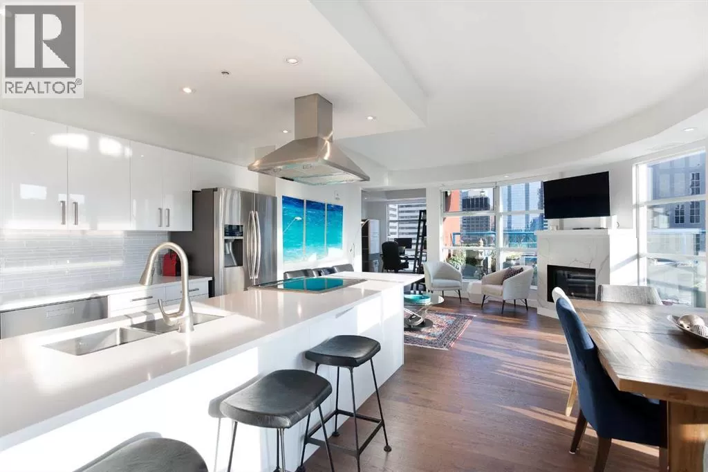 ***OPEN HOUSE - November 15, 2025 - 12:00-2:00*** - Welcome to your dream downtown retreat, just steps from the Bow River. This meticulously renovated sub-penthouse offers near 1,400 square feet of beautifully designed living space, featuring 2 bedrooms and 2 bathrooms, all tucked into one of Calgaryâs most vibrant and walkable communities.As you enter, you're welcomed by luxury hardwood flooring that flows throughout the home, creating a seamless and contemporary feel. The open concept layout is bright, thanks to the floor-to-ceiling windows that flood the space with south facing light and offer stunning panoramic city views.The chef-inspired kitchen has been completely reimagined with sleek cabinetry, quartz countertops, an induction cooktop, and a modern hood fan. Itâs perfect for everything from quick breakfasts to full dinner parties. The adjoining dining and living area is anchored by a beautiful fireplace, making it a cozy yet sophisticated space to entertain or relax.The first bedroom features floor-to-ceiling windows, a large walk-in closet, and a luxuriously renovated ensuite with dual vanities and a walk-in shower. A custom wall-mounted bed adds versatility, allowing the room to transform quickly. The second bedroom is equally flexible, offering floor-to-ceiling windows, a spacious walk-in closet, and easy access to the second fully renovated luxury bathroom, complete with high-end finishes and a stunning bathtub. You will also find a spacious laundry room with built-in, high-end cabinetry that provides extra storage and space.Step outside onto your expansive 300 square foot private terraceâwhether you're sipping your morning coffee, hosting friends, this outdoor space is a true extension of your living area that comes with stunning downtown views.Additional features include in-suite laundry, central A/C, secure underground parking, remote controlled blinds, and a full-time concierge for added peace of mind.Situated just steps from the Bow Riv er pathways, and some of Calgaryâs top restaurants, cafés, this location offers the perfect blend of nature, and convenience. Whether you're walking your dog along the river or grabbing a latte with friends, everything you need is just outside your door. (id:27476)