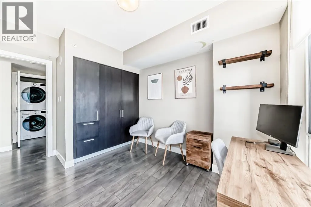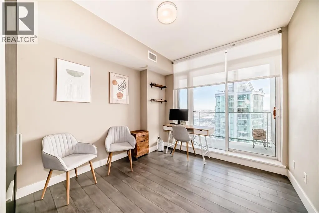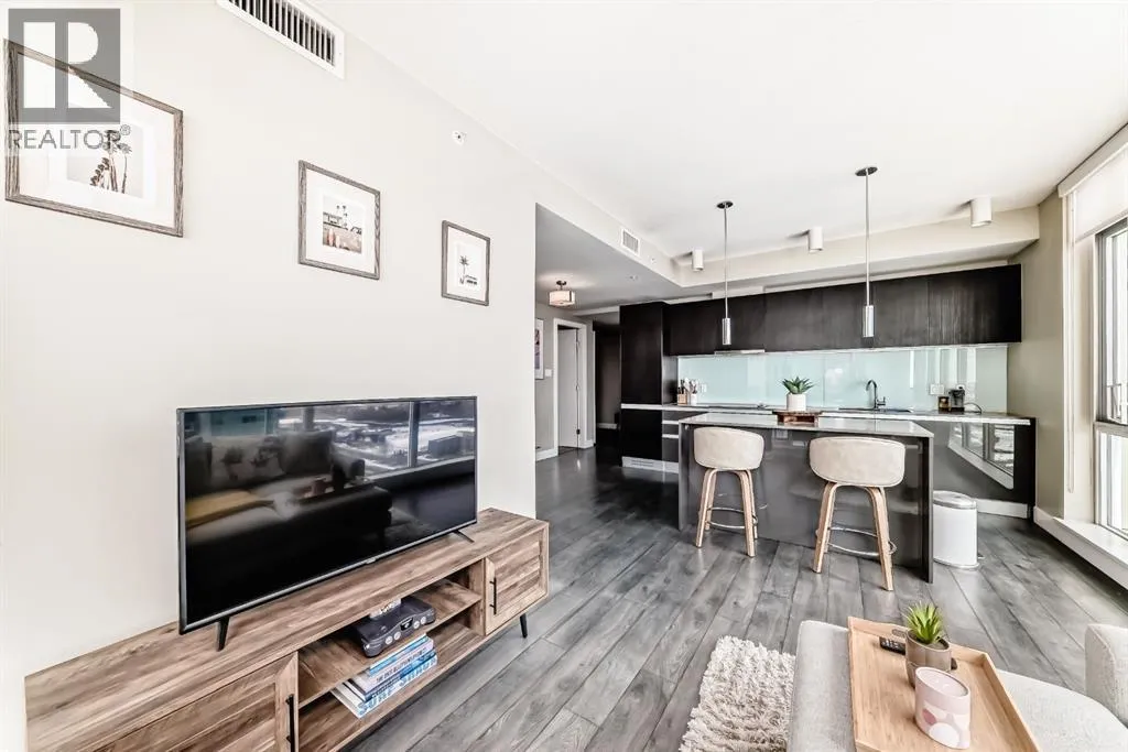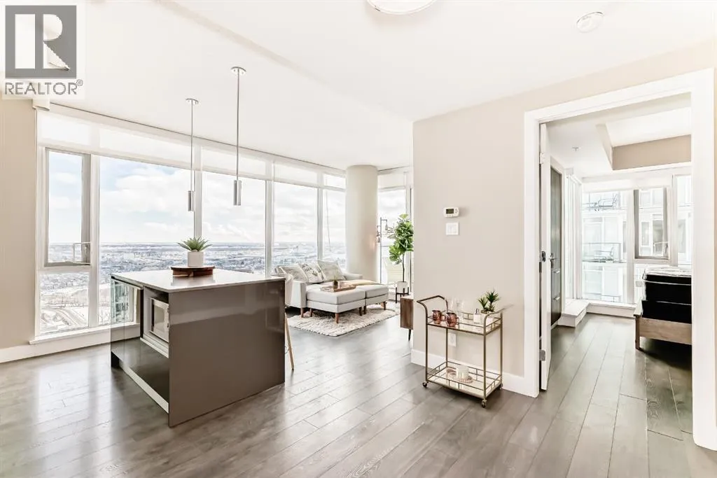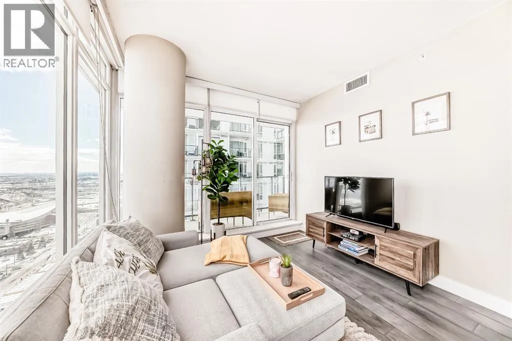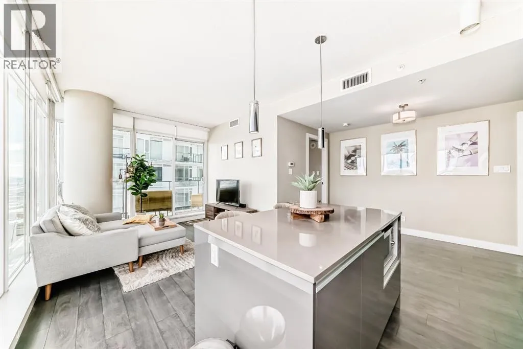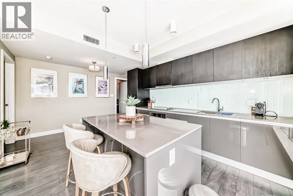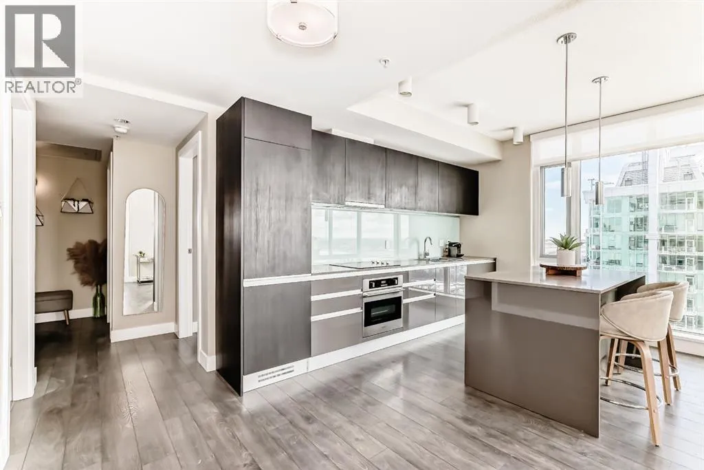 *First 3 months of condo fees covered by seller!* Welcome to this exquisite 33rd-floor corner unit with two balconies offering breathtaking views! To the east, you'll enjoy stunning river views, and to the south, you'll be treated to picturesque vistas of the Stampede Grounds, Saddledome and the new site of Scotia Place. On a clear day, you'll have Mountain views as well! This unit, located in the Guardian I, features a well-thought-out layout with two bedrooms strategically placed for privacy, along with two full bathrooms. The gourmet kitchen features a spacious island with beautiful quartz countertops and a convenient breakfast bar. High-end stainless steel appliances, sleek modern cabinetry complete the stylish aesthetic of the kitchen. Additionally, the unit is equipped with in-suite laundry for added convenience. The living room and open-concept kitchen/dining area are enveloped by floor-to-ceiling windows, immersing the space in natural light and providing captivating views of the surroundings. This unit also offers titled underground parking for your vehicle, as well as a separate storage locker to accommodate your belongings. The presence of a dedicated concierge ensures a high level of convenience and security for residents. The Guardian I provides an array of exceptional amenities for its residents to enjoy. The social lounge is perfect for entertaining guests or mingling with neighbors, while the garden terrace offers a serene outdoor space to relax and unwind. For fitness enthusiasts, the gym has impressive city views and loads of equipment, so convenient to enjoy before or after work. There is also a workshop equipped with a workbench and hand tools for those who enjoy hands-on projects and craftsmanship. Enjoy this trendy neighborhood, which offers a host of attractions just steps away from your doorstep. You'll find yourself in close proximity to the iconic Saddledome, Stampede Park, the National Music Centre, Sunterra Market, and the stunning Cent ral Library. With an abundance of entertainment options, dining experiences, and convenient amenities, this neighborhood is the epitome of vibrant and convenient urban living. (id:27476)