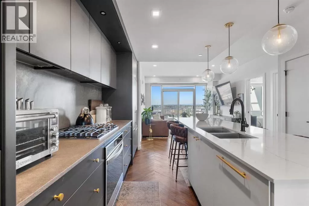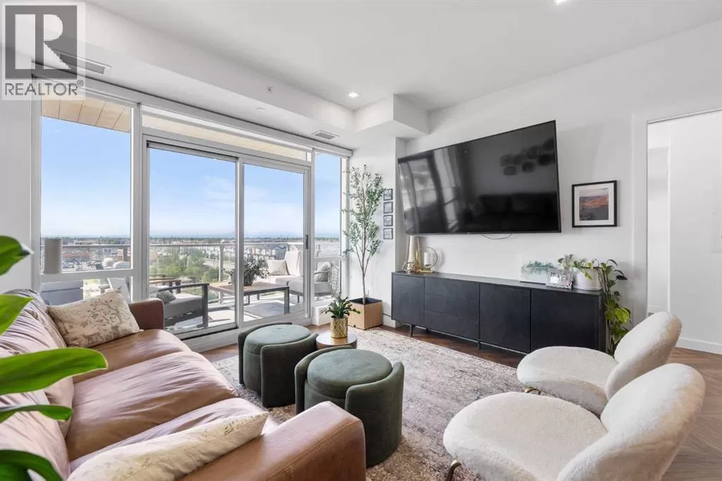 Discover sophisticated living in this upscale 2-bedroom, 2 bathroom condo nestled in the heart of West Springs. Perfect for professionals or downsizers, this concrete-built, low-maintenance residence offers quiet comfort, durability, and a prime location in a vibrant, walkable community. Step through the generous foyer into a sun-drenched open-concept layout featuring expansive windows and sliding glass doors that flood the space with natural light and showcase breathtaking views, including the mountains. The spacious living area opens seamlessly to a large balcony (one of the few private ones in the building), ideal for morning coffee or evening relaxation. The chef-inspired kitchen impresses with integrated stainless steel appliances, a gas range, and a large eat-up islandâperfect for entertaining. The adjacent dining room is both generous in size and versatile enough to serve as a home office or library. Retreat to the primary suite offering a large walk-in closet and a spa-like 4-piece ensuite with dual vanities and a walk-in shower. A second bedroom and a stylish 4-piece bath with deep soaker tub provide flexibility for guests or family. The flexibility of the bedrooms and bathrooms in this unit would also lend itself to two adults easily sharing the space. Youâll also appreciate the in-suite laundry and flooring with acoustic underlay throughout. Additional features include: air conditioning, 1 titled underground parking stall, EV charging stations & bike storage, ownerâs lounge on same level, lobby concierge, ground-level restaurants, shops, wellness studios, community gardens. Just minutes from Calgary French & International School, Webber Academy, Rundle College, and Ernest Manning High School, and quick access to Stoney Trail for weekend getaways. This quiet unit is extremely well-maintained and move-in ready, and combines luxury, lifestyle, and location into one exceptional offering. (id:27476)