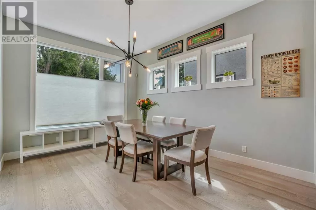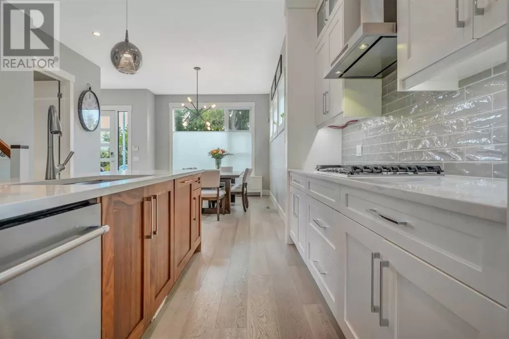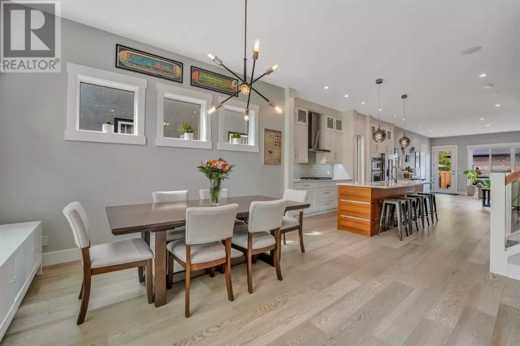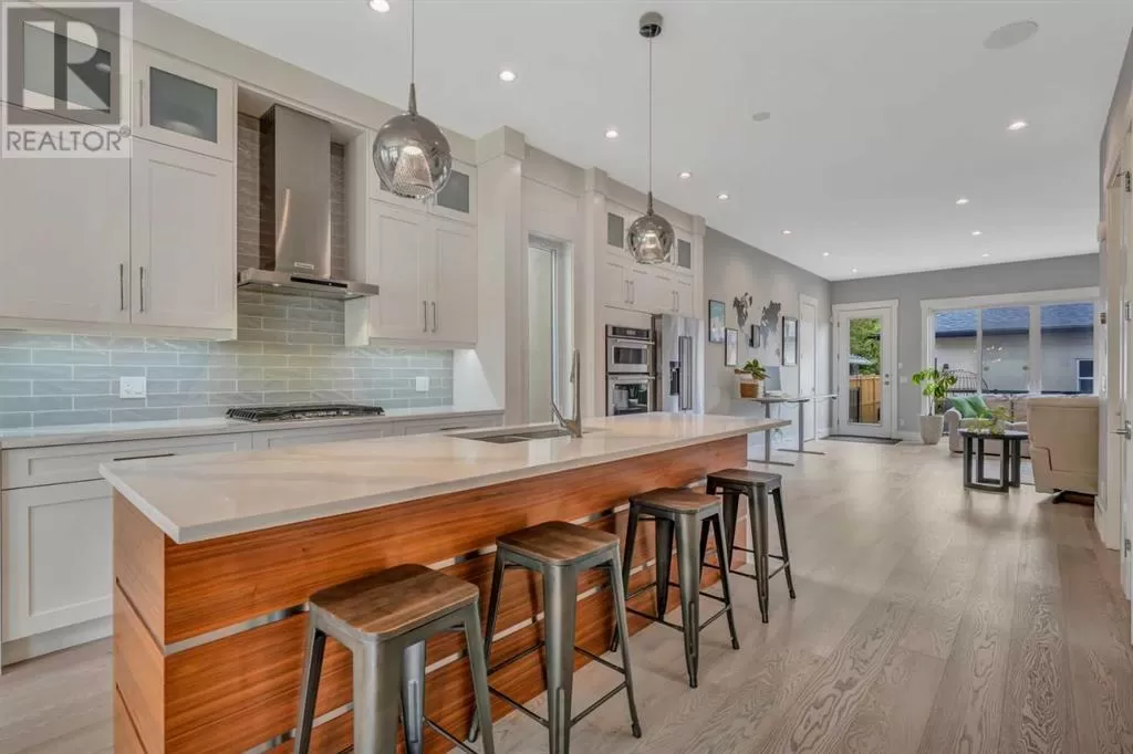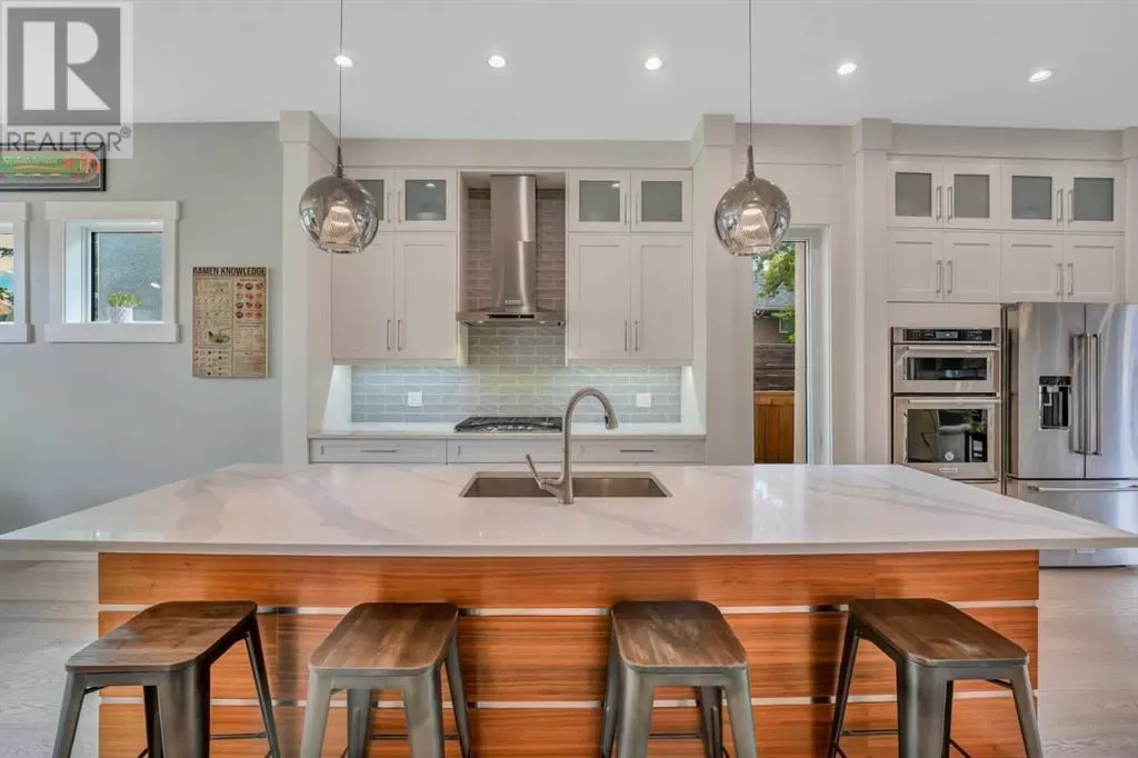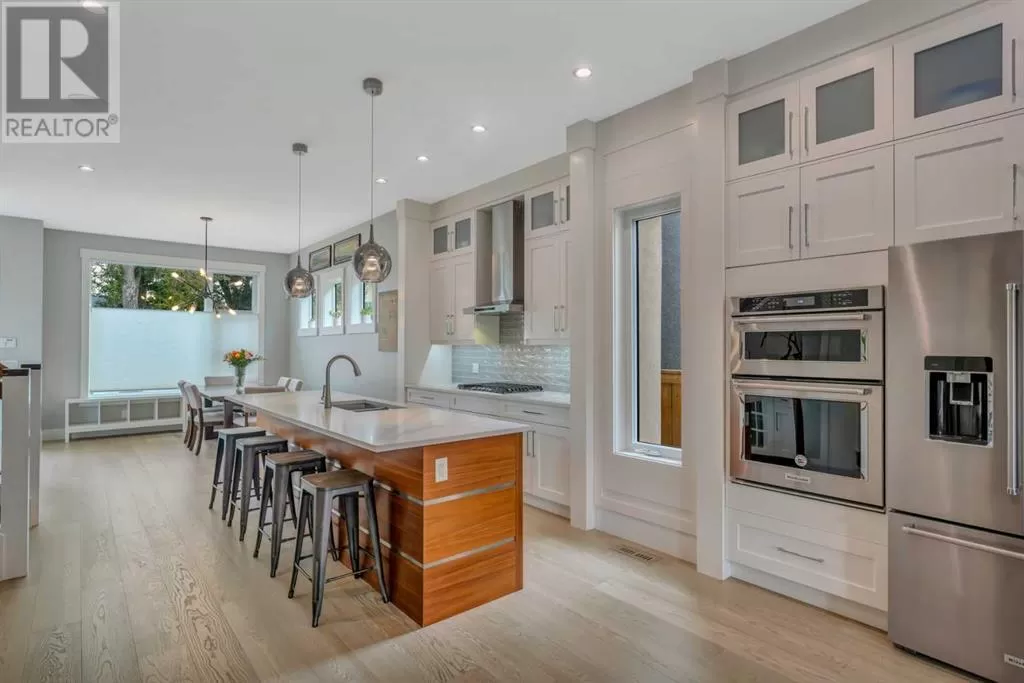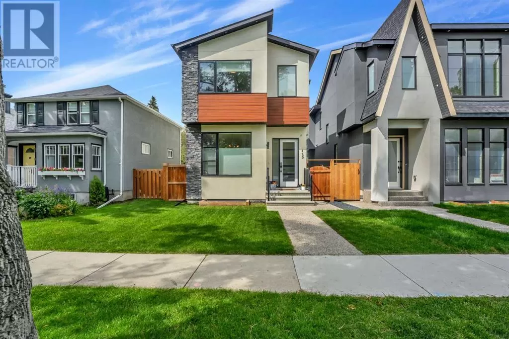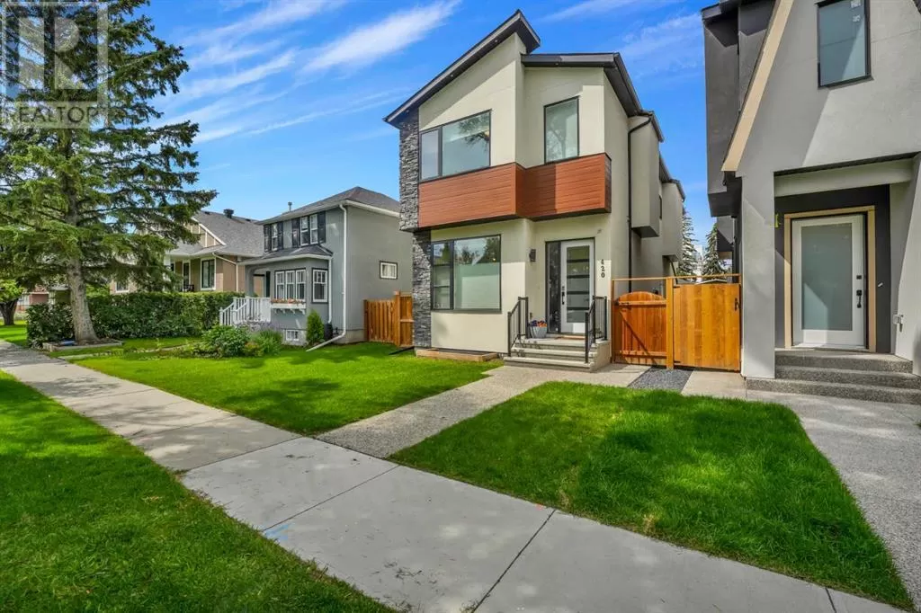 Welcome to 420 14 Avenue NE, an impeccably designed detached infill located on a quiet, tree-lined street in the heart of Renfrew, one of Calgaryâs most sought-after inner-city communities. Boasting 3,100 sqft of luxuriously finished living space, this beautifully appointed 4 bedroom, 3.5 bathroom home combines elegant finishes with functional family-friendly design. The main floor features soaring 10â ceilings, engineered hardwood flooring, custom lighting, and an open-concept layout ideal for entertaining. The chef-inspired kitchen is the centerpiece, complete with quartz countertops, a large island with eating bar, stainless steel appliances, walk-in pantry, and built-in buffet. A spacious living room showcases a floor-to-ceiling tile fireplace flanked by custom built-ins, and a formal dining area and tech center make daily life seamless.As you head upstairs youâll immediately notice the high vaulted ceilings, 8ft doors, and abundance of natural light. The primary bedroom feels less like a bedroom and more like a retreat. It is a true sanctuary, easily accommodating a king-sized bed and nightstands, plus a separate sitting area, recessed lighted ceiling, large walk-in closet with built-ins, and a spa-style 5-piece ensuite with dual sinks, jetted tub, and oversized 10mm glass shower (roughed-in for steam). Two additional bedrooms, an upper laundry room, plus an additional full bath round out the upper level with thoughtful efficiency. The fully developed basement offers 9â ceilings, a sprawling media/rec room with custom home theatre set up, wet bar, fourth bedroom, and a stylish 3-piece bathroom. The separate side entrance and wet bar layout create a fantastic opportunity for a future legal suite (subject to City approvals).Additional features include central air conditioning, glass-panelled staircase with wood accents, designer fixtures, built-in storage, and a double detached garage. Outside, the private backyard with deck offers a perfect spot to unwind. Situated just minutes to downtown Calgary and walking distance to Munro Park, Renfrew Athletic Park, top schools and beloved local gems like Boogieâs Burgers and Peterâs Drive-In. This is the perfect blend of upscale inner-city living and family comfort. (id:27476)