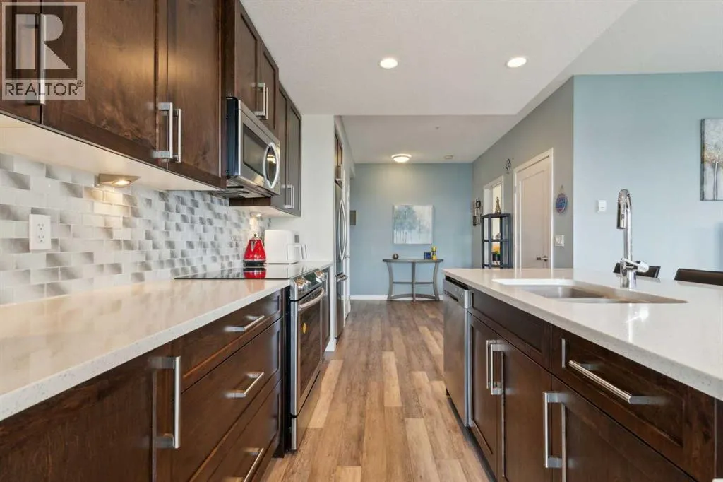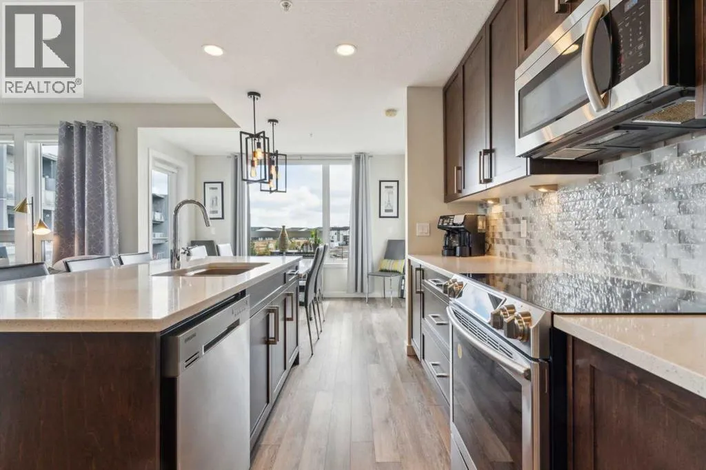 Welcome to your new home in the heart of vibrant West Springs! With numerous parks and pathways at your front door, this pristine and family-friendly community is just steps away from top-rated schools, grocery and retails stores, restaurants, and countless amenities. Set against the backdrop of a peaceful courtyard, the coveted Vivace building offers a warm welcome with a stylish lobby and the convenience of two elevators.This bright and spacious 1,056.83 sqft two-bedroom, two-bathroom condo offers a thoughtfully designed open-concept layout, welcomes you with an ample sized front foyer, soaring 9-foot ceilings and large windows that flood the space with natural light. Enjoy a warm, inviting atmosphere enhanced by durable, stylish flooring and elegant quartz countertops throughout. The expansive kitchen has a sizable pantry with stainless steel appliances and a large island with a built-in dining table extensionâperfect for cooking, hosting, or working from home.The in-suite laundry offers ample space for shelving and storage, enhancing the overall comfort and functionality of the home.Step outside onto your double balcony and enjoy views overlooking a peaceful courtyardâan ideal spot to relax first thing in the morning or unwind after work. The unit features a primary bedroom with a walk in closet and an ensuite bathroom feature of a walk-in shower. The second bedroom has a spacious closet with views onto the courtyard.This unit comes with a tandem parking stall for 2 vehicles! Additionally, the condo has a spacious assigned storage locker and 2 bike lockers for tenants, all located on one parking level. Pets allowed subject to Board approval. Whether you're a young professional or starting a family, donât miss your chance to experience the perfect blend of luxury and affordability in one of Westsideâs most sought-after locations. (id:27476)