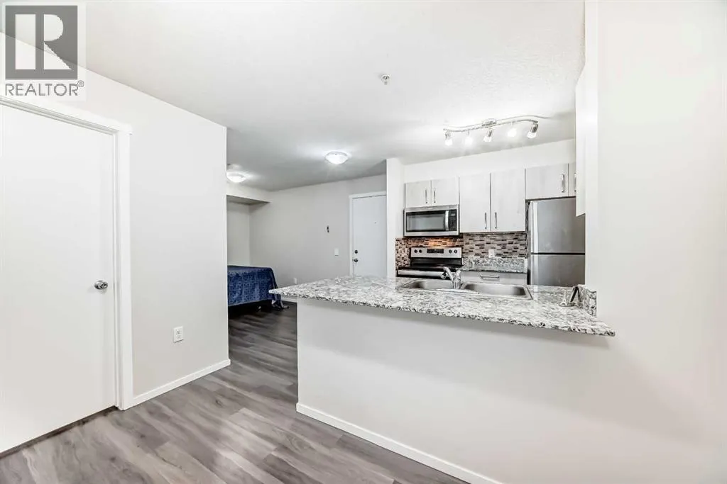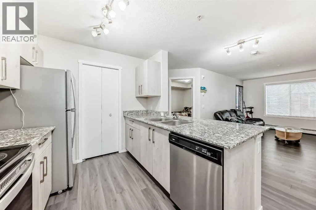 Welcome to your new home at Skyview Landing in Calgary's highly sought-after community of Skyview Ranch! This well-maintained unit features 2 spacious bedrooms, 2 full bathrooms, and a versatile den/flex room, along with the added convenience of titled, heated underground parking.As you step inside, you're welcomed by a bright and inviting atmosphere. The open-concept design seamlessly flows from the den/flex roomâcurrently used as a dining areaâto the kitchen and living room. Perfect for the chef in your family, the kitchen is equipped with ample cabinetry, granite countertops, a stylish backsplash, a large island/breakfast bar combo, and sleek stainless steel appliances.The living room opens onto a spacious corner balcony, ideal for relaxing or entertaining. The primary bedroom includes a walkthrough closet leading to a private ensuite bathroom with a granite vanity. The second bedroom, generously sized and versatile enough to serve as a second primary, also features a walkthrough closet connecting to the main bathroom.Additional highlights include 9-foot knockdown ceilings, a pantry/storage/laundry area with a front-load washer and dryer, and the luxury of heated underground parking, so you'll never need to scrape your car in winter.Stay active and save money with access to the in-house fitness room, included in your low condo fees. For families, the complex offers an on-site daycare, and thereâs plenty of visitor parking for your guests.The location is unbeatable! Enjoy easy access to schools, public transit, parks, walking and bike paths, and major routes like Metis Trail, Stoney Trail, and Country Hills Blvd. You're just a short drive to the airport, C-train, hospitals, outlet mall, and more. Plus, you can walk to nearby shops, clinics, plaza with grocery store, dollar store, sweat shops and restaurants ,and other amenities. (id:27476)
