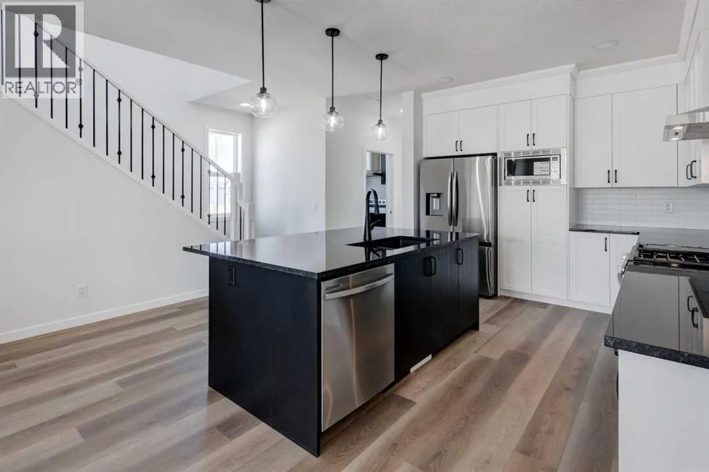 Enjoy the holidays in your BRAND NEW HOME!! Welcome to Your Dream Home in Homestead â Where Luxury Meets Practical Living! Step into this brand new, never lived in masterpiece built by EXCEL HOMES â the upgraded Berkley model offering nearly 1900 sf of contemporary design and exceptional functionality. Nestled in Calgaryâs vibrant new community of Homestead, youâll enjoy quick access off Stoney Trail or 80th Ave NE, with future schools, wetlands, walking paths, and a 3-acre community association site just moments away. From the moment you walk in, this home impresses with its thoughtful layout and premium finishes. The open-concept floor plan seamlessly connects the living room, dining area, and showstopper kitchen â the true heart of the home. Cook like a pro in your chef-inspired kitchen with upgraded stainless steel appliances including a gas stove, built-in microwave, chimney-style hood fan, and an abundance of full-height cabinets and deep pot drawers. Need more space? The spice kitchen is a rare and coveted featureâcomplete with a second electric stove, extra counters and cabinets, and its own sinkâideal for entertaining, cultural cooking, or keeping the main kitchen pristine. What truly sets this home apart is the main floor bedroom with a full bathâperfect for multigenerational living, out-of-town guests, or a private home office. Upstairs, the second level offers three spacious bedrooms including a stunning primary suite with a walk-in closet and spa-inspired ensuite. A vaulted bonus room with pot lighting adds an elevated family retreat, and the convenient upper-level laundry room makes day-to-day living easier. Thinking about rental income or extended family options? This home is roughed-in for a legal two-bedroom suite, with a separate exterior side entrance (city permits and approvals required). As a Certified Built Green home, youâll benefit from energy-saving features and smart home tech, including Ring doorbell, Wi-Fi-enabled garage opener, smart t hermostat, extra CAT6 and USB outlets, plus 9' knockdown ceilings, metal stair railings, and luxury vinyl plank flooring on the main level. Whether you're a growing family, savvy investor, or multi-generational household, this is the home you've been waiting for. Move in, unpack, and start living your best life in Homestead. (id:27476)