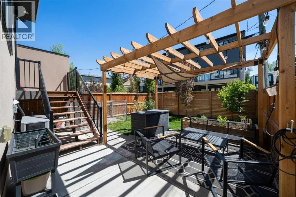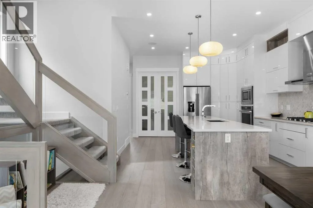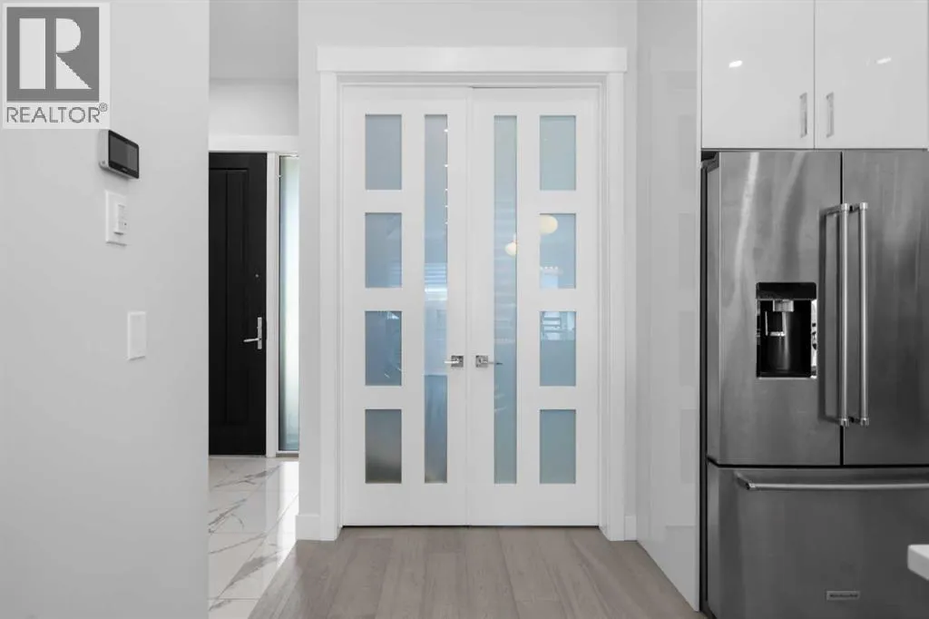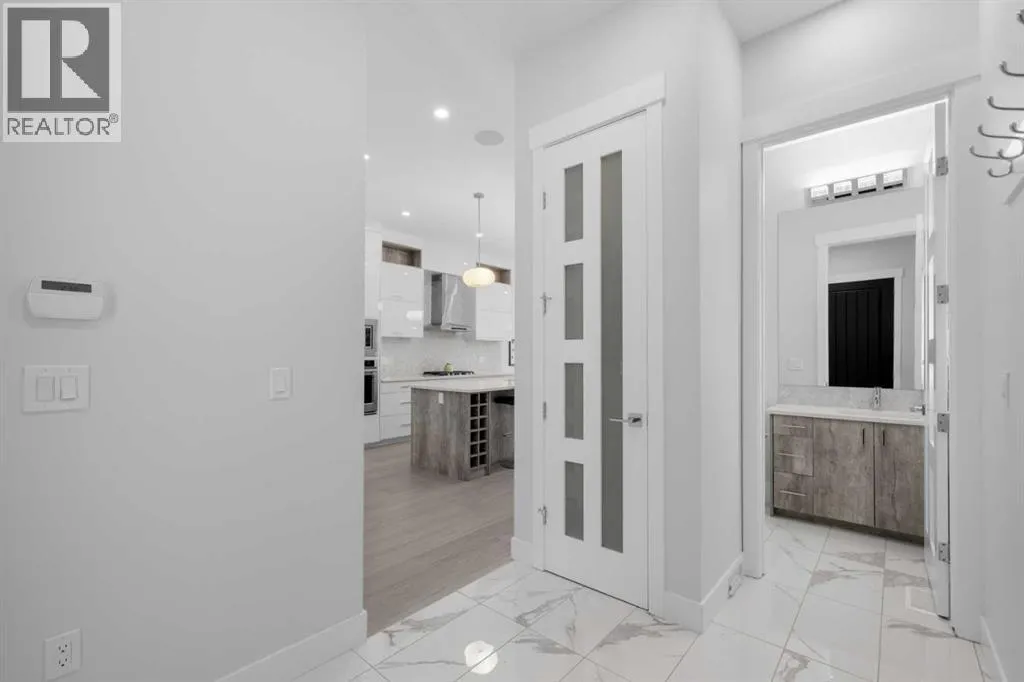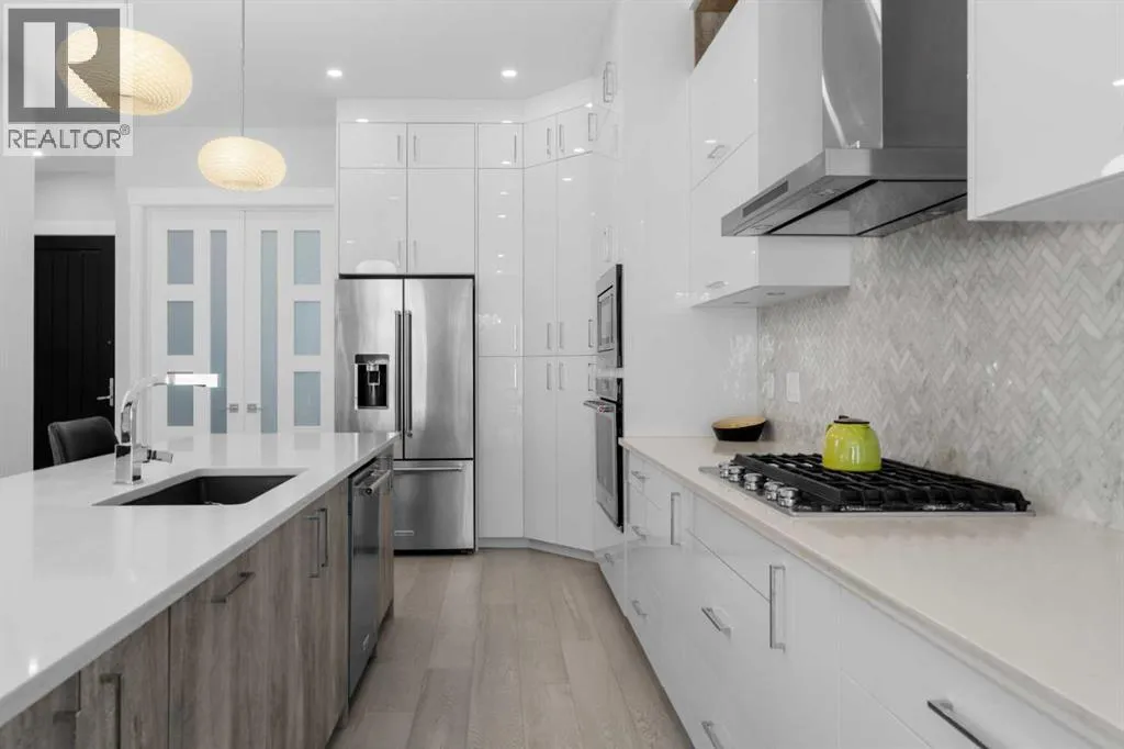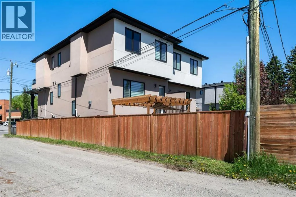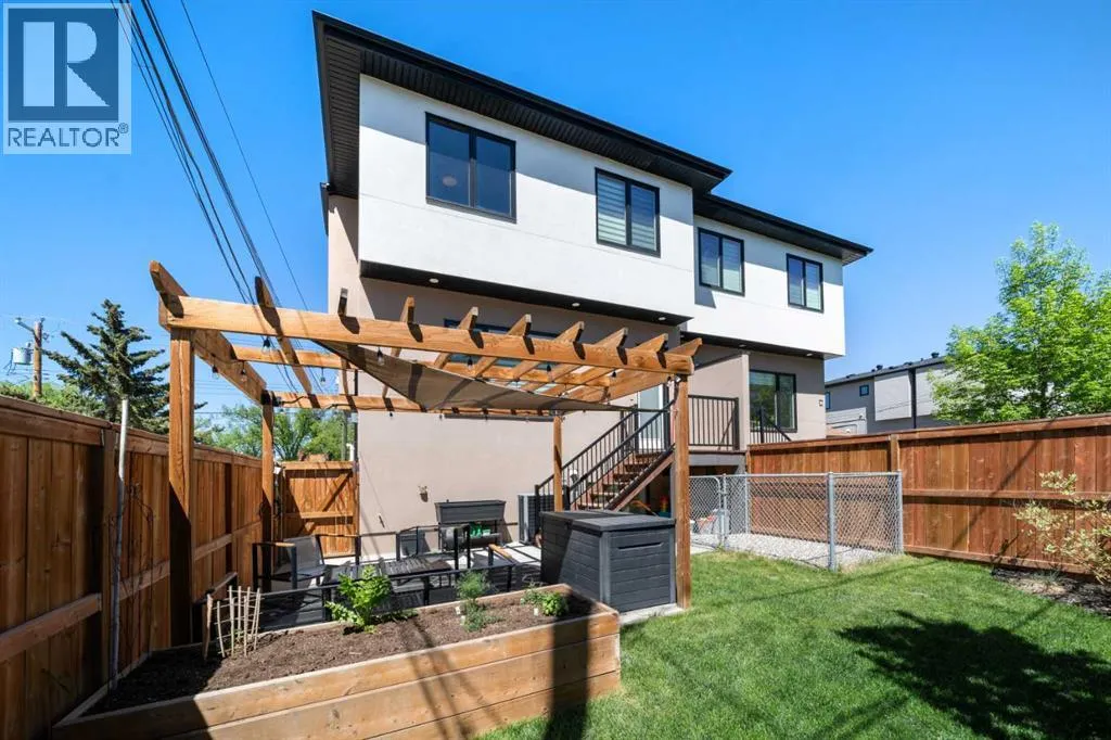Discover modern living at its finest in this stunning two-storey semi-detached home, offering a rare under drive double attached garage and a stylish front veranda. Designed with exceptional attention to detail, this home boasts 4 bedrooms, 3.5 bathrooms, and air conditioning, ensuring year-round comfort. With heated floors in the primary ensuite, basement and even the garage giving you extra warmth. Step inside to a bright, open layout adorned with hardwood and tile flooring on the main level. The front office with French doors provides the perfect work-from-home space. The gourmet kitchen is a chefâs dream, featuring a large center island with quartz countertops, full-height high-gloss cabinets, a built-in stainless steel appliance package including a gas cooktop stove and chimney hood fan. Entertain effortlessly in the central dining room and rear living room, complete with a center gas fireplace with tile surround and built-ins, with seamless access to the backyard.Upstairs, retreat to the luxurious primary suite, boasting a private balcony with captivating city views. The spa-like 5-piece ensuite includes a dual vanity, a freestanding tub, and a custom glass shower, while the massive walk-in closet offers custom organizers and drawers. Two additional bedrooms, a 4-piece bathroom, and a convenient laundry room with a sink complete the upper level.The fully developed basement extends your living space with a cozy rec room, an additional bedroom, and a 4-piece bathroomâperfect for guests or family.The backyard is a true oasis, featuring an upper deck with stairs leading to a lower patio, a pergola, beautifully maintained gardens with a built-in planter, and a dedicated dog run.Situated on a corner lot next to an alley, this property shares only one attached neighbor and offers easy access to 17th Avenue and major roads, ensuring a quick commute in and out of the city. Make sure to click on the video tour icon! (id:27476)