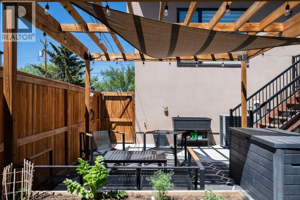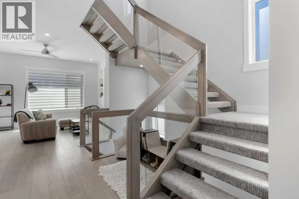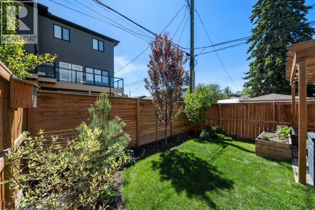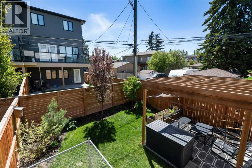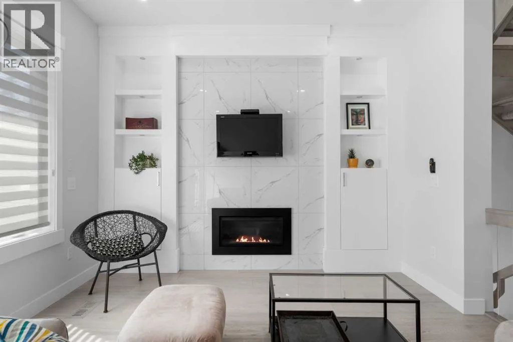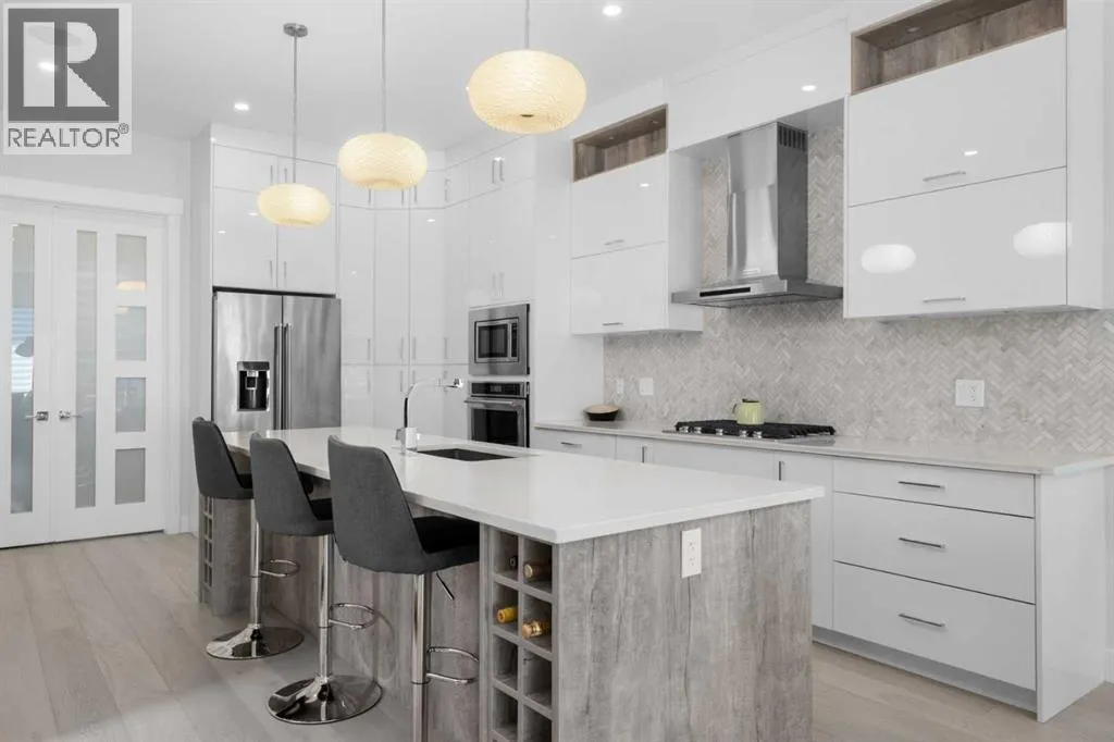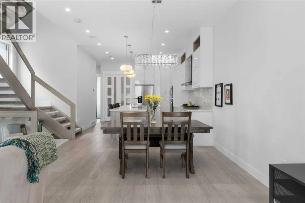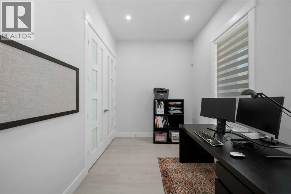 Discover modern living at its finest in this stunning two-storey semi-detached home, offering a rare under drive double attached garage and a stylish front veranda. Designed with exceptional attention to detail, this home boasts 4 bedrooms, 3.5 bathrooms, and air conditioning, ensuring year-round comfort. With heated floors in the primary ensuite, basement and even the garage giving you extra warmth. Step inside to a bright, open layout adorned with hardwood and tile flooring on the main level. The front office with French doors provides the perfect work-from-home space. The gourmet kitchen is a chefâs dream, featuring a large center island with quartz countertops, full-height high-gloss cabinets, a built-in stainless steel appliance package including a gas cooktop stove and chimney hood fan. Entertain effortlessly in the central dining room and rear living room, complete with a center gas fireplace with tile surround and built-ins, with seamless access to the backyard.Upstairs, retreat to the luxurious primary suite, boasting a private balcony with captivating city views. The spa-like 5-piece ensuite includes a dual vanity, a freestanding tub, and a custom glass shower, while the massive walk-in closet offers custom organizers and drawers. Two additional bedrooms, a 4-piece bathroom, and a convenient laundry room with a sink complete the upper level.The fully developed basement extends your living space with a cozy rec room, an additional bedroom, and a 4-piece bathroomâperfect for guests or family.The backyard is a true oasis, featuring an upper deck with stairs leading to a lower patio, a pergola, beautifully maintained gardens with a built-in planter, and a dedicated dog run.Situated on a corner lot next to an alley, this property shares only one attached neighbor and offers easy access to 17th Avenue and major roads, ensuring a quick commute in and out of the city. Make sure to click on the video tour icon! (id:27476)