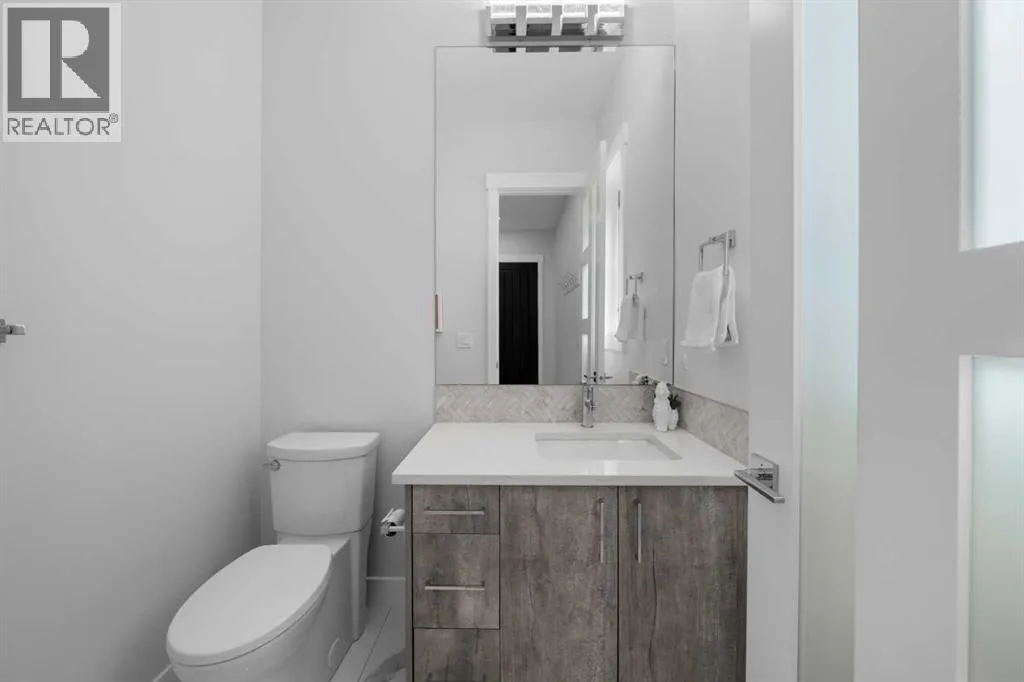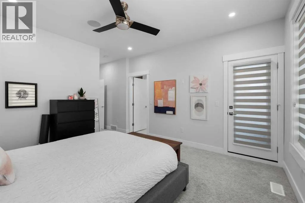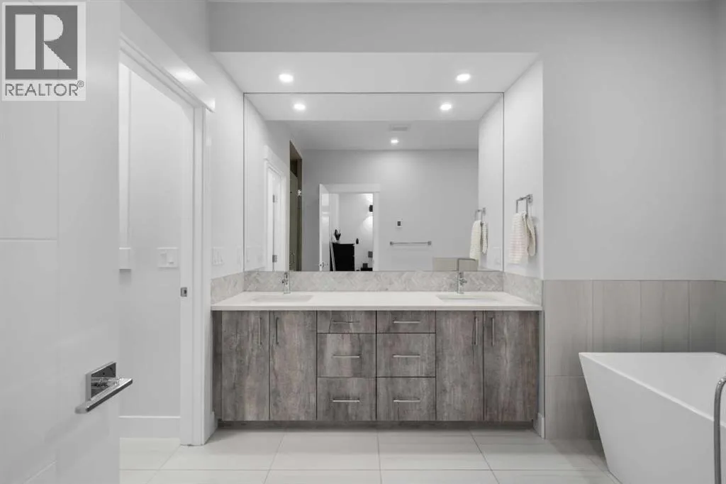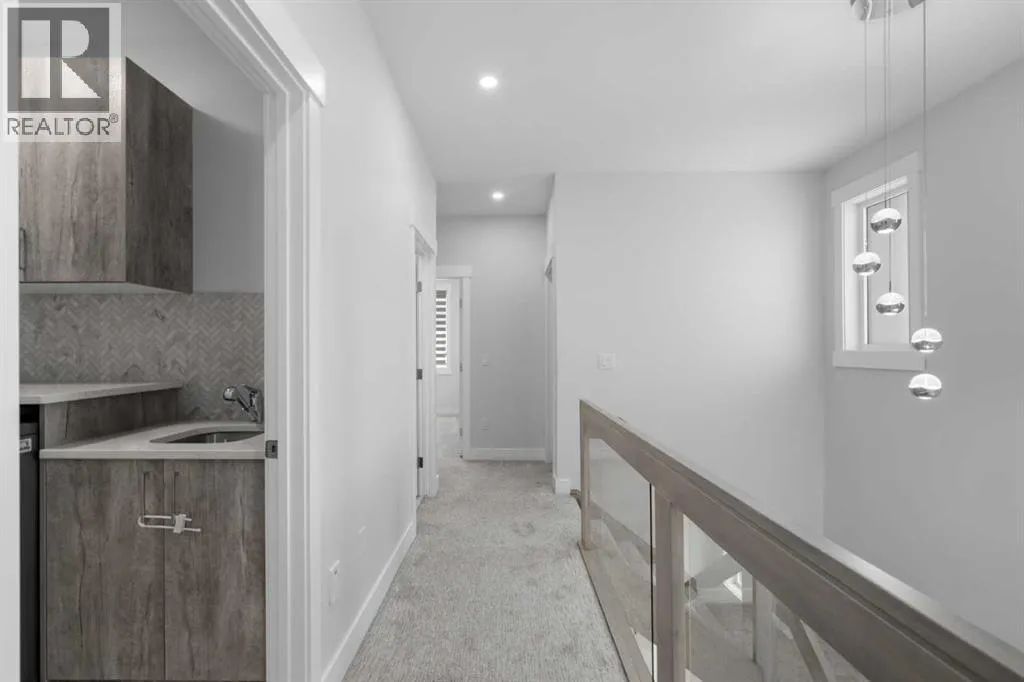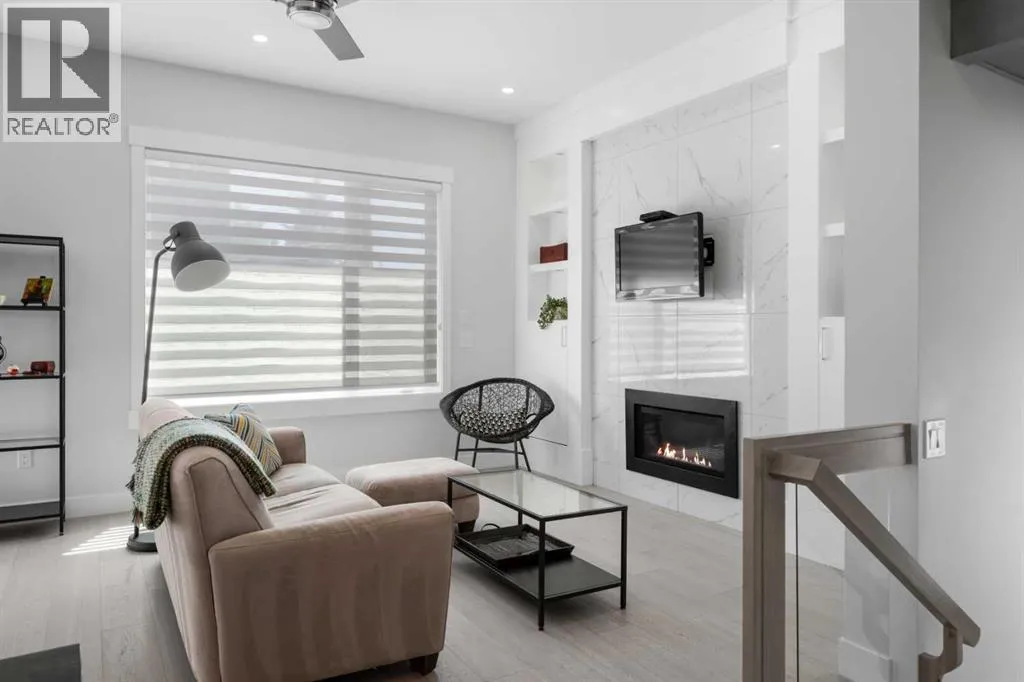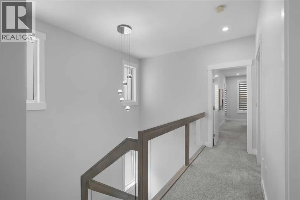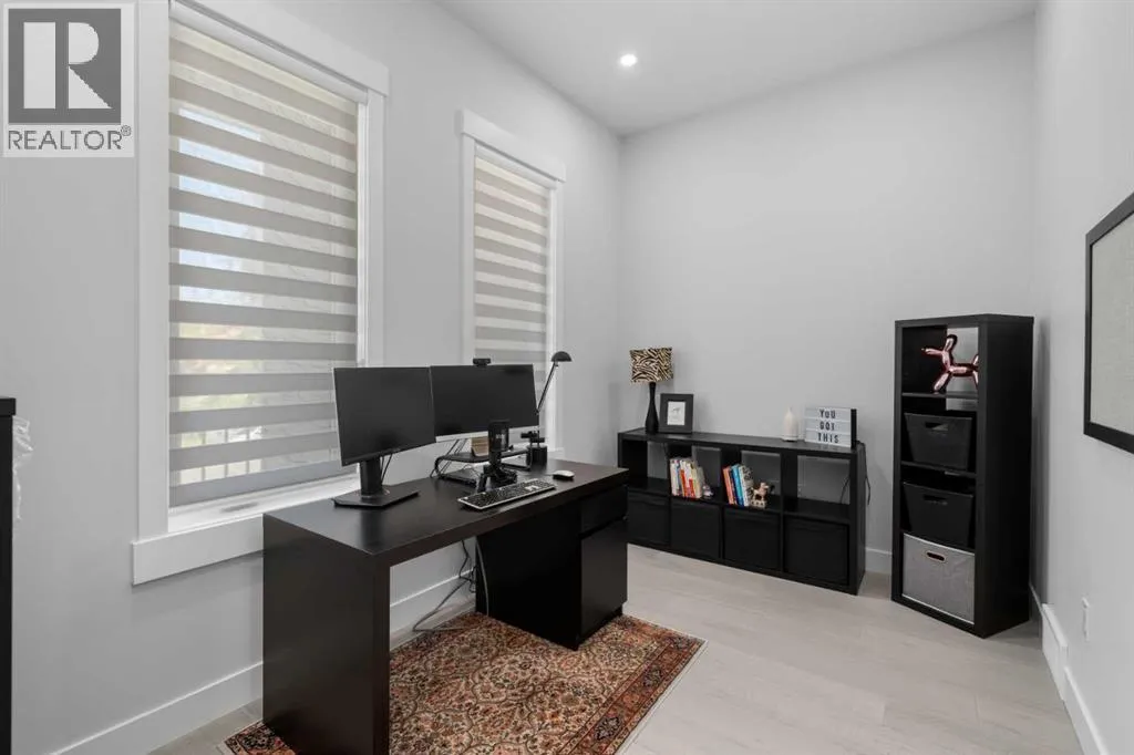 Discover modern living at its finest in this stunning two-storey semi-detached home, offering a rare under drive double attached garage and a stylish front veranda. Designed with exceptional attention to detail, this home boasts 4 bedrooms, 3.5 bathrooms, and air conditioning, ensuring year-round comfort. With heated floors in the primary ensuite, basement and even the garage giving you extra warmth. Step inside to a bright, open layout adorned with hardwood and tile flooring on the main level. The front office with French doors provides the perfect work-from-home space. The gourmet kitchen is a chefâs dream, featuring a large center island with quartz countertops, full-height high-gloss cabinets, a built-in stainless steel appliance package including a gas cooktop stove and chimney hood fan. Entertain effortlessly in the central dining room and rear living room, complete with a center gas fireplace with tile surround and built-ins, with seamless access to the backyard.Upstairs, retreat to the luxurious primary suite, boasting a private balcony with captivating city views. The spa-like 5-piece ensuite includes a dual vanity, a freestanding tub, and a custom glass shower, while the massive walk-in closet offers custom organizers and drawers. Two additional bedrooms, a 4-piece bathroom, and a convenient laundry room with a sink complete the upper level.The fully developed basement extends your living space with a cozy rec room, an additional bedroom, and a 4-piece bathroomâperfect for guests or family.The backyard is a true oasis, featuring an upper deck with stairs leading to a lower patio, a pergola, beautifully maintained gardens with a built-in planter, and a dedicated dog run.Situated on a corner lot next to an alley, this property shares only one attached neighbor and offers easy access to 17th Avenue and major roads, ensuring a quick commute in and out of the city. Make sure to click on the video tour icon! (id:27476)