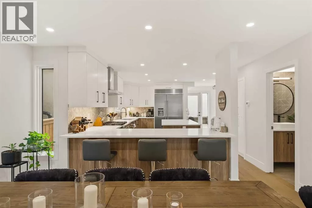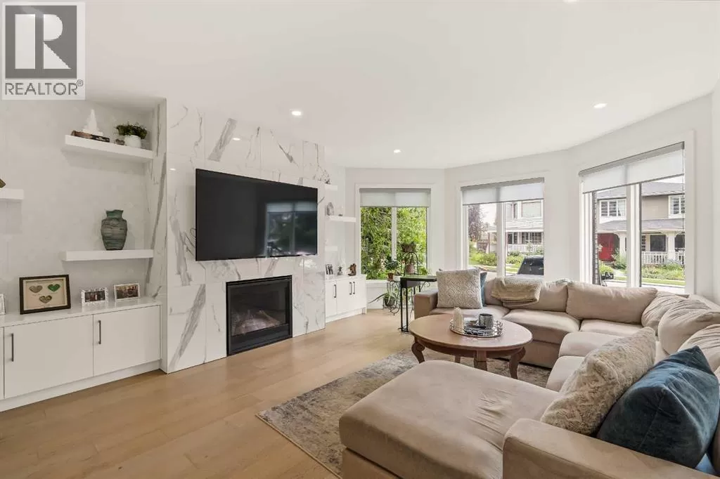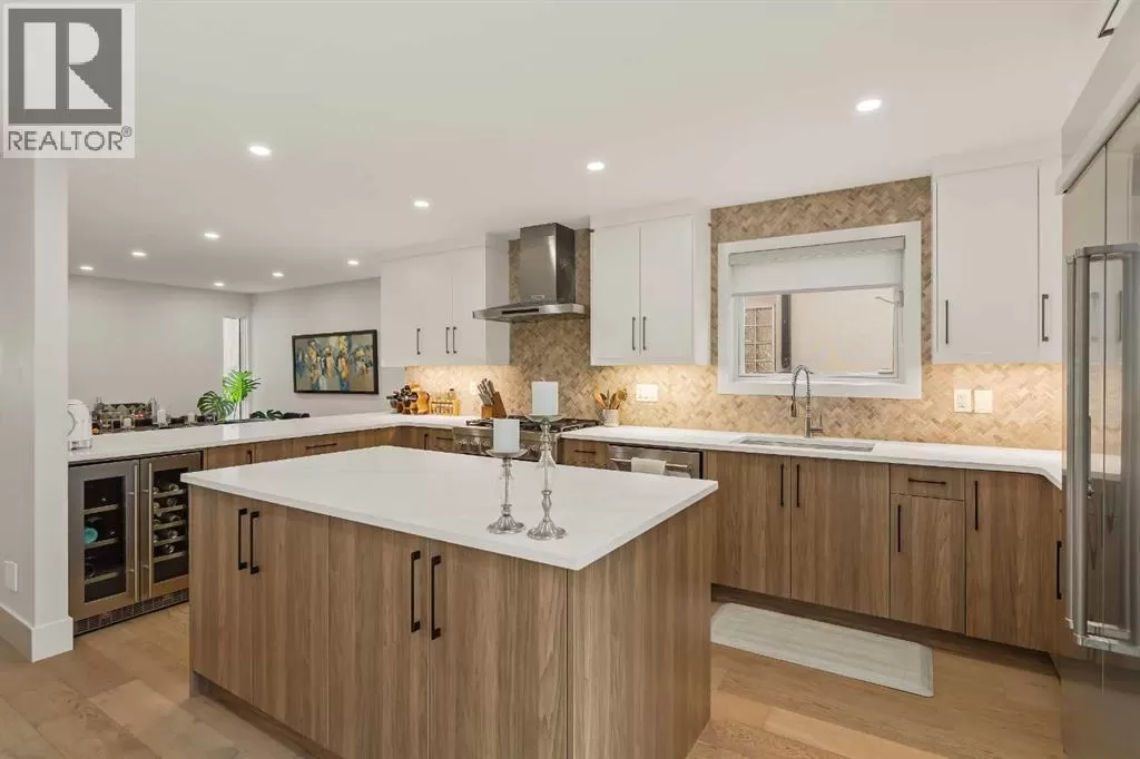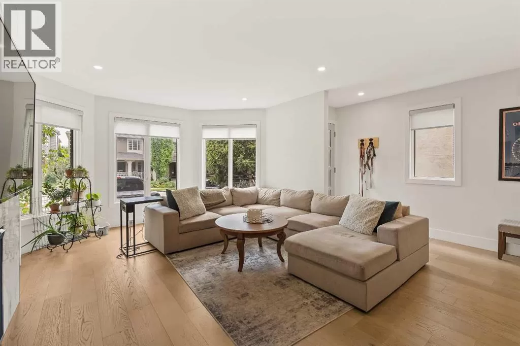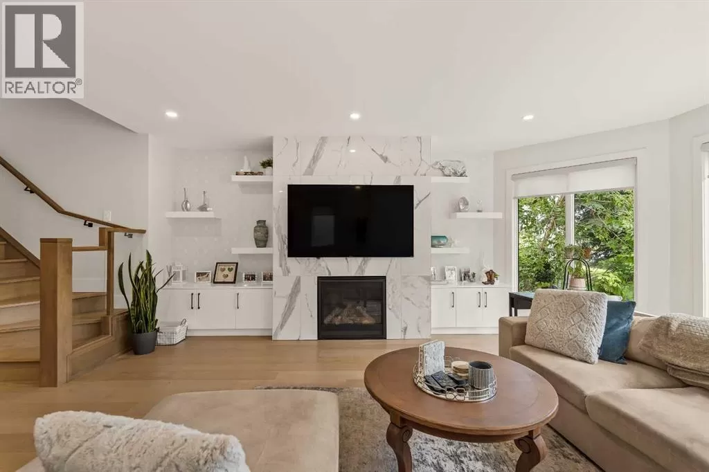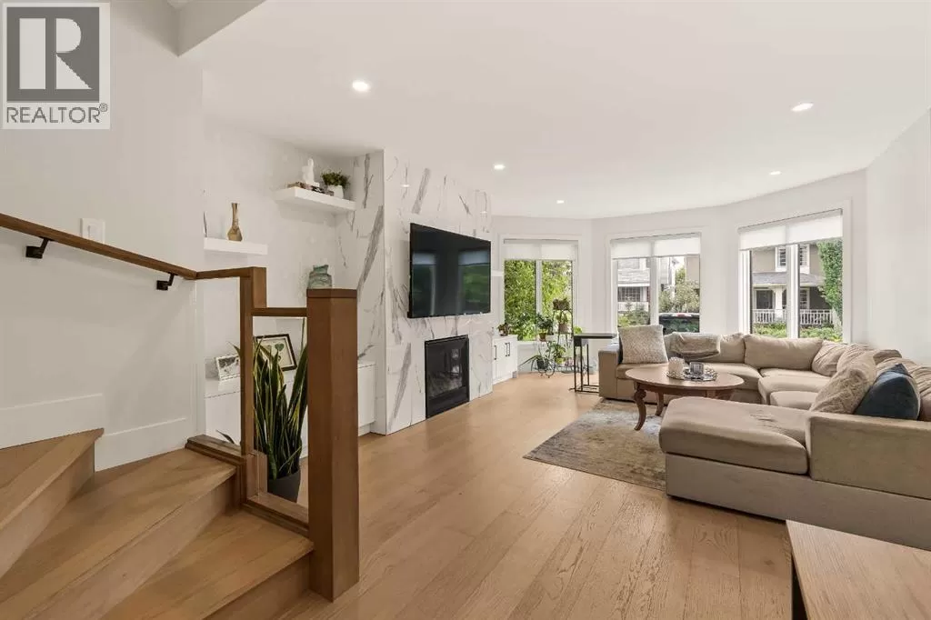 Completely reimagined from the studs up, this luxurious 3-storey residence in the prestigious inner-city community of Parkhill offers nearly 3,000 sq ft of refined living above grade, where timeless elegance meets modern sophistication. Every detail has been thoughtfully curatedâfrom wide-plank hardwood flooring to custom built-ins, designer lighting & premium finishes throughout. The open-concept main floor is anchored by a striking floor-to-ceiling marbled gas fireplace, creating a warm yet elevated focal point in the sun-filled living room. The expanded chefâs kitchen is a statement in style & function, featuring an oversized centre island, gas range, wine fridge, two-tone cabinetry, quartz countertops & a herringbone tile backsplashâpaired with an elegant dining area perfect for hosting. A designer powder room & custom mudroom with built-in storage complete the main level. The second level offers two generously sized bedrooms each with walk-in closets & their own private ensuites, while a full laundry room with sink & built-ins adds convenience. The top floor is a true retreatâdedicated entirely to the primary suite, complete with a gas fireplace, sunlit office nook with skylights, private rear deck with downtown views, a spa-worthy ensuite with freestanding soaker tub, dual vanities, oversized glass shower & an exquisite walk-in dressing room. The fully finished lower level continues to impress with a large rec/media room, bar with beverage fridge, 4th bedroom & full bathâoffering flexible space for family or guests. Outside, the low-maintenance backyard with composite decking is tailor-made for summer entertaining. A double detached garage rounds out this exceptional property. Set in a coveted location steps from the Elbow River pathway system, River Park, Missionâs vibrant 4th Street & cafés, top-rated schools & C-Train accessâthis home offers the perfect blend of luxury, lifestyle & inner-city connection. (id:27476)