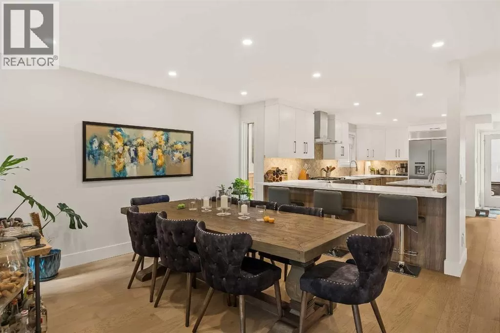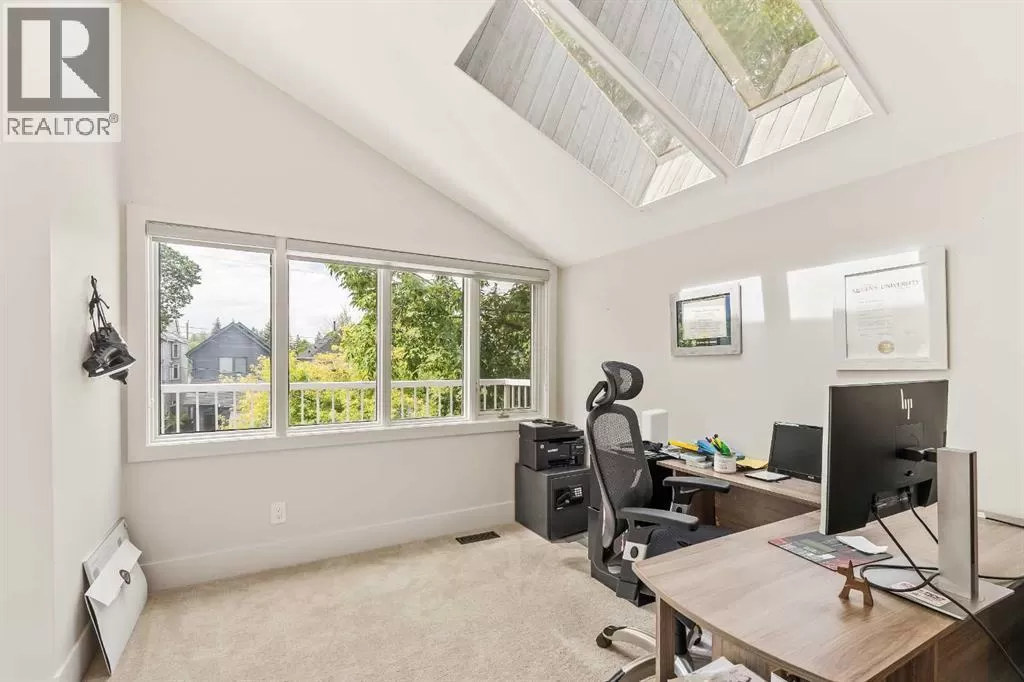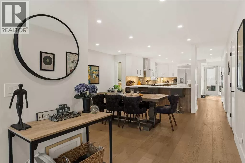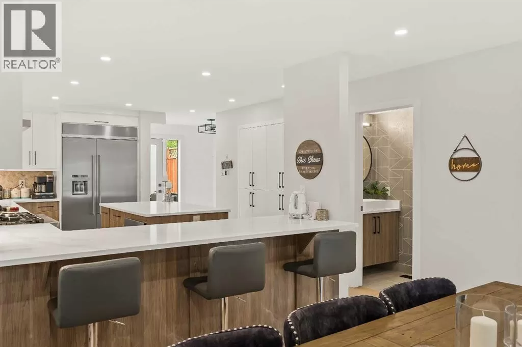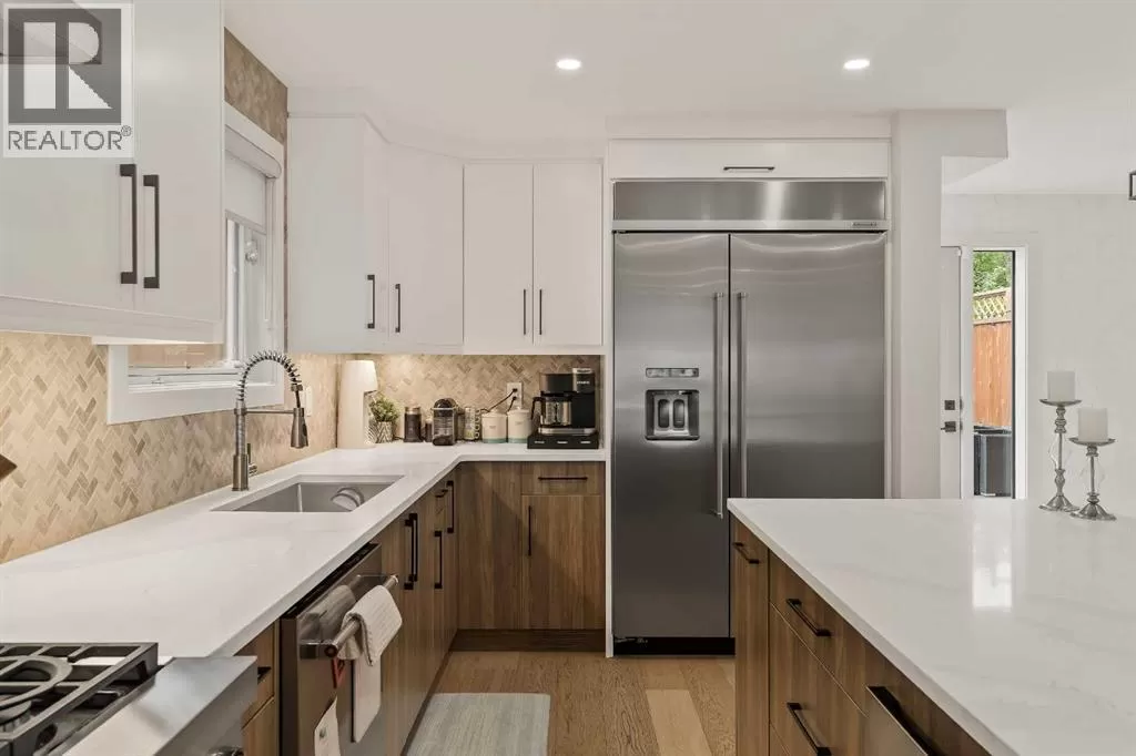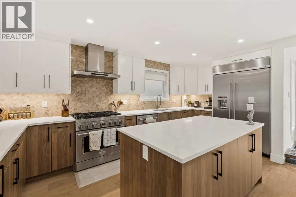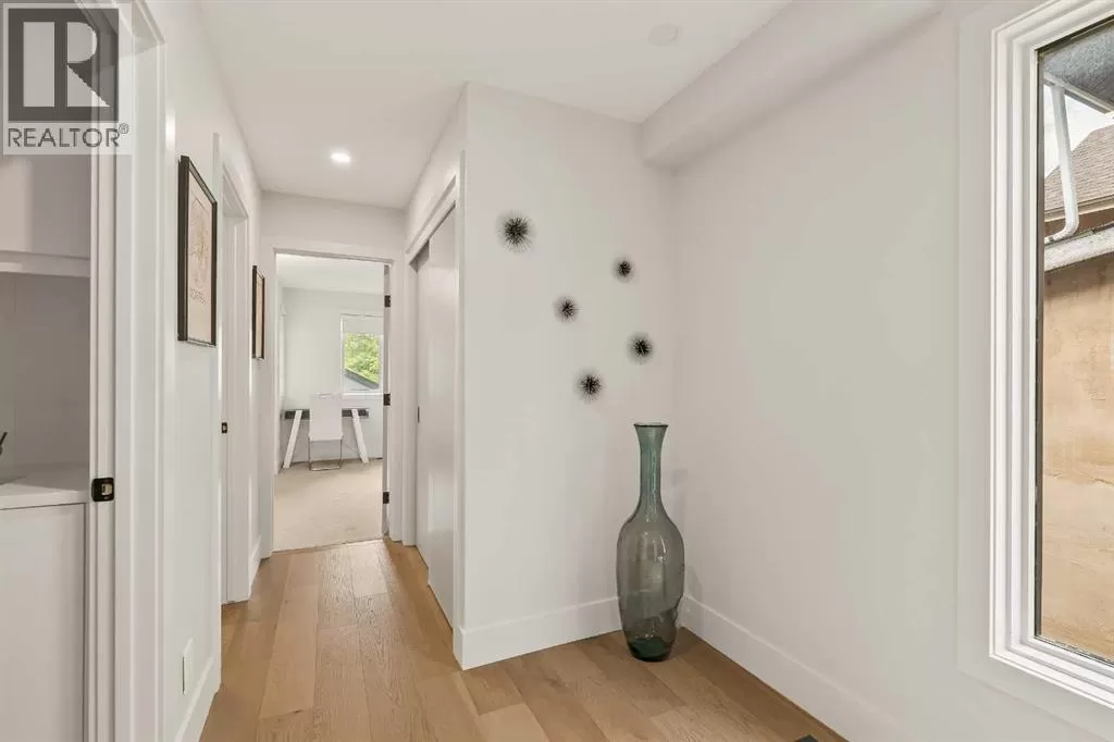 Completely reimagined from the studs up, this luxurious 3-storey residence in the prestigious inner-city community of Parkhill offers nearly 3,000 sq ft of refined living above grade, where timeless elegance meets modern sophistication. Every detail has been thoughtfully curatedâfrom wide-plank hardwood flooring to custom built-ins, designer lighting & premium finishes throughout. The open-concept main floor is anchored by a striking floor-to-ceiling marbled gas fireplace, creating a warm yet elevated focal point in the sun-filled living room. The expanded chefâs kitchen is a statement in style & function, featuring an oversized centre island, gas range, wine fridge, two-tone cabinetry, quartz countertops & a herringbone tile backsplashâpaired with an elegant dining area perfect for hosting. A designer powder room & custom mudroom with built-in storage complete the main level. The second level offers two generously sized bedrooms each with walk-in closets & their own private ensuites, while a full laundry room with sink & built-ins adds convenience. The top floor is a true retreatâdedicated entirely to the primary suite, complete with a gas fireplace, sunlit office nook with skylights, private rear deck with downtown views, a spa-worthy ensuite with freestanding soaker tub, dual vanities, oversized glass shower & an exquisite walk-in dressing room. The fully finished lower level continues to impress with a large rec/media room, bar with beverage fridge, 4th bedroom & full bathâoffering flexible space for family or guests. Outside, the low-maintenance backyard with composite decking is tailor-made for summer entertaining. A double detached garage rounds out this exceptional property. Set in a coveted location steps from the Elbow River pathway system, River Park, Missionâs vibrant 4th Street & cafés, top-rated schools & C-Train accessâthis home offers the perfect blend of luxury, lifestyle & inner-city connection. (id:27476)