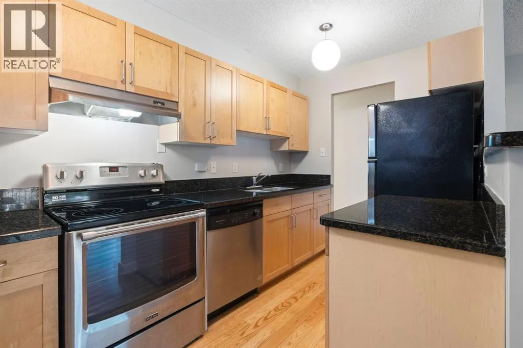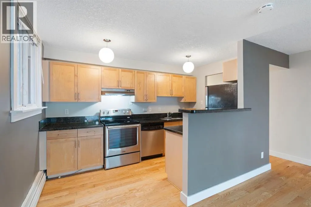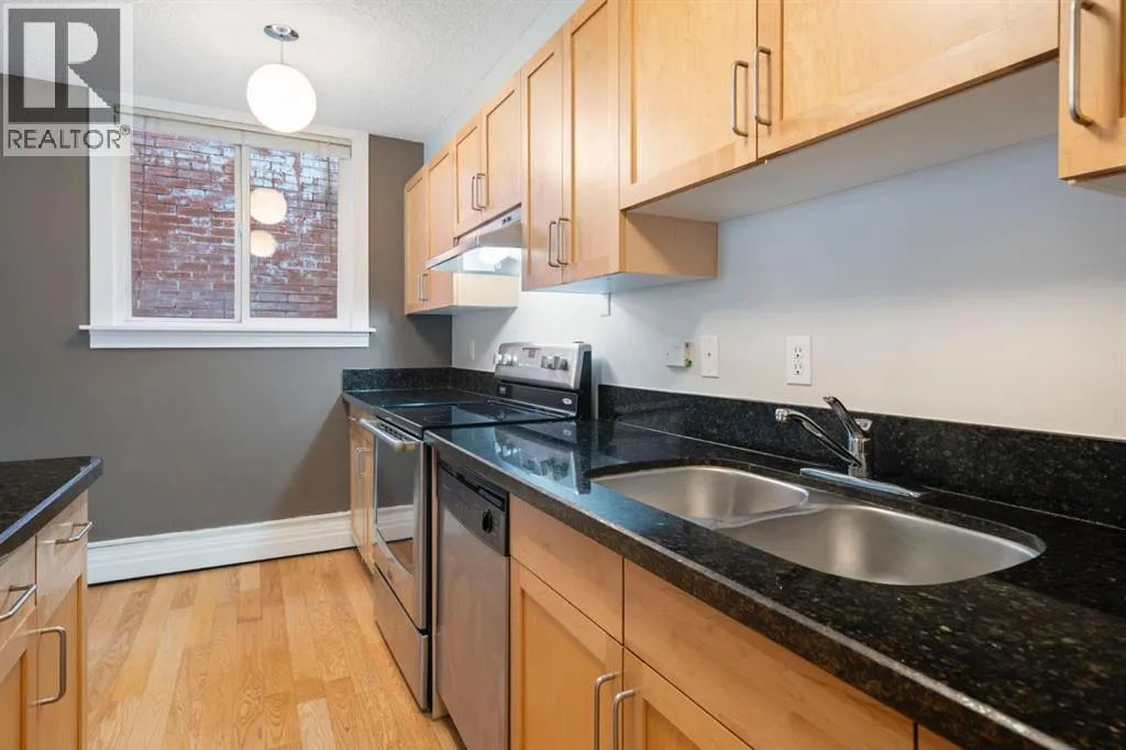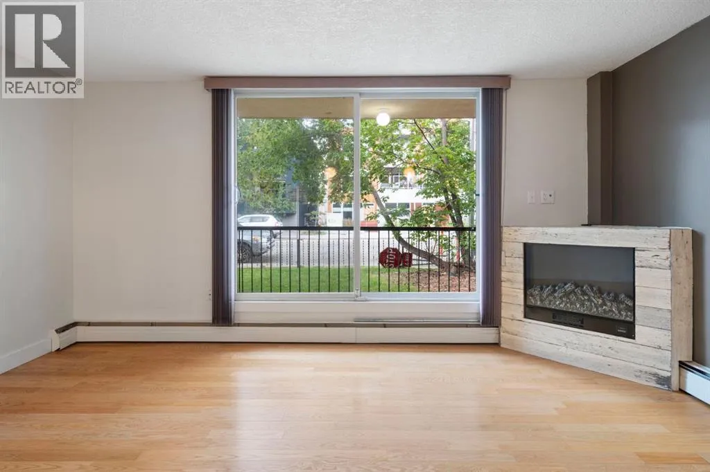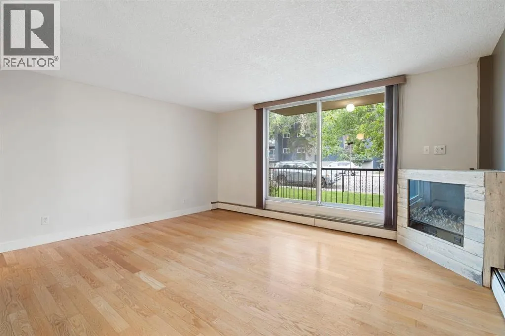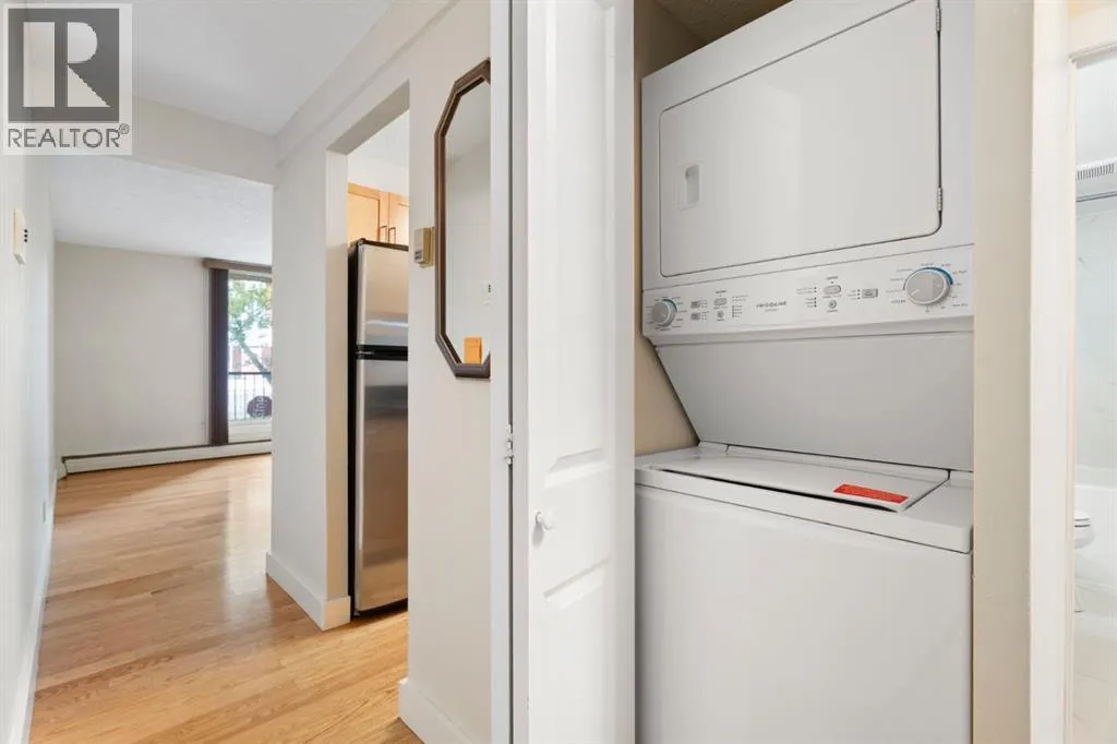 PRICE REDUCTION, AMAZING VALUE! Located in the vibrant community of Sunnyside, this freshly painted 2 bedroom 1 bathroom END unit apartment is MOVE IN READY. Entering the unit you'll be welcomed with hardwood floors, a generous storage room and your stacked, in-unit laundry (April 2025). Walking into the main living space you'll appreciate the large kitchen featuring stainless steel appliances, granite countertops, an open concept floor plan with a good sized living/dining area and a newer fireplace, 2023. With extra windows across the front, side and back (due to it being an end unit), you'll always feel warm and at home. The oversized patio doors lead to a SOUTH FACING patio that's great for a morning coffee or evening wine. The 4 piece bathroom was renovated in November 2020 and has tile flooring. Both bedrooms are larger than you'd normally find in a two bedroom apartment with the carpet being replaced in 2019. Other features of the unit/building are that you're just a few steps to your parking stall which has a plug, there's a new ramp being installed at the main entrance and it's a concrete building. The biking score is an impressive 99 with a walkability score of 95 and transit score of 77, almost unheard of! Other important destinations are: Steps to Safeway, walking distance to coffee, cafes, boutiques, river pathways, 2 blocks from the Bow River, 2 blocks from Kensington, 1 block from the C train, and just 1 stop on the C train from Sait and 2 stops to the University of Calgary. (id:27476)
