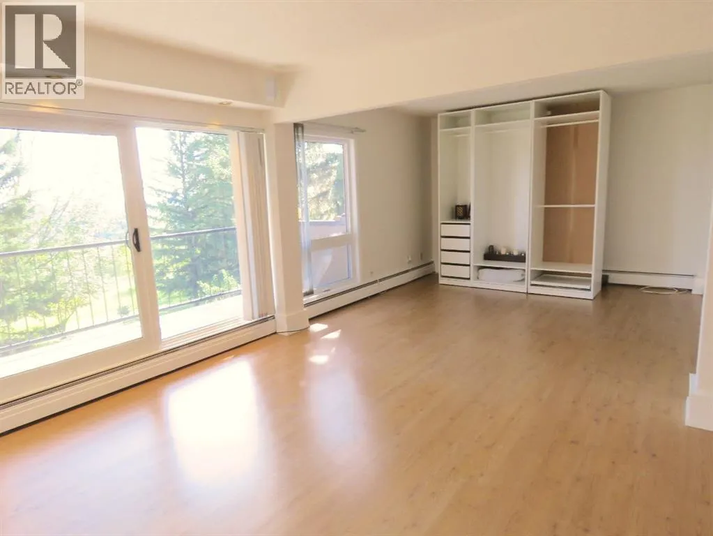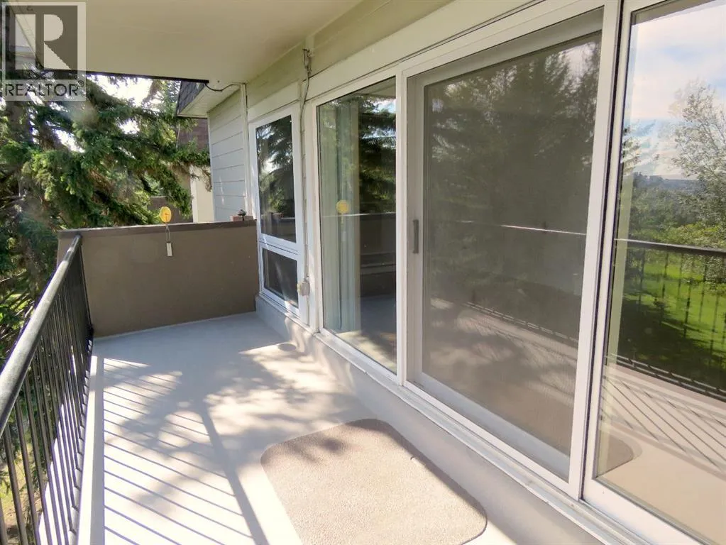 Very large fantastic balcony with a gorgeous view of Douglas fir Walking Trail, River Valley, nature, trees and privacy! CONCRETE BUILDING with CITY VIEWS! Where in Calgary can you buy an upgraded condo surrounded by green space backing onto Douglas Fir Trail with bike paths/walkways leading to the river, Edworthy Park and Shaganappi Golf Course, gorgeous valley, Bow River and downtown VIEWS, seclusion & privacy, and minutes to the LRT? THIS IS IT! Good sized entrance into the unit. The kitchen has been opened up. A wall of windows and patio doors leading out to the balcony and view. Loads of cabinets, granite tile countertops, lots of counter space and eating area with 4 bar stools. Newly installed, portable washing machine in kitchen can be conveniently stored in the storage area when not in use. Downstairs: Coin-op laundry area, bathroom, gigantic assigned storage space for this unit, entertainment area for ownerâs use, bike storage, exit to outdoors and one assigned parking stall with lots of street parking. Right across from the condo building is a very nice park. Walk to the Community Centre, strip mall with restaurant and much more. The Board is very diligent and has done many upgrades to the building inside and out.. Call today, vacant and EASY TO SHOW! (id:27476)