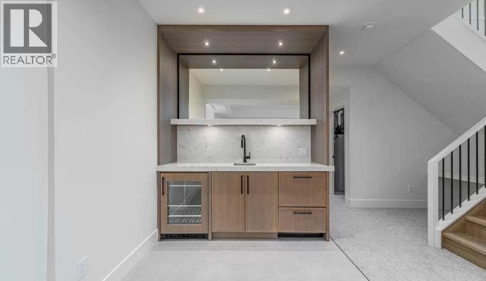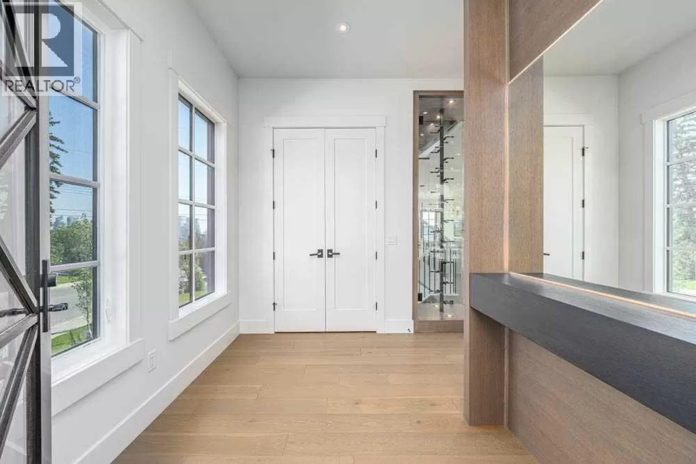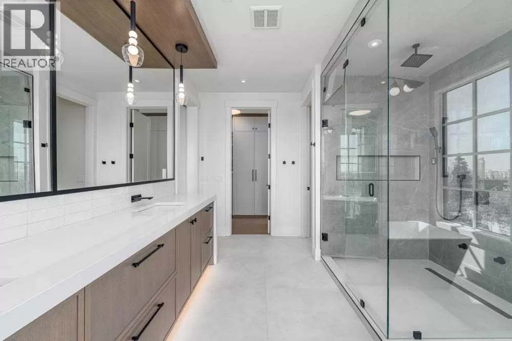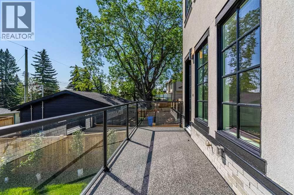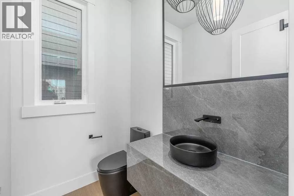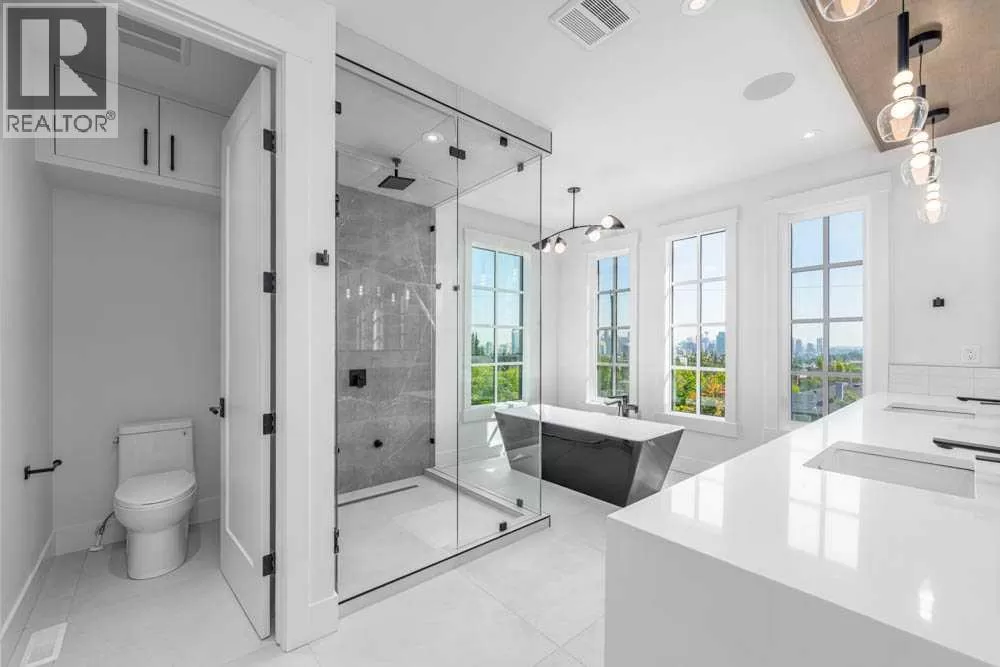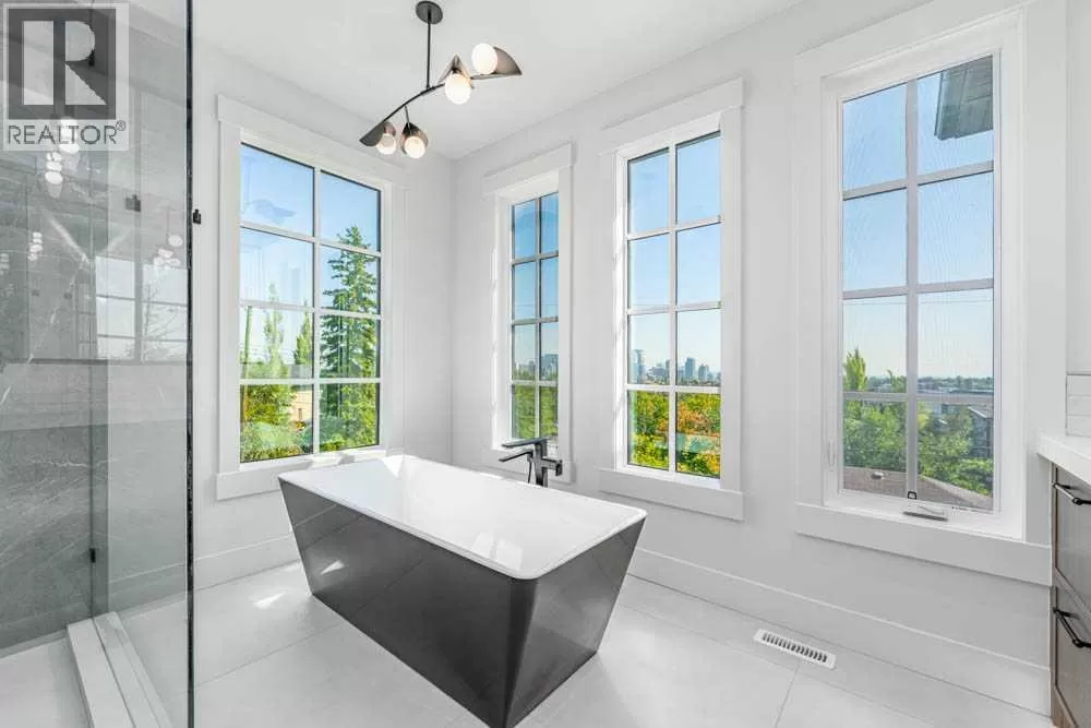 Luxury Living with Breathtaking Views in the Heart of Bankview. Discover an extraordinary modern home perched in one of Calgaryâs most desirable inner city locations. This striking corner property in Bankview combines bold architecture, refined interiors, and panoramic downtown views that elevate everyday living. From the moment you arrive, the home's clean modern lines, oversized windows, and meticulously landscaped yard make a strong first impression. The low-maintenance yard features an automatic irrigation system, so everything stays green and beautiful without the work. Step inside to soaring ceilings and sun filled spaces that create an immediate sense of openness. The formal dining room, surrounded by windows, is ideal for hosting gatherings both big and small. Nearby, a discreet powder room and custom wine storage add practical luxury. At the heart of the home is a stunning chefâs kitchen, equipped with premium Fisher & Paykel appliances, striking quartz counters, statement tile, and a butler pantry to keep everything organized. The oversized island is perfect for prepping, serving, or socializing, and the cozy breakfast nook opens onto a private terrace, blending indoor comfort with outdoor living. The family room is equally impressive, anchored by a dramatic floor-to-ceiling stone fireplace and seamless access to a second outdoor terrace with sweeping city views, ideal for evening cocktails or weekend lounging. A glass enclosed open staircase adds a striking architectural element and invites light to move freely through the home. Upstairs, the luxurious primary suite is your personal retreat. Enjoy dual custom closets, a built-in vanity, and a spa like ensuite featuring heated floors, a deep soaker tub, double sinks, a rainfall steam shower, and beautiful finishes throughout. Two additional bedrooms offer flexibility for kids, guests, or home offices, and the full bathroom also features in floor heat and generous storage. A laundry room with high end washe r/dryer and ample cabinetry makes daily tasks easier and more efficient. The lower level expands your living space with a spacious recreation room, custom wet bar with wine fridge and integrated dishwasher, perfect for entertaining. Radiant in floor heat keeps things cozy year round. A fourth bedroom and full bathroom provide extra space for guests or teens, while the oversized mudroom connects directly to the heated double garage and includes loads of smart storage. Additional features include central A/C, integrated lighting, thoughtful finishes throughout, and a location that puts the best of Calgaryâs inner city at your doorstep. This home is the perfect blend of luxury, function, and elevated design, ideal for buyers who value both luxury and everyday comfort. Please see video and 3D Tour. (id:27476)