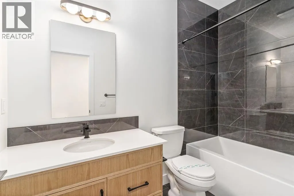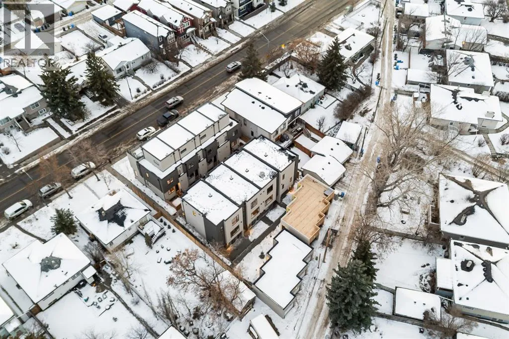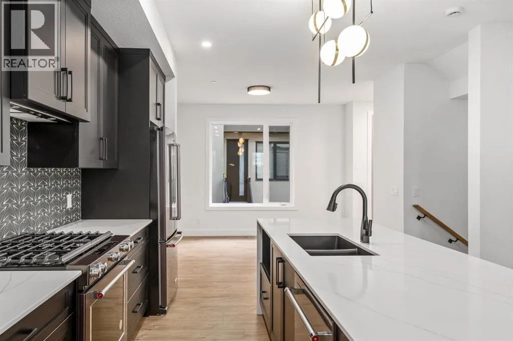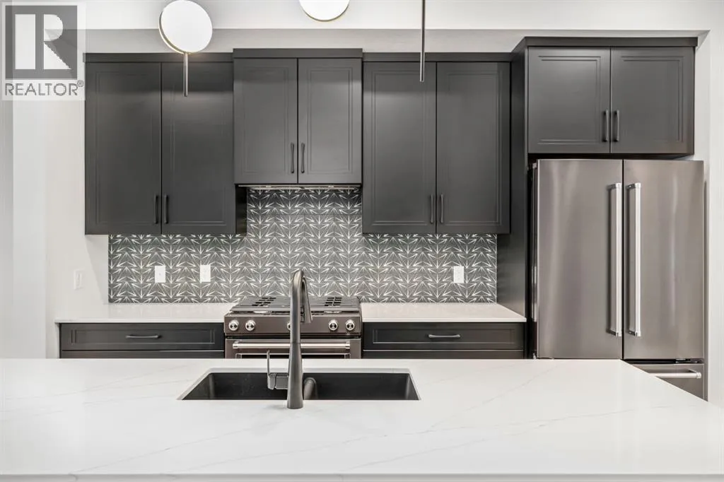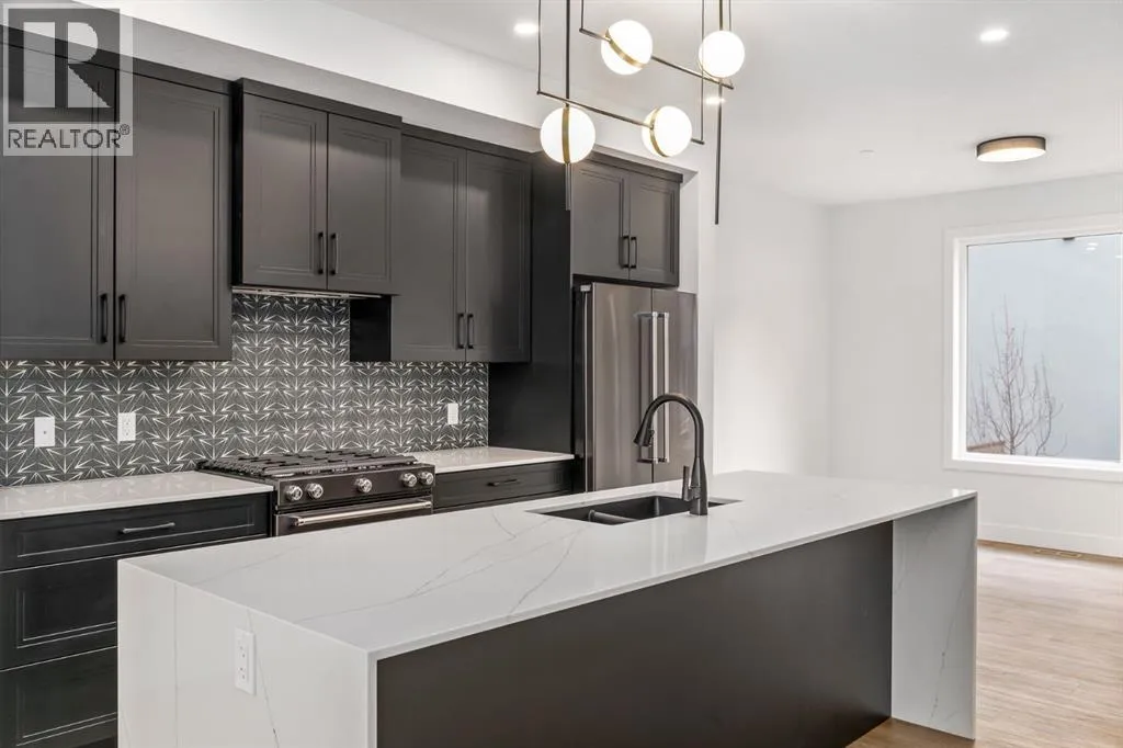 *Builder Incentive to cover all condo fees for first year* This modern townhouse embodies the ideal inner city lifestyle. Constructed by highly acclaimed builder Crystal Creek Homes, this meticulous residence is a testament to keen craftsmanship and spares no details. Luxury vinyl plank flooring, knockdown textured ceilings, and designer light fixtures are merely a few of the elements embedded throughout that truly elevate this home. Enter the impressive foyer and into expansive 9' ceilings, with huge south facing triple-glazed argon fill windows illuminating the living room and adjacent dining area. An open layout leads into the beautifully adorned kitchen, equipped with black stainless steel appliances, complementing black hardware, and geometric tiled backsplash. Quartz countertops, sleek dark cabinetry and a waterfall island with a Blanco Silgranit undermount sink seamlessly create the perfect environment for gastronomy enthusiasts looking to refine their technique, and host intimate gatherings with loved ones. A backyard outdoor amenity space is the opportune addition for summer evening BBQs or to simply enjoy a moment of fresh air. Tucked at the rear is the polished powder room with a highly efficient WaterSense toilet and undermount sink. Ascend the black metal spindled staircase with a durable shaker oak handrail and explore two palatial bedrooms, each with their own four piece ensuite bathrooms embellished with elegant quartz countertops, undermount sinks and wall tile detailing on the bathtub/shower surround all the way up to the ceiling. The primary bedroom includes a spacious walk-in-closet, the perfect accompaniment to the conveniently located stackable front load steam washer and dryer, injecting practicality and comfort into this luxurious offering. Escape to the third level loft, a thoughtfully curated ambience to unwind or entertain. With a unique multi-use area that can be easily converted into a family room, office, or bar/lounge, additional powde r room, and exclusive rooftop patio that offers peeks of the mountains to the west. The undeveloped basement is as spacious as it is versatile, awaiting your personal customizations and individual flare to transform it from the existing sweeping storage space and executing your creative vision. Intricate upgrades include a High Efficiency Two-Stage furnace, Ecobee5 Smart Thermostat, active HRV system, as well as spray foaming of all cantilevers, rim joists and window openings for enhanced insulation. Enjoy all of the perks that come with an inner city townhome lifestyle, including the favourably located garage steps away from your front door, quick commuting times, along with the bonus of having exterior maintenance taken care of for you. Set against the vibrant amenities and attractions found within Marda Loop, this home provides a remarkable opportunity to pamper yourself daily, all while living in a desirable and energetic community centrally positioned with quick access the rest of the city. (id:27476)