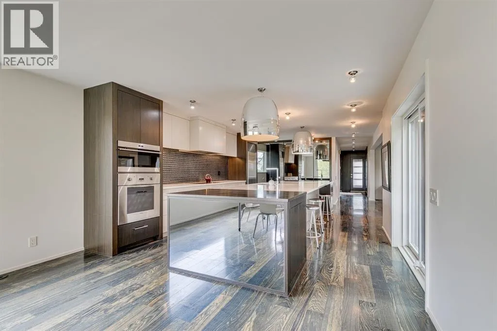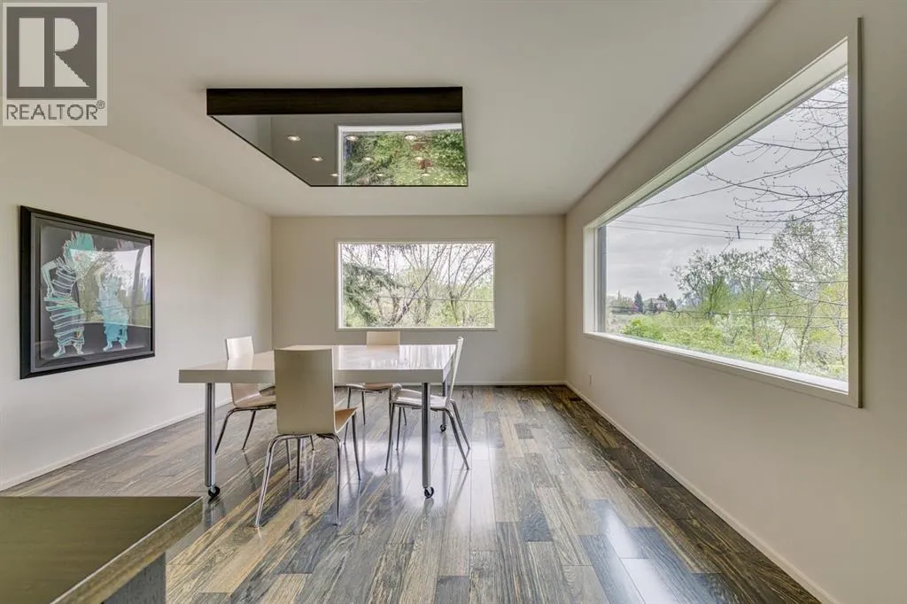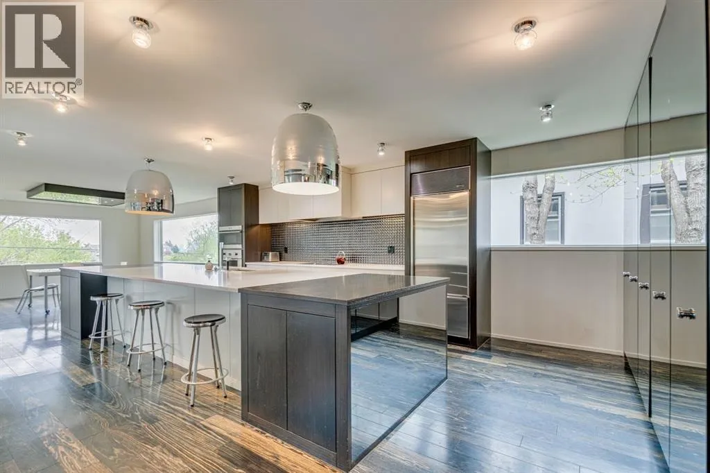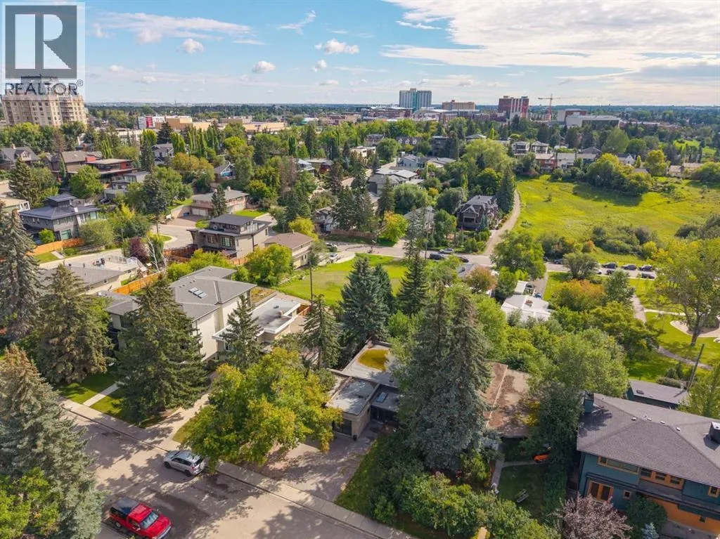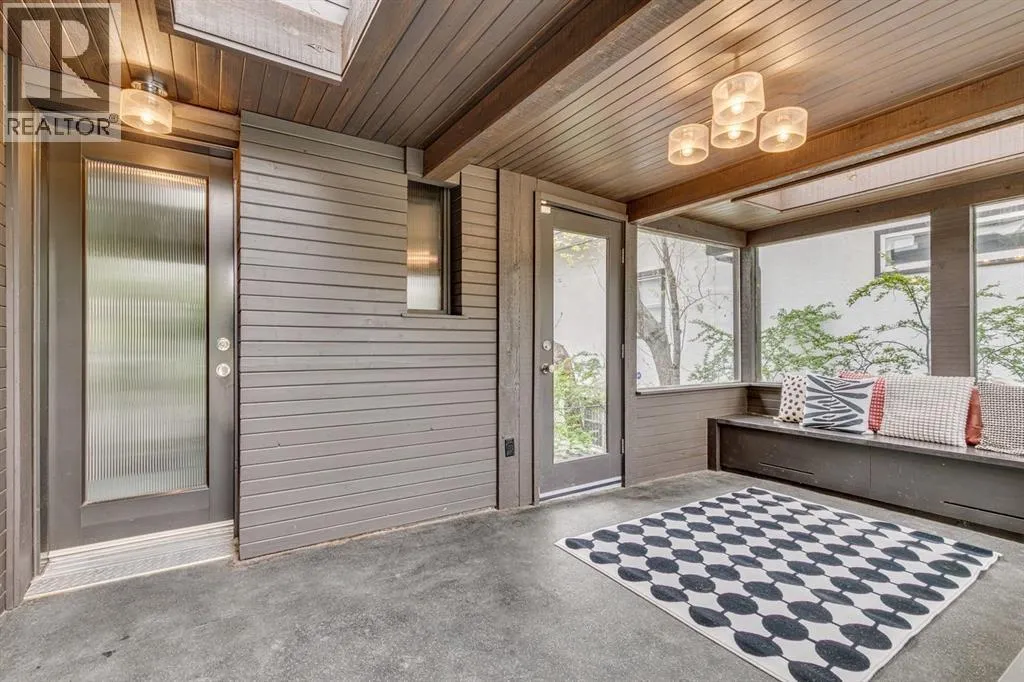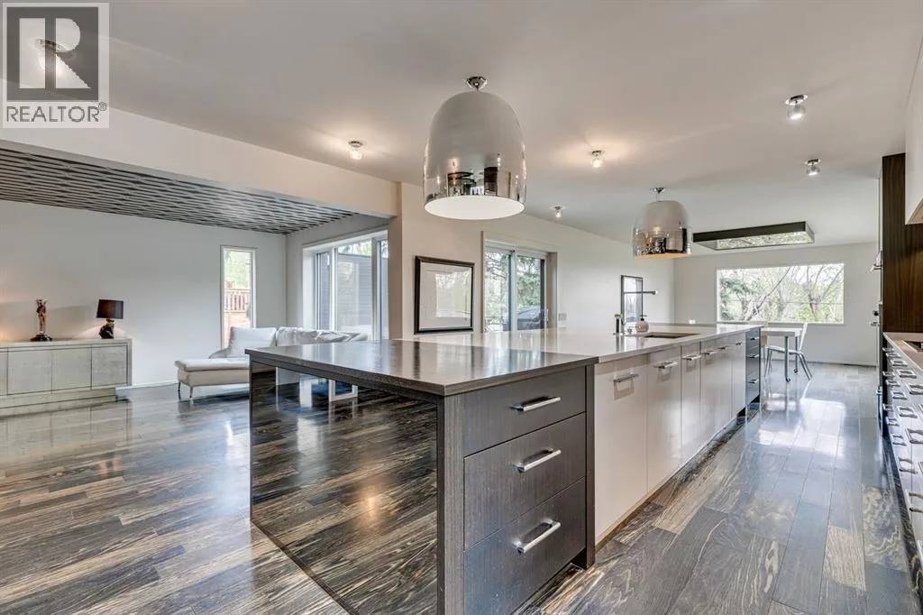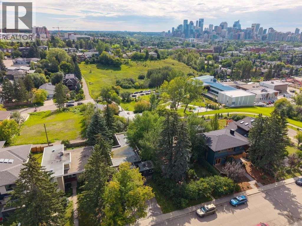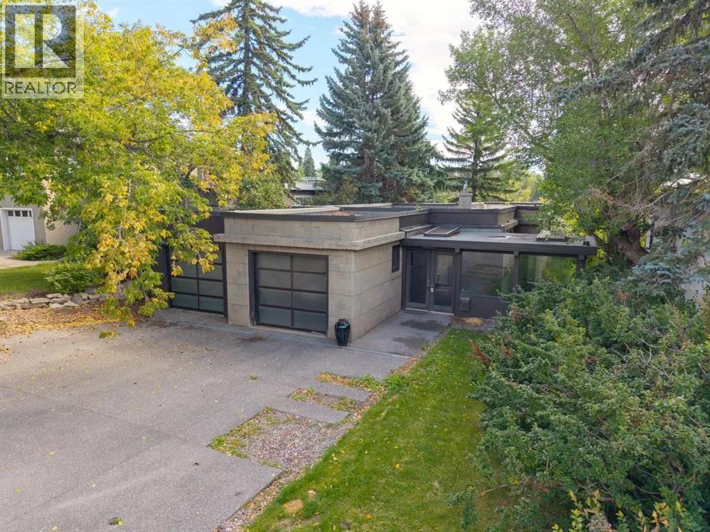 A masterful modern renovation infused with the timeless elegance of 1950s design. Perched on a coveted ridge lot in prestigious Briar Hill, this exceptional hillside walk-out captivates from the moment you arrive. A lush canopy of mature trees and sculpted landscaping welcomes you, setting the tone for what lies beyond. Step into an expansive sunroom bathed in natural light, with soaring skylights and walls of glass that blur the line between indoors and nature. It's the perfect sanctuary to unwindâwhether you're sipping a fine wine or indulging in a favourite novel, enveloped in serene beauty. Step into a grand foyer featuring sculptural concrete wall elements and a sleek glass-railed staircase that set the tone for sophisticated living. The front den offers a quiet retreat, while the expansive living room seamlessly flows toward the rear deck, perfectly framed by mature evergreens that provide unparalleled privacy. Crafted for both style and function, the kitchen and dining areas are an entertainerâs dream. The kitchen exudes contemporary glamour with pristine white cabinetry, a mirrored pantry and backsplash, and mid-century lighting. An oversized eat-up island anchors the space, offering abundant storage, while a suite of top-tier appliances, including a Viking wall oven, Miele microwave and dishwasher, a Sub-Zero refrigerator, and a Gaggenau cooktop complete the look. The adjoining dining room is truly impressive in scale and design, offering sweeping views of the Downtown skyline, a stunning backdrop for unforgettable gatherings. Descending to the lower level, you're greeted by rich hardwood floors and subtle stair lighting that create an inviting ambiance. This level is thoughtfully designed as a private retreat, with dedicated spaces for work and rest. The sophisticated home office is enclosed with smoked glass doors and enhanced by custom built-in cabinetry, while a striking feature wall conceals cleverly integrated storage. Three generously sized bedrooms are tucked away on this level, along with a beautifully appointed full bathroom. The primary suite is set apart for ultimate seclusion, enveloped by expansive windows that frame the surrounding landscape. Indulge in a lavish ensuite featuring a deep soaker tub, a sleek glass enclosed shower, and a fully customized walk-in closetâcrafted for both luxury and functionality. For the gardening enthusiast, the secluded rear and side yards offer a canvas to create your own private outdoor sanctuary; lush, serene, and tailored to your vision. Thoughtfully integrated into the design, an expansive under deck storage area provides a secure and discreet solution for all your seasonal essentials, ensuring both elegance and practicality are maintained. This Homs is truly in an unbeatable location ideally situated within walking distance to multiple recreational facilities, public transit, the downtown core, Kensington, SAIT, schools, and both the Foothills and The Alberta Children's Hospital. (id:27476)