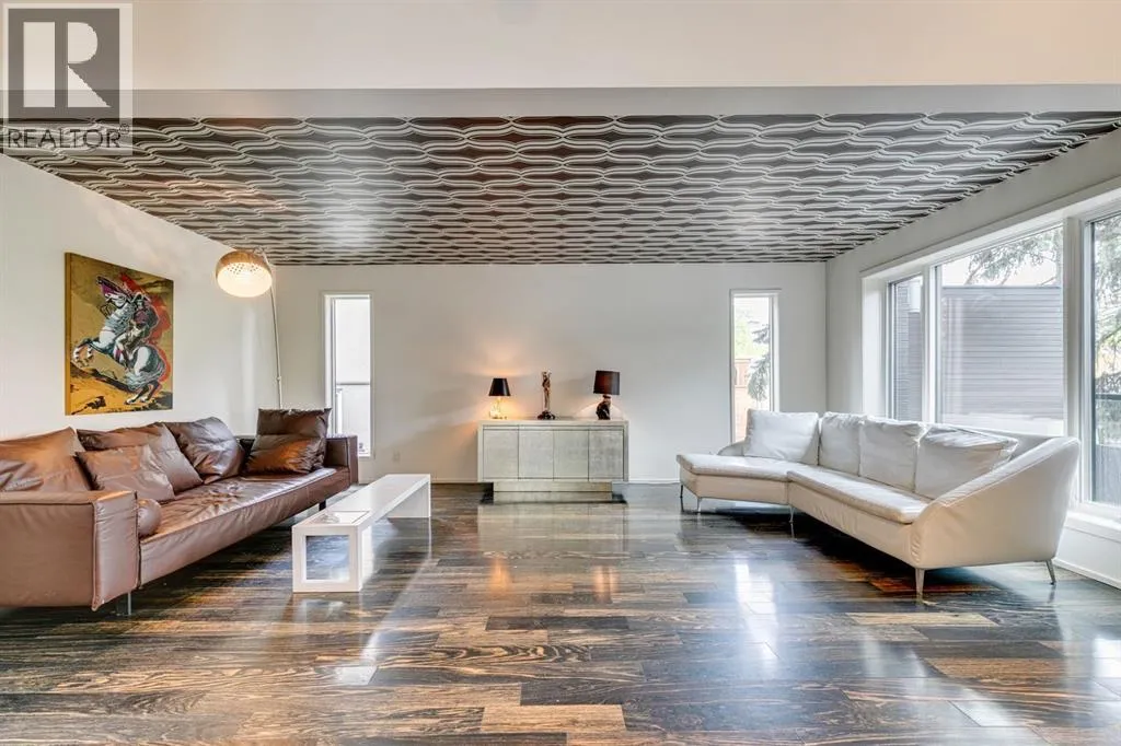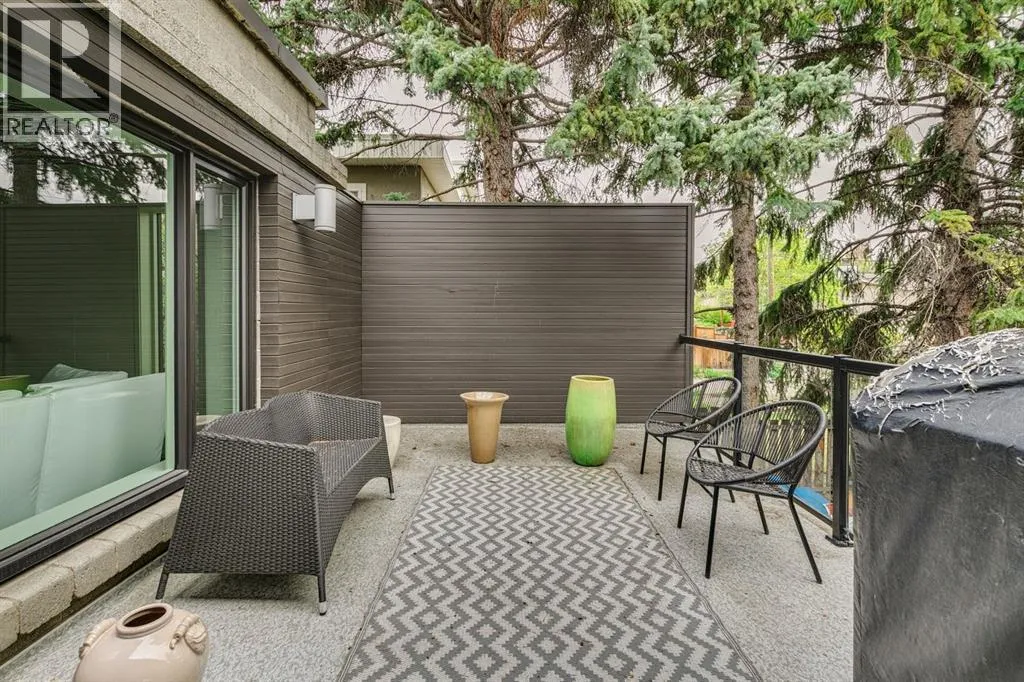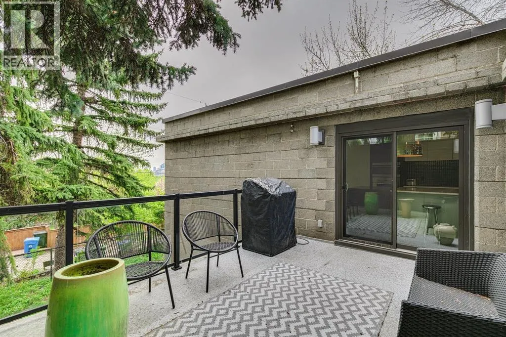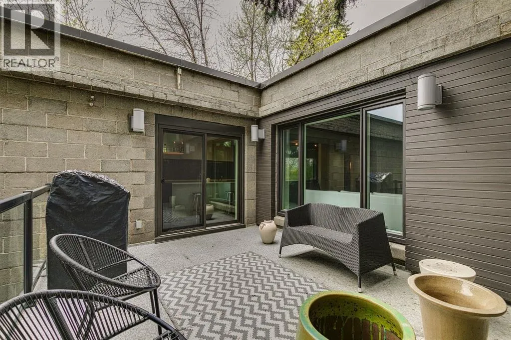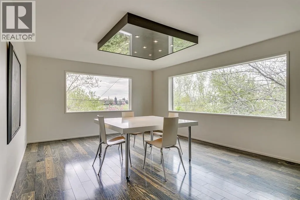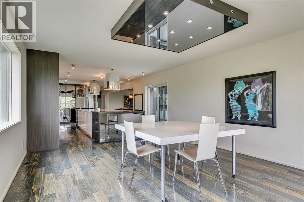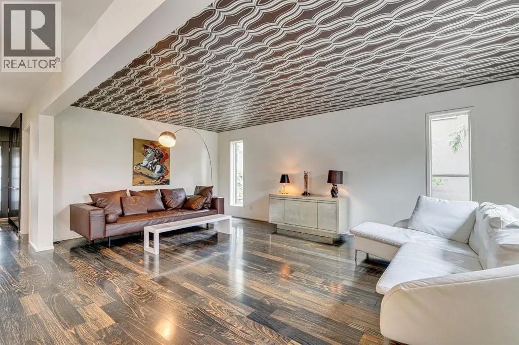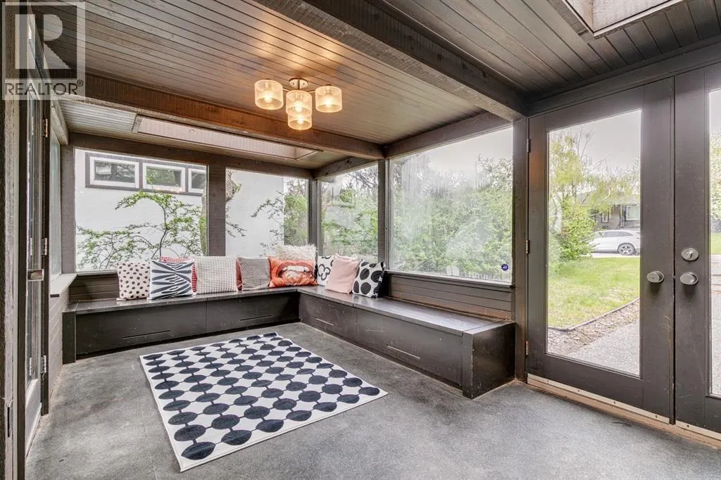 A masterful modern renovation infused with the timeless elegance of 1950s design. Perched on a coveted ridge lot in prestigious Briar Hill, this exceptional hillside walk-out captivates from the moment you arrive. A lush canopy of mature trees and sculpted landscaping welcomes you, setting the tone for what lies beyond. Step into an expansive sunroom bathed in natural light, with soaring skylights and walls of glass that blur the line between indoors and nature. It's the perfect sanctuary to unwindâwhether you're sipping a fine wine or indulging in a favourite novel, enveloped in serene beauty. Step into a grand foyer featuring sculptural concrete wall elements and a sleek glass-railed staircase that set the tone for sophisticated living. The front den offers a quiet retreat, while the expansive living room seamlessly flows toward the rear deck, perfectly framed by mature evergreens that provide unparalleled privacy. Crafted for both style and function, the kitchen and dining areas are an entertainerâs dream. The kitchen exudes contemporary glamour with pristine white cabinetry, a mirrored pantry and backsplash, and mid-century lighting. An oversized eat-up island anchors the space, offering abundant storage, while a suite of top-tier appliances, including a Viking wall oven, Miele microwave and dishwasher, a Sub-Zero refrigerator, and a Gaggenau cooktop complete the look. The adjoining dining room is truly impressive in scale and design, offering sweeping views of the Downtown skyline, a stunning backdrop for unforgettable gatherings. Descending to the lower level, you're greeted by rich hardwood floors and subtle stair lighting that create an inviting ambiance. This level is thoughtfully designed as a private retreat, with dedicated spaces for work and rest. The sophisticated home office is enclosed with smoked glass doors and enhanced by custom built-in cabinetry, while a striking feature wall conceals cleverly integrated storage. Three generously sized bedrooms are tucked away on this level, along with a beautifully appointed full bathroom. The primary suite is set apart for ultimate seclusion, enveloped by expansive windows that frame the surrounding landscape. Indulge in a lavish ensuite featuring a deep soaker tub, a sleek glass enclosed shower, and a fully customized walk-in closetâcrafted for both luxury and functionality. For the gardening enthusiast, the secluded rear and side yards offer a canvas to create your own private outdoor sanctuary; lush, serene, and tailored to your vision. Thoughtfully integrated into the design, an expansive under deck storage area provides a secure and discreet solution for all your seasonal essentials, ensuring both elegance and practicality are maintained. This Homs is truly in an unbeatable location ideally situated within walking distance to multiple recreational facilities, public transit, the downtown core, Kensington, SAIT, schools, and both the Foothills and The Alberta Children's Hospital. (id:27476)
