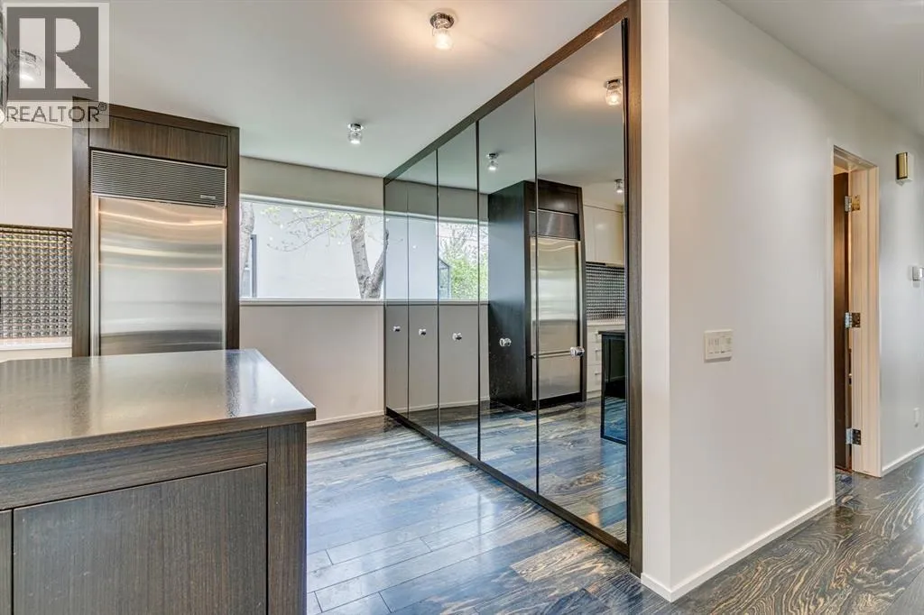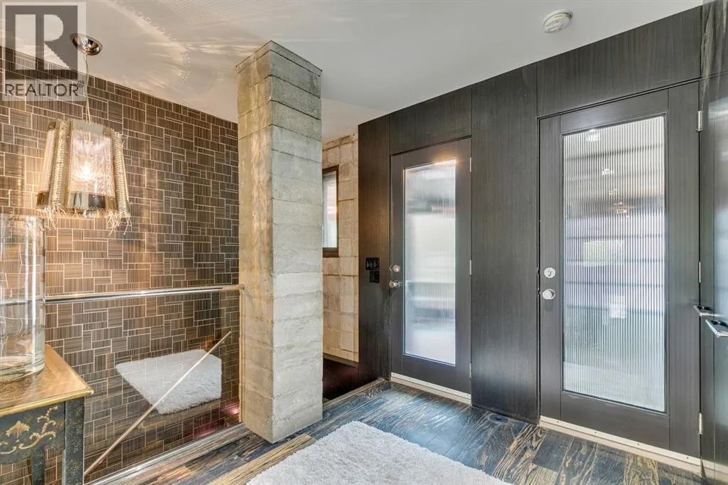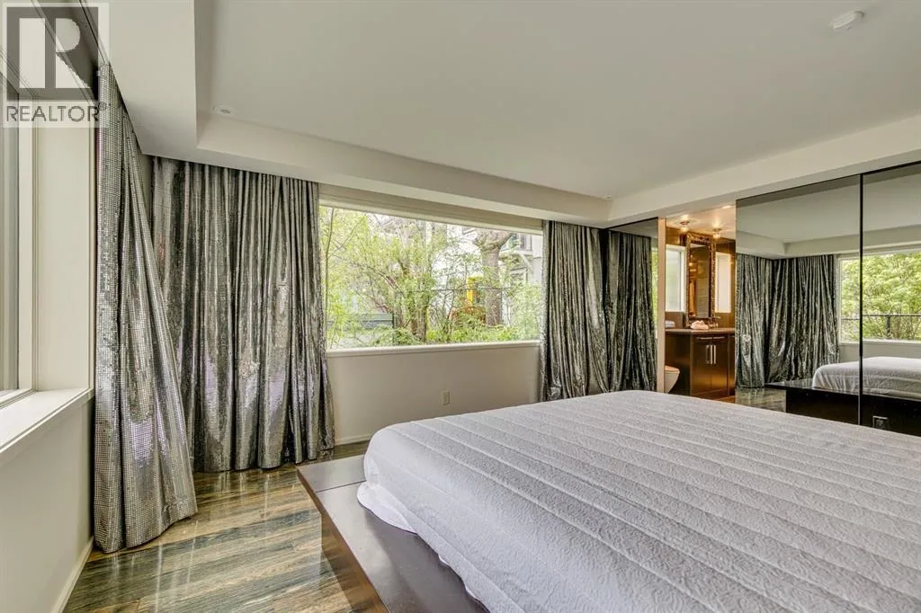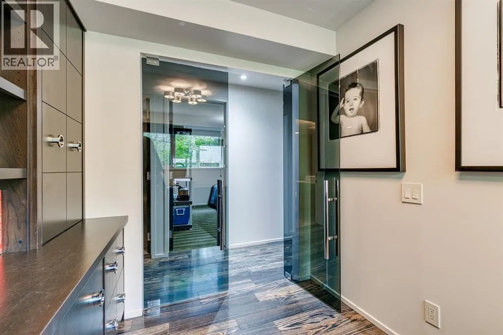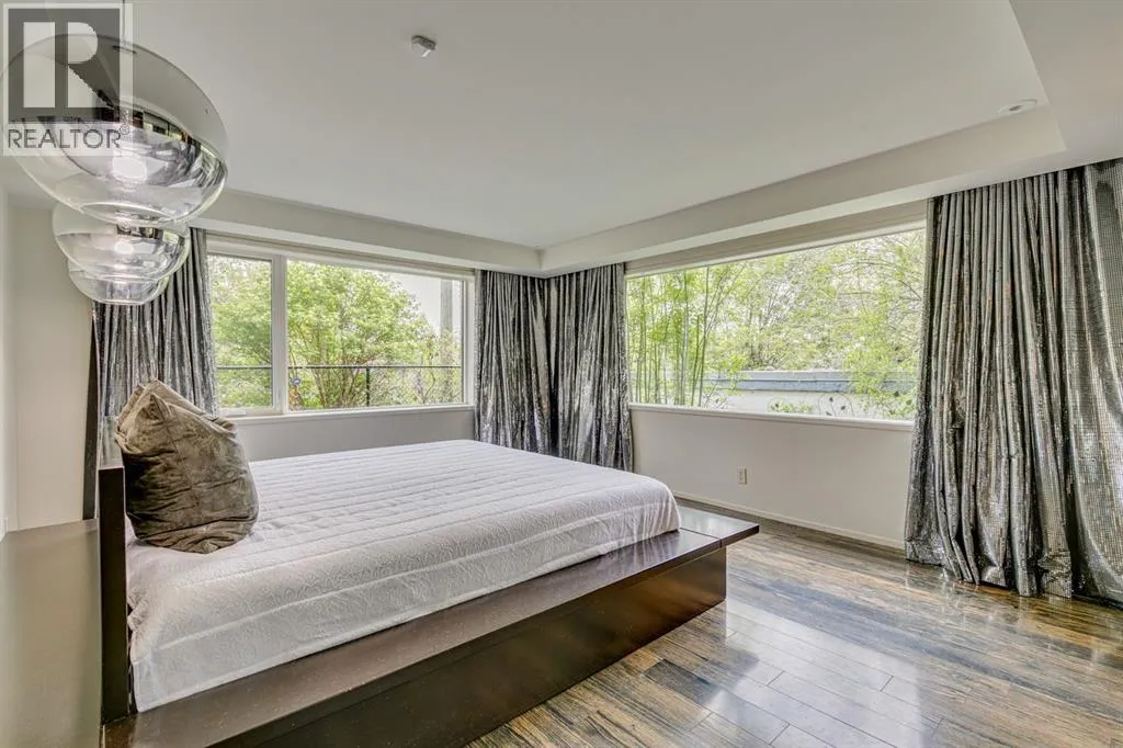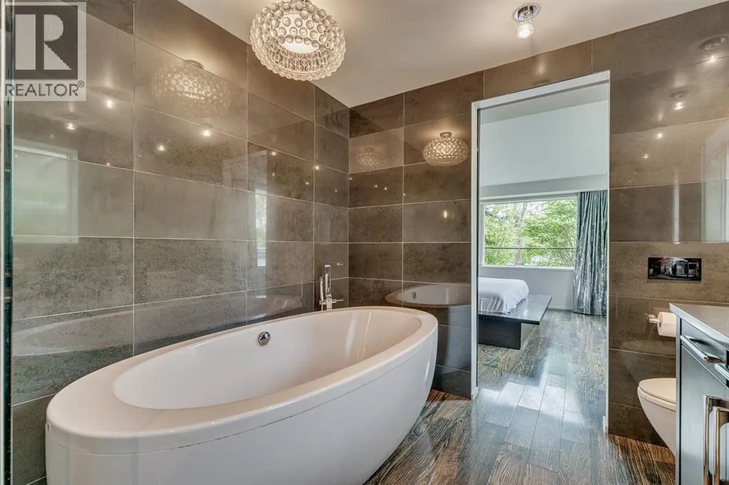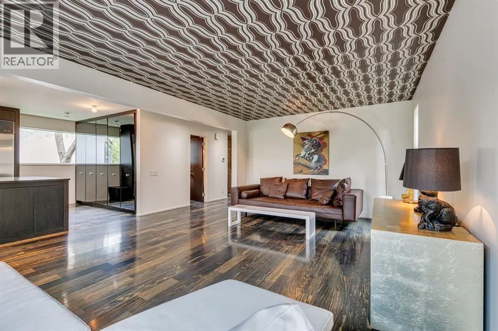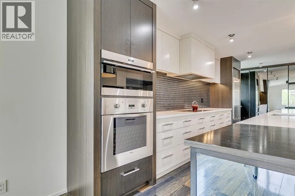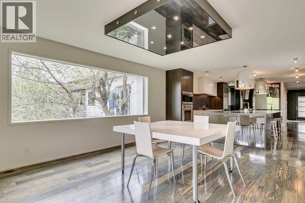 A masterful modern renovation infused with the timeless elegance of 1950s design. Perched on a coveted ridge lot in prestigious Briar Hill, this exceptional hillside walk-out captivates from the moment you arrive. A lush canopy of mature trees and sculpted landscaping welcomes you, setting the tone for what lies beyond. Step into an expansive sunroom bathed in natural light, with soaring skylights and walls of glass that blur the line between indoors and nature. It's the perfect sanctuary to unwindâwhether you're sipping a fine wine or indulging in a favourite novel, enveloped in serene beauty. Step into a grand foyer featuring sculptural concrete wall elements and a sleek glass-railed staircase that set the tone for sophisticated living. The front den offers a quiet retreat, while the expansive living room seamlessly flows toward the rear deck, perfectly framed by mature evergreens that provide unparalleled privacy. Crafted for both style and function, the kitchen and dining areas are an entertainerâs dream. The kitchen exudes contemporary glamour with pristine white cabinetry, a mirrored pantry and backsplash, and mid-century lighting. An oversized eat-up island anchors the space, offering abundant storage, while a suite of top-tier appliances, including a Viking wall oven, Miele microwave and dishwasher, a Sub-Zero refrigerator, and a Gaggenau cooktop complete the look. The adjoining dining room is truly impressive in scale and design, offering sweeping views of the Downtown skyline, a stunning backdrop for unforgettable gatherings. Descending to the lower level, you're greeted by rich hardwood floors and subtle stair lighting that create an inviting ambiance. This level is thoughtfully designed as a private retreat, with dedicated spaces for work and rest. The sophisticated home office is enclosed with smoked glass doors and enhanced by custom built-in cabinetry, while a striking feature wall conceals cleverly integrated storage. Three generously sized bedrooms are tucked away on this level, along with a beautifully appointed full bathroom. The primary suite is set apart for ultimate seclusion, enveloped by expansive windows that frame the surrounding landscape. Indulge in a lavish ensuite featuring a deep soaker tub, a sleek glass enclosed shower, and a fully customized walk-in closetâcrafted for both luxury and functionality. For the gardening enthusiast, the secluded rear and side yards offer a canvas to create your own private outdoor sanctuary; lush, serene, and tailored to your vision. Thoughtfully integrated into the design, an expansive under deck storage area provides a secure and discreet solution for all your seasonal essentials, ensuring both elegance and practicality are maintained. This Homs is truly in an unbeatable location ideally situated within walking distance to multiple recreational facilities, public transit, the downtown core, Kensington, SAIT, schools, and both the Foothills and The Alberta Children's Hospital. (id:27476)