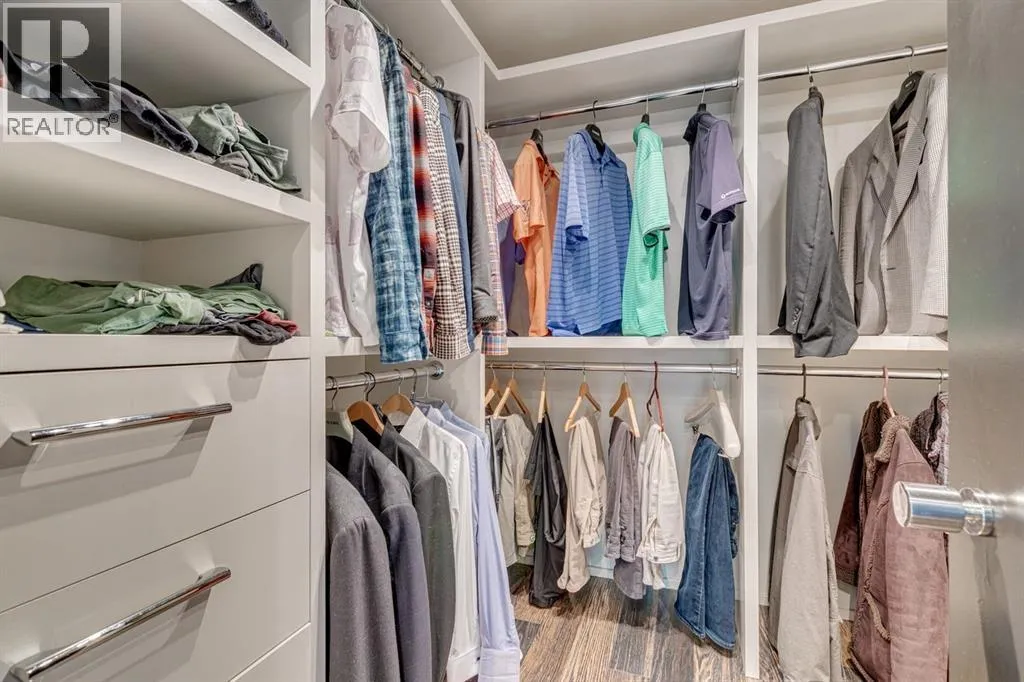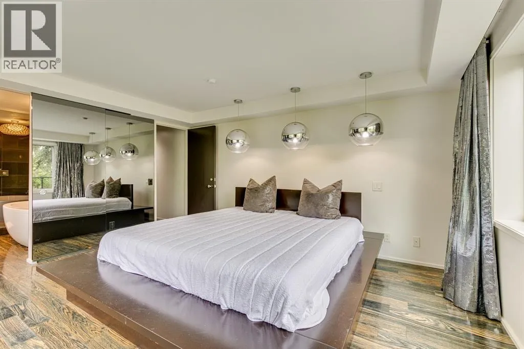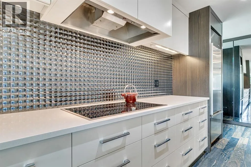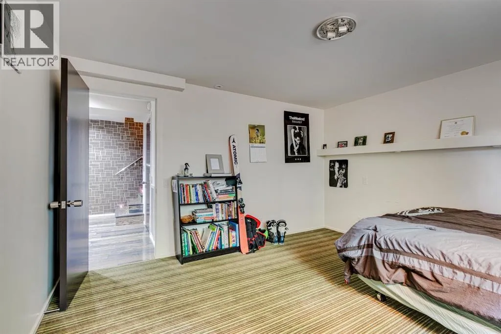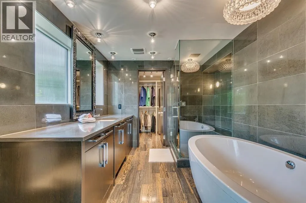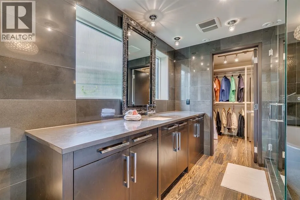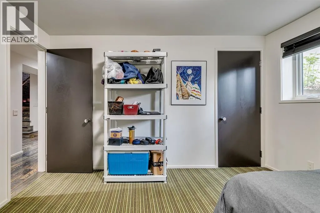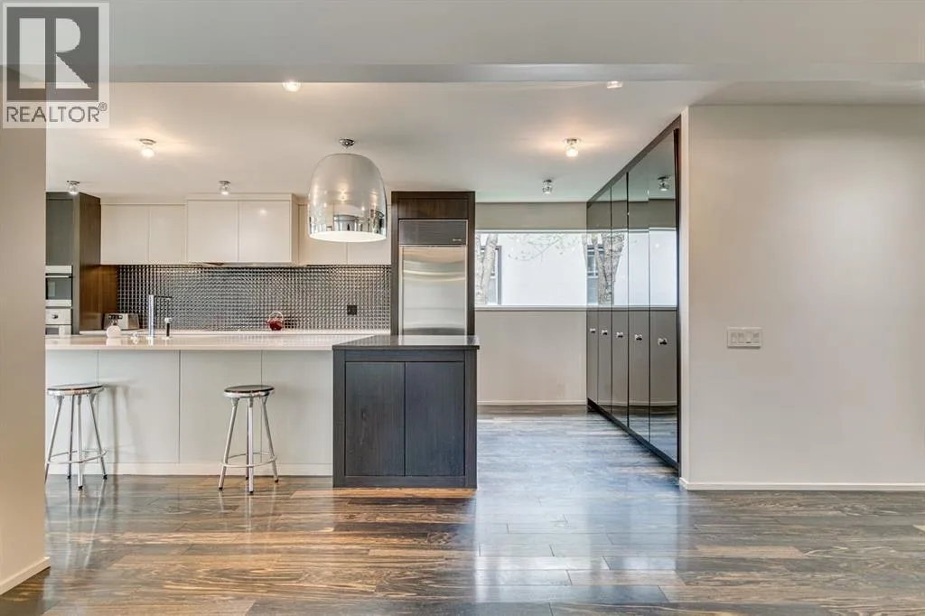 A masterful modern renovation infused with the timeless elegance of 1950s design. Perched on a coveted ridge lot in prestigious Briar Hill, this exceptional hillside walk-out captivates from the moment you arrive. A lush canopy of mature trees and sculpted landscaping welcomes you, setting the tone for what lies beyond. Step into an expansive sunroom bathed in natural light, with soaring skylights and walls of glass that blur the line between indoors and nature. It's the perfect sanctuary to unwindâwhether you're sipping a fine wine or indulging in a favourite novel, enveloped in serene beauty. Step into a grand foyer featuring sculptural concrete wall elements and a sleek glass-railed staircase that set the tone for sophisticated living. The front den offers a quiet retreat, while the expansive living room seamlessly flows toward the rear deck, perfectly framed by mature evergreens that provide unparalleled privacy. Crafted for both style and function, the kitchen and dining areas are an entertainerâs dream. The kitchen exudes contemporary glamour with pristine white cabinetry, a mirrored pantry and backsplash, and mid-century lighting. An oversized eat-up island anchors the space, offering abundant storage, while a suite of top-tier appliances, including a Viking wall oven, Miele microwave and dishwasher, a Sub-Zero refrigerator, and a Gaggenau cooktop complete the look. The adjoining dining room is truly impressive in scale and design, offering sweeping views of the Downtown skyline, a stunning backdrop for unforgettable gatherings. Descending to the lower level, you're greeted by rich hardwood floors and subtle stair lighting that create an inviting ambiance. This level is thoughtfully designed as a private retreat, with dedicated spaces for work and rest. The sophisticated home office is enclosed with smoked glass doors and enhanced by custom built-in cabinetry, while a striking feature wall conceals cleverly integrated storage. Three generously sized bedrooms are tucked away on this level, along with a beautifully appointed full bathroom. The primary suite is set apart for ultimate seclusion, enveloped by expansive windows that frame the surrounding landscape. Indulge in a lavish ensuite featuring a deep soaker tub, a sleek glass enclosed shower, and a fully customized walk-in closetâcrafted for both luxury and functionality. For the gardening enthusiast, the secluded rear and side yards offer a canvas to create your own private outdoor sanctuary; lush, serene, and tailored to your vision. Thoughtfully integrated into the design, an expansive under deck storage area provides a secure and discreet solution for all your seasonal essentials, ensuring both elegance and practicality are maintained. This Homs is truly in an unbeatable location ideally situated within walking distance to multiple recreational facilities, public transit, the downtown core, Kensington, SAIT, schools, and both the Foothills and The Alberta Children's Hospital. (id:27476)