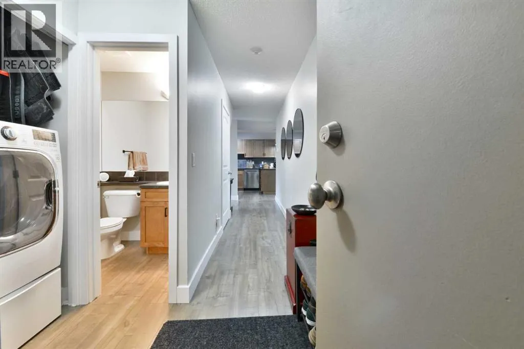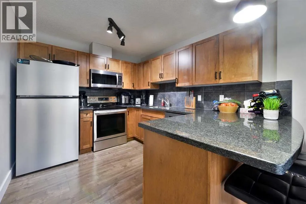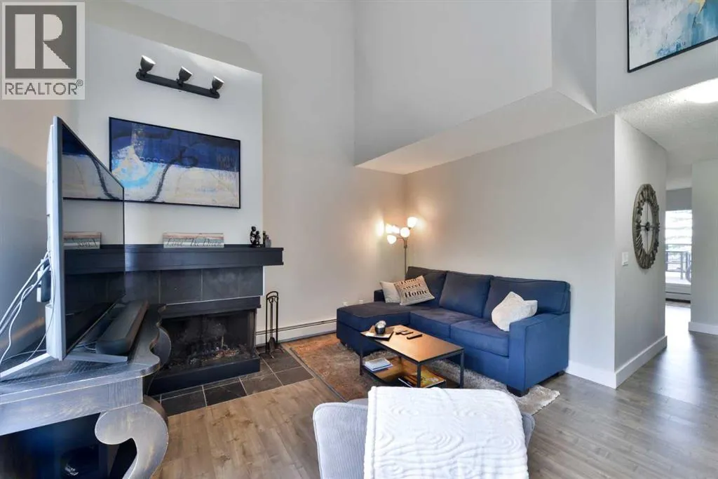 Welcome to the News on Broadcast Hill! Located in the desirable community of Patterson, this beautifully maintained and updated top floor condo offers spacious 2 bedrooms, 1.5 bathroom with 2 heated parking spots is the perfect blend of urban design and sophisticated living. As you step into this inviting condo, you're greeted by a bright, modern hallway with durable laminate flooring that flows throughout the main floor. The functional entry area includes a convenient in-suite laundry closet, a tucked-away storage closet, and easy access to a stylish, well-appointed bathroom. Moving into the heart of the home, the hallway seamlessly flows into the open-concept kitchen, This space is a culinary delight, featuring warm wood cabinetry, sleek granite countertops, a stylish tile backsplash, and recently updated stainless steal appliances. The central island provides a perfect spot for casual dining or meal prep, while modern pendant lighting adds a touch of elegance. Beyond the kitchen, a cozy dining or reading nook provides a perfect space to relax, with direct access to a private patio through large sliding glass doors. The patio, ideal for a BBQ and outdoor seating, extends your living space outdoors and offers a peaceful retreat. As you move towards the living room, you are greeted by a perfect space for a dedicated home office or a stylish mini bar area, cleverly utilizing the open layout. To finish off the main floor the open-concept living and dining area is a true showstopper, boasting soaring vaulted ceilings and that durable laminate flooring. A cozy wood burning fireplace with a modern tile surround creates a perfect focal point, while large windows and sliding doors flood the space with natural light and provide access to the patio that overlooks a quiet greenspace. As you venture up the stairs, you'll discover the private living quarters, which feel bright and airy with a view of the living room below. This level features two spacious bedrooms with plush c arpeting and a beautifully appointed four-piece bathroom. The stylish bathroom is a true retreat, boasting a modern vanity, a separate glass shower, a relaxing soaker tub, and contemporary dark tile accents.Additional features of this unit include TWO assigned heated underground parking stalls, an assigned storage locker, condo fees that cover heat, water/sewer, access to an amenities center which is conveniently located next to the unit building and has an indoor pool, hot tub, gym, meeting/ party room and a tennis court. Located conveniently close to schools, parks, walking paths, and public transportation, with just a short commute to downtown -- Don't miss this opportunity to own a well-maintained home in a complex with a unique claim to fame, having once housed athletes during the Calgary Olympics. (id:27476)