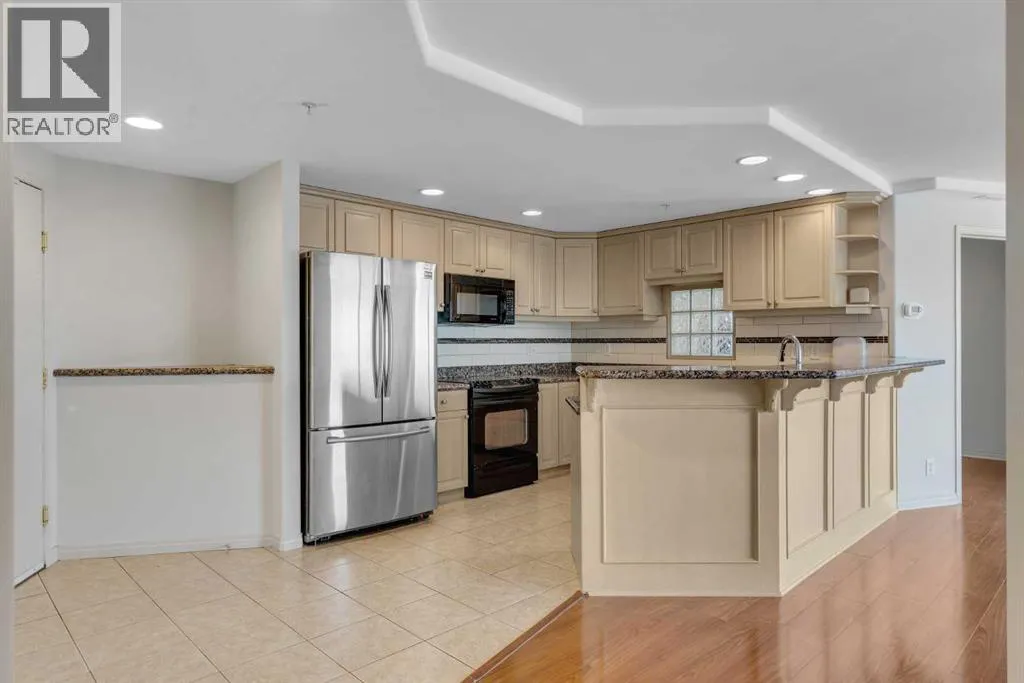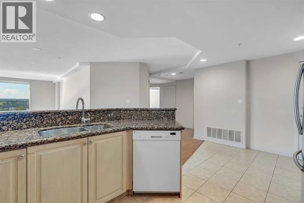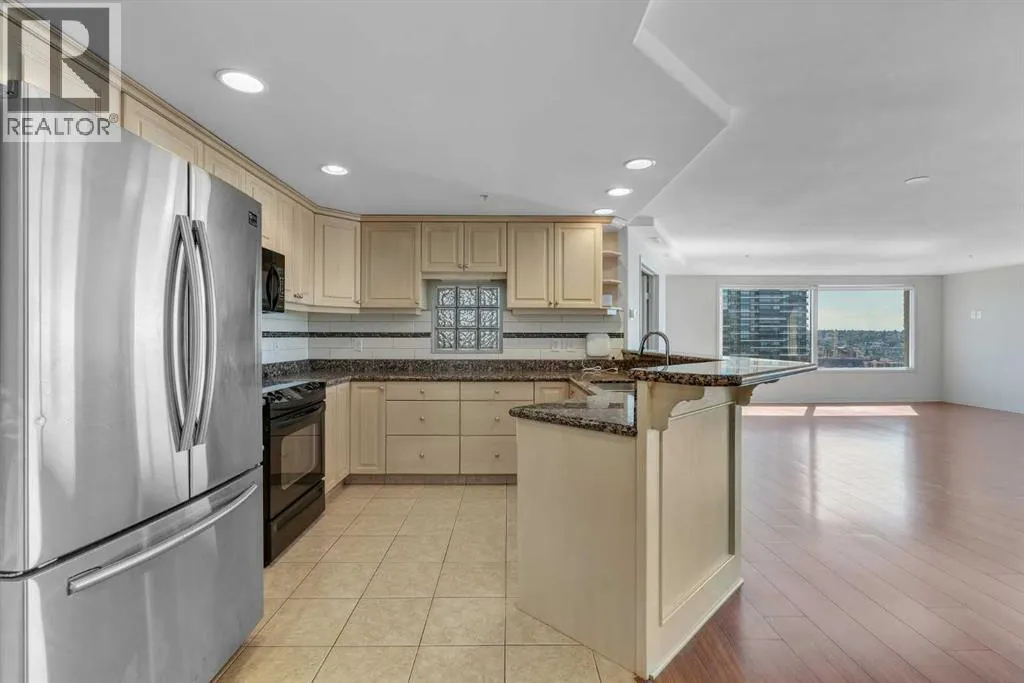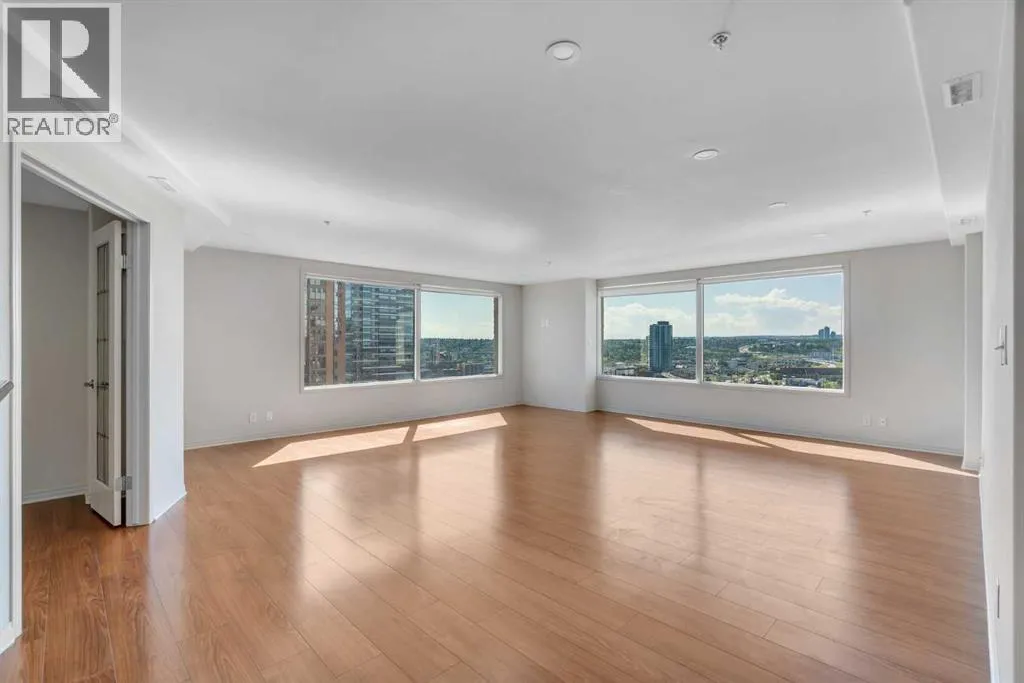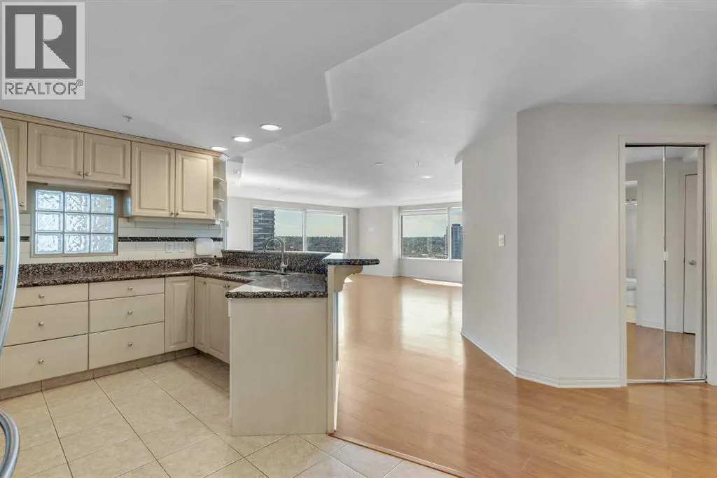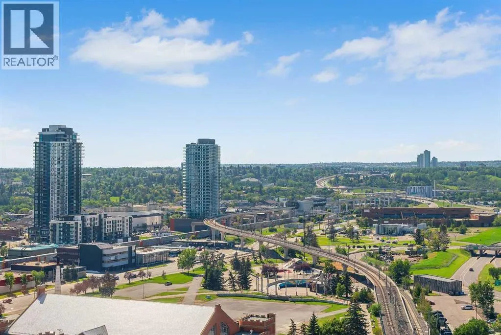 Unparalleled, Spectacular PANORAMIC VIEWS of the mountains, Bow River, and sparkling city lights! This nearly 1,600 sq. ft. luxury condo offers 2 bedrooms plus a den, 2 full baths, and 2 secure titled, underground parking stalls. Beautifully updated with hardwood floors, new carpet, fresh paint, and custom window coverings. Expansive windows fill the open living space with natural light, highlighting the raised panel cabinetry, granite countertops, pot lighting, and quality finishes throughout. Enjoy year-round comfort with full air conditioning and the sought-after south and west exposure. Ideally located in West Downtown with the Kerby LRT station right at your doorstep, and just steps to Shaw Millennium Park, river pathways, and all the conveniences of the city. Easy in-and-out access to downtown makes this the perfect urban retreat. This is the place to "right-size"! (id:27476)