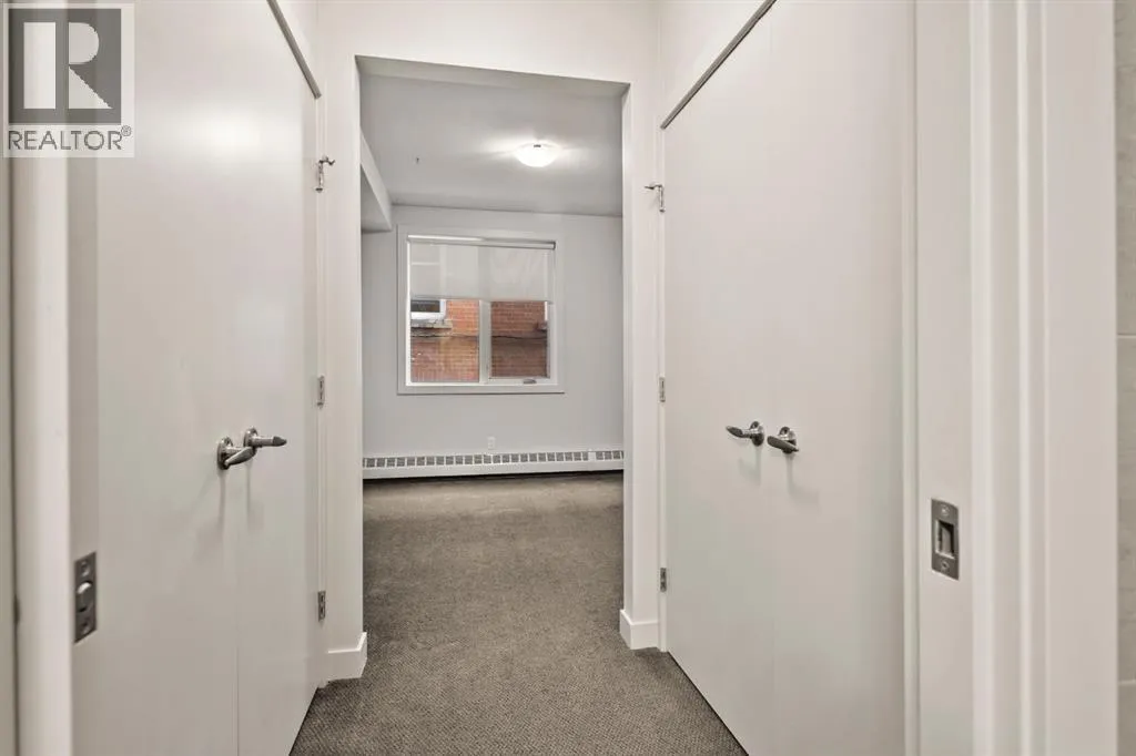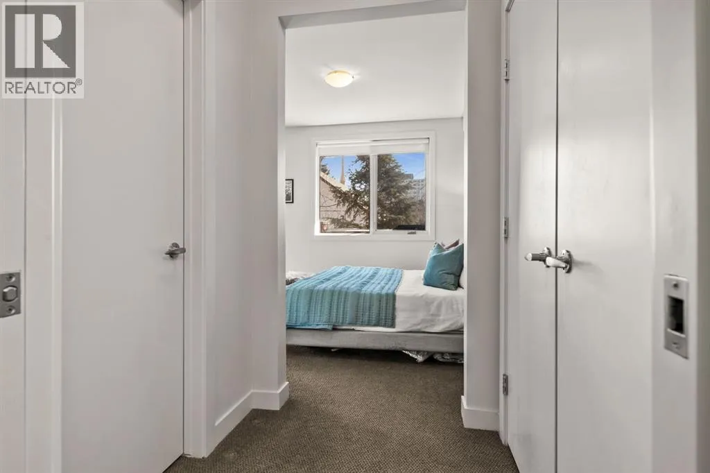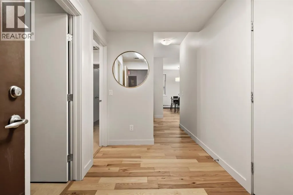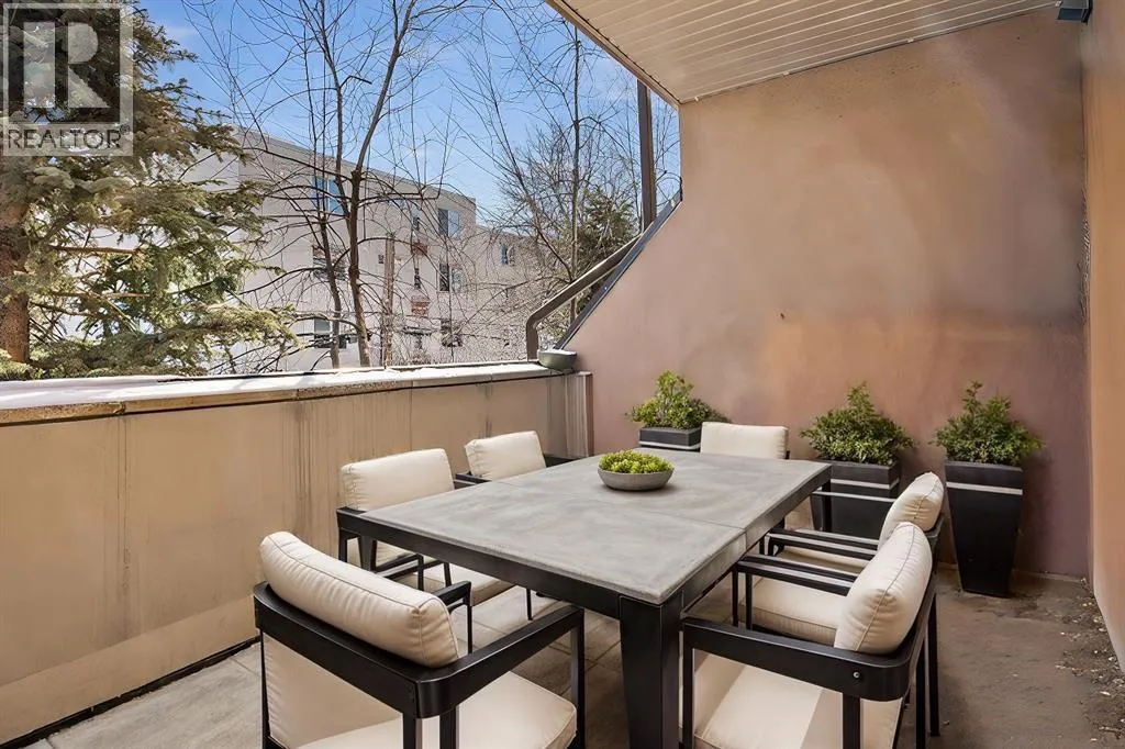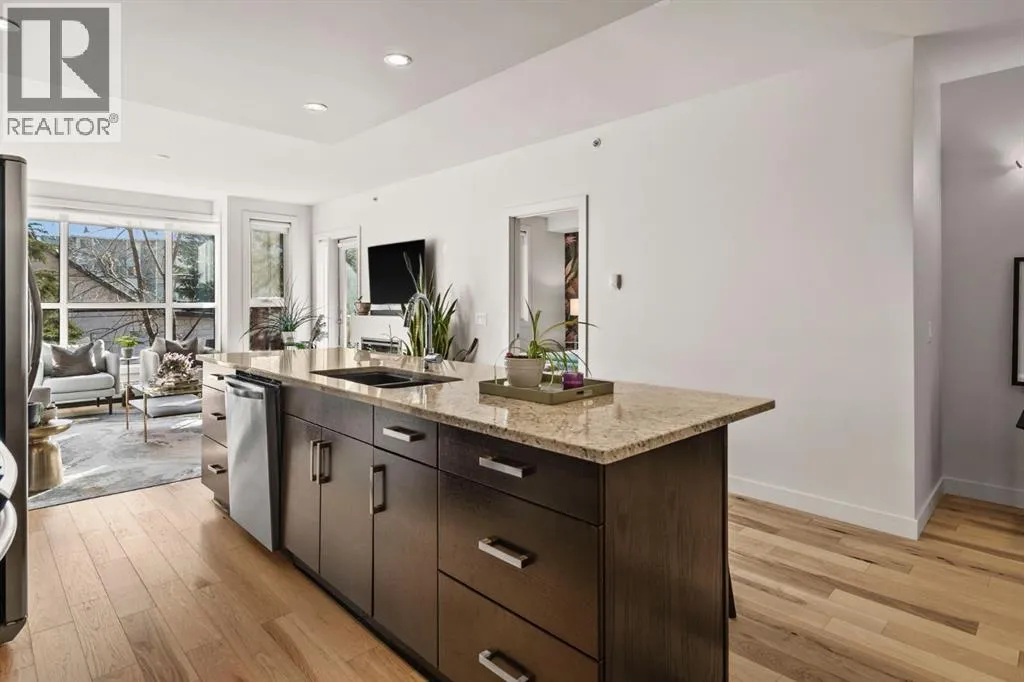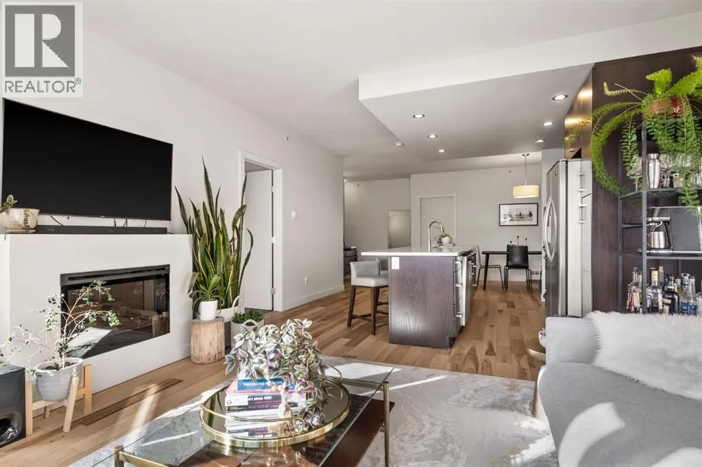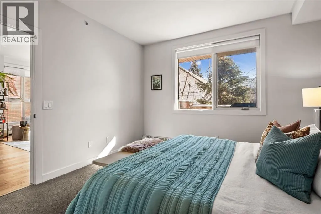 Welcome to unit #203 in the stylish Tweed building. This concrete-built low rise residence is tucked away on a quiet street between Calgaryâs buzzing 17th Avenue and the coveted Mission neighbourhoods. Here, you are steps from the cityâs best dining, cafés, boutiques, and nightlife, yet surrounded by the charm of mature trees and a neighbourly atmosphere.This second floor corner unit invites you in with an airy, open-concept design bathed in morning light from floor-to-ceiling east-facing windows. Recently updated, light wood flooring, tall ceilings, and a sleek gas fireplace create a welcoming, yet modern tone. The kitchen blends beauty and function with a large stone-topped island, stainless steel appliances, and flat-panel wood cabinetry, while the dining space sets the stage for everything from lively dinner parties to quiet meals at home.The primary suite is a personal retreat with statement wallpaper, both a walk-in and walk-up closet, and a spacious ensuite featuring double vanities, a large shower, and linen storage. The second bedroom has its own ensuite, ideal for guests, roommates, or a dedicated home office.Step outside to your private, tree-shielded patio with a gas hookup for barbecue, perfect for unwinding after the day. Additional perks include in-suite laundry, window coverings, a titled underground parking stall, and an assigned storage locker. Concrete construction ensures quiet, private living, while the buildingâs intimate scaleâtwo elevators serving only four storeysâadds to its boutique appeal.With a well-managed condo board, healthy reserve fund, and strong owner occupancy, this move-in-ready home delivers on style, location, and lifestyle. Whether itâs your first home, a sophisticated upgrade, or an investment in one of Calgaryâs most walkable communities, unit 203 in the Tweed offers the perfect blend of city energy and retreat-like comfort. (id:27476)