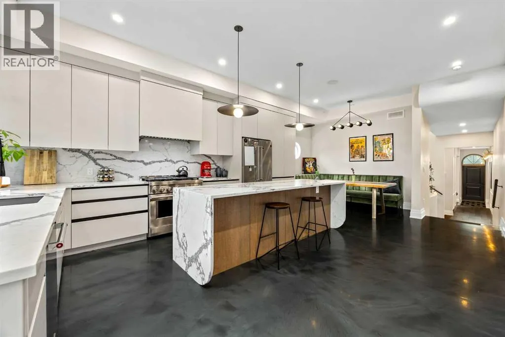 This is Ramsay living at its finest. Perched on one of the most coveted streets in the neighbourhood, this custom brownstone by boutique builder Icon Design and Development, with architecture by John Trinh & Associates and interiors by Studio Felix, gives you unbeatable views over the community and skyline. Plus, youâre just minutes from Inglewood, the Elbow and Bow River pathways, and quick access to Blackfoot Trail, Macleod Trail, and Deerfoot Trail to get anywhere in the city fast. Inside, every detail is dialed in. The main floor has heated polished concrete floors (yes, warm concrete), a showpiece fireplace, and distinctive custom millwork you wonât find in a builder-grade home. The kitchen is built for people who love to cook and host, with a massive island, high-end gas range, and loads of storage. Thereâs even a home bar with beer taps for when friends drop by. Upstairs youâll find three big bedrooms, including a primary suite with a spa-style ensuite and walk-in closet. In the lower level, you will find an excellent flex space! The west-facing backyard is private and tiered to make the most of the views. Itâs low-maintenance, has plenty of space to relax, and yes â thereâs already a hot tub waiting for you. The heated attached garage (rare for Ramsay) is oversized and tandem, perfect for your gear, hobbies, and Calgary winters. Homes like this donât come up often here. Ramsay gives you that small-town feel in the middle of the city, and Maggie Street is as good as it gets. For more info and photos, click the links below! (id:27476)