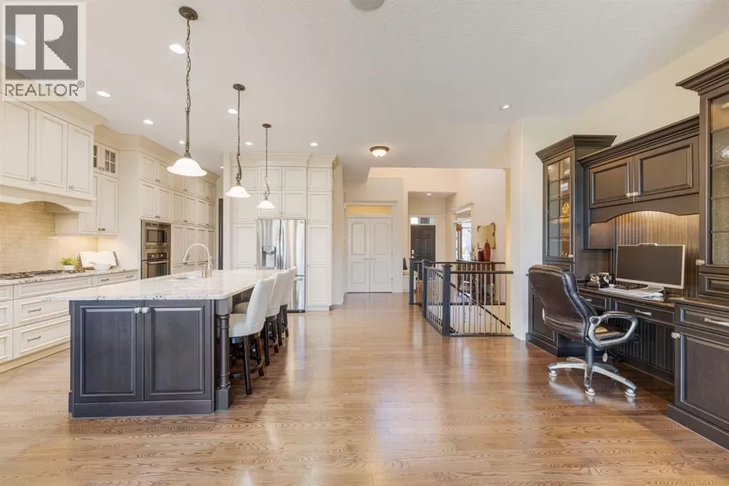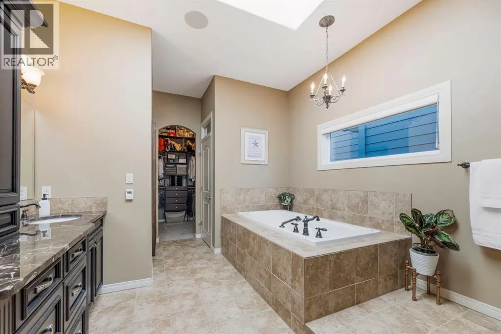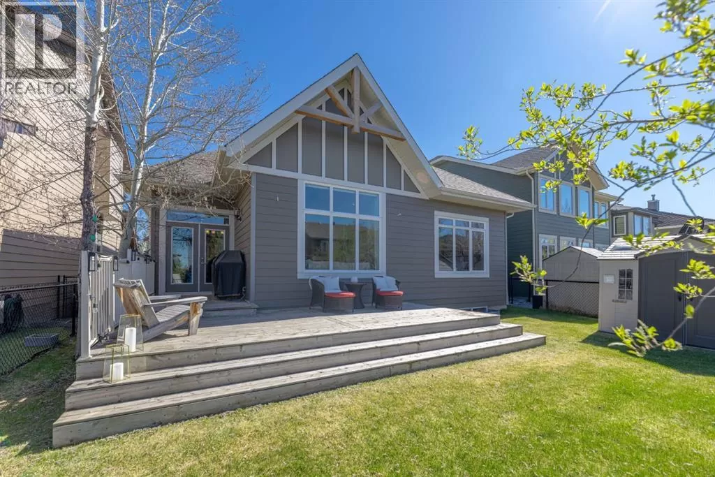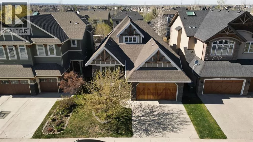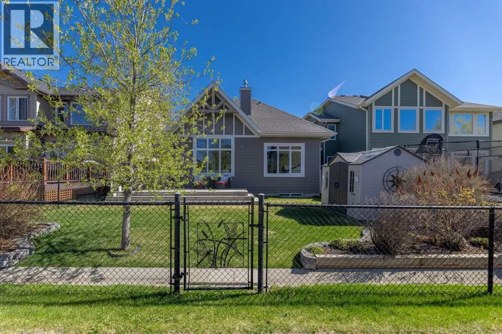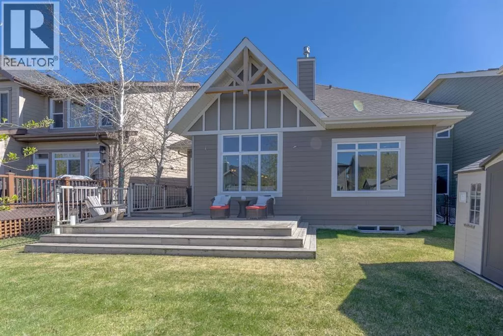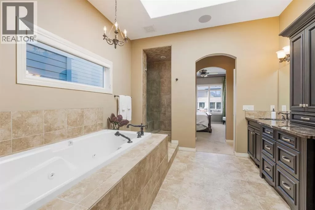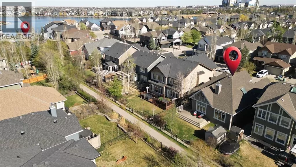Welcome to this Albi-built, custom-crafted bungalow in the heart of one of Calgaryâs most desirable lake communities. Just nine homes from the shared dock, this residence offers a perfect blend of luxury, comfort, and rare lake access. From the moment you arrive, the curb appeal makes a statementâstained solid wood garage doors, full-height brick columns, and pristine landscaping set the tone for whatâs inside. Step into a warm foyer that opens to a bright, open-concept layout featuring soaring 10-foot ceilings, transom windows, and rich hardwood floors throughout the main level. The gourmet kitchen is designed to impress, with ceiling-height cabinetry, granite countertops, a central island with spice cabinets at both ends, built-in wall oven and microwave with warming drawer, and a walk-through pantry for everyday convenience. The adjacent living room offers a cozy gas fireplace framed with custom millwork and expansive windows that fill the home with natural light while showcasing views of the backyard. A formal dining room provides an elegant space for entertaining, while the built-in home office is both stylish and functional. The spacious primary suite is a true retreat, complete with a spa-inspired ensuite featuring heated tile floors, a jetted tub, walk-in shower, dual vanities, and skylight. The walk-in closet even has its own window for natural light. The fully finished basement expands your living space with 9-foot ceilings, a large recreation room, two additional bedrooms, office space, and a full bathroomâideal for family or guests. Outdoors, your sunny backyard oasis awaits with a spacious deck overlooking the greenbelt and walking path. Whether hosting or relaxing, itâs the perfect extension of your living space. And with the lake just steps away, every day feels like a vacation.Additional highlights include central air conditioning, toe-kick vacuums in the kitchen and ensuite, oversized windows, and the welcoming sense of community this neighbourhood is known for. This isnât just a home itâs a lifestyle. (id:27476)