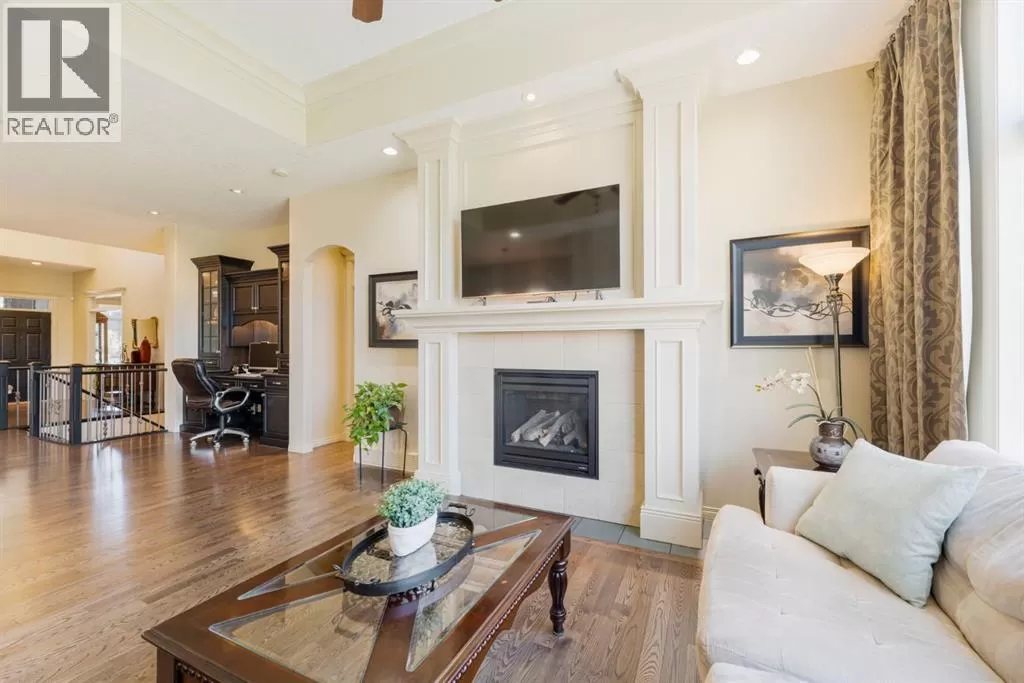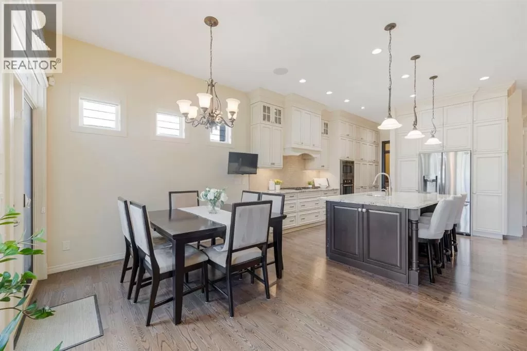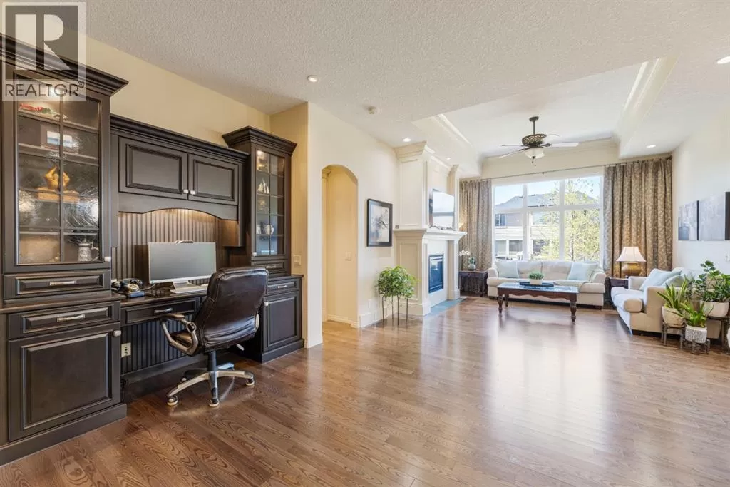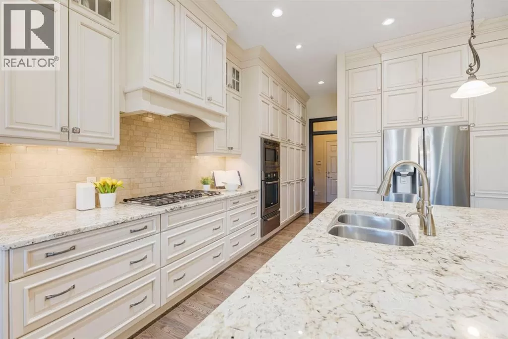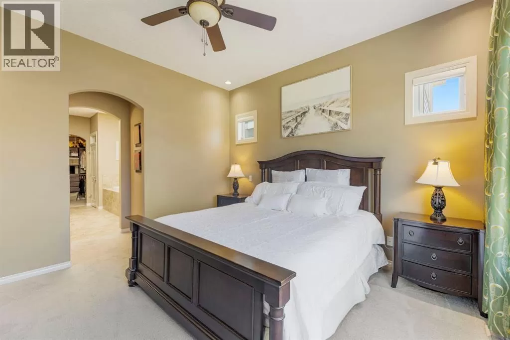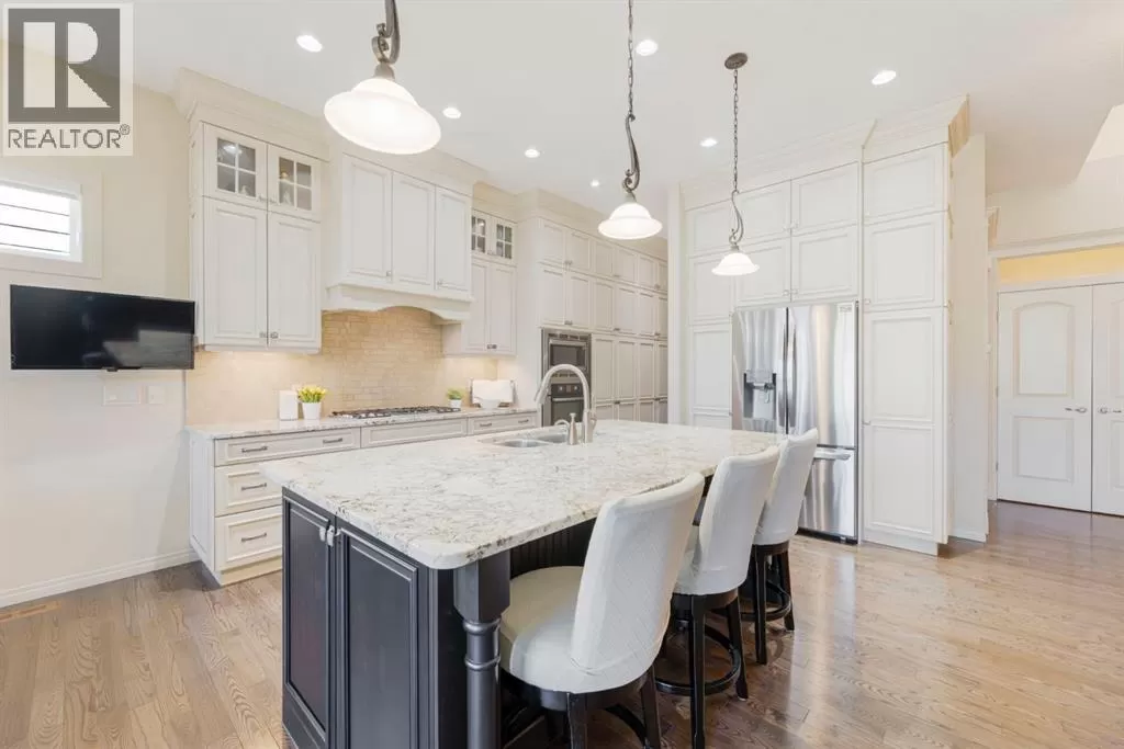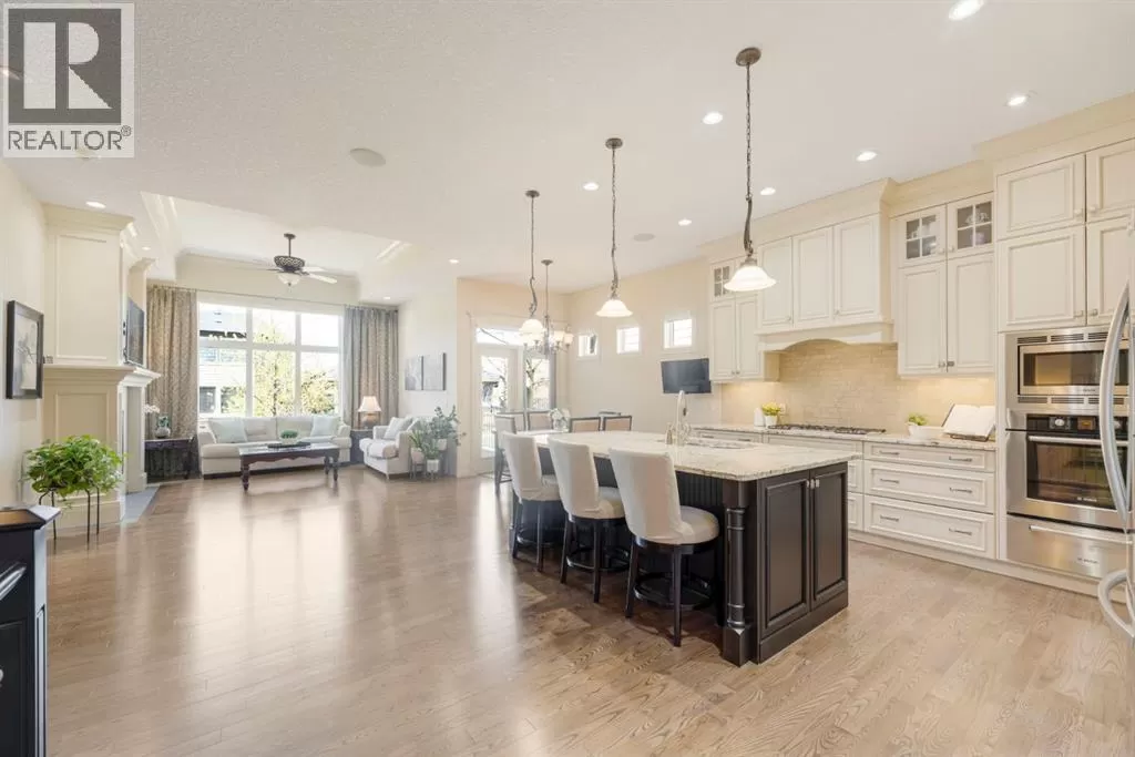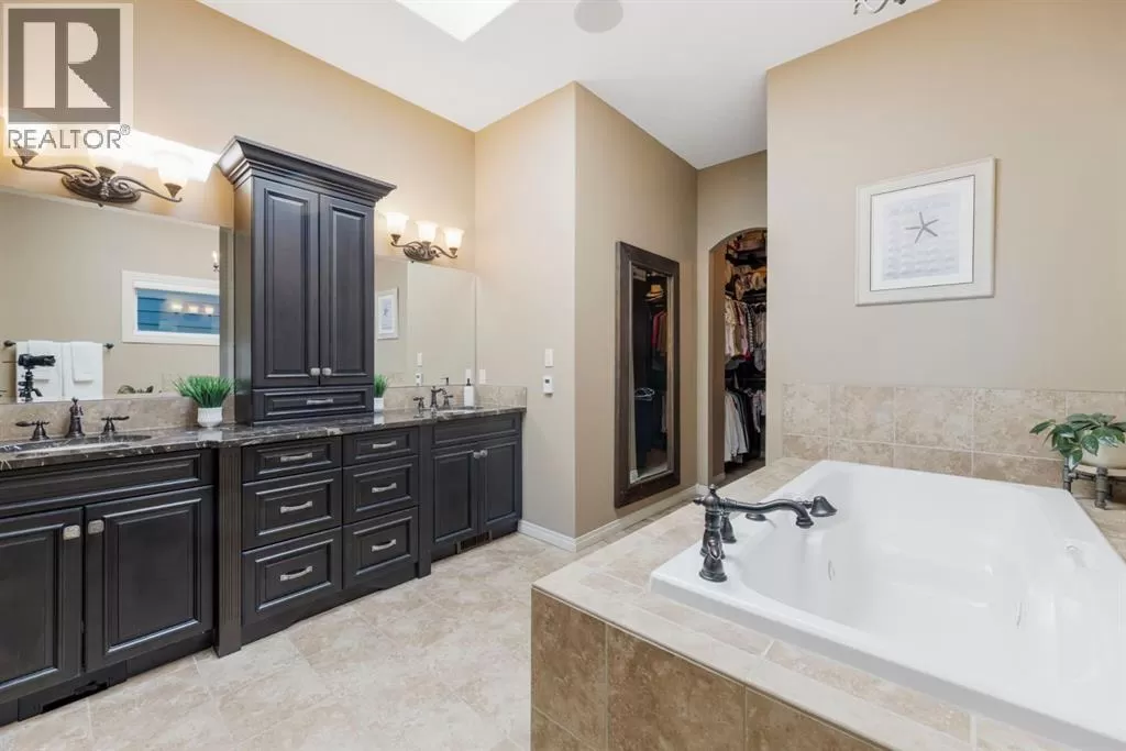 Welcome to this Albi-built, custom-crafted bungalow in the heart of one of Calgaryâs most desirable lake communities. Just nine homes from the shared dock, this residence offers a perfect blend of luxury, comfort, and rare lake access. From the moment you arrive, the curb appeal makes a statementâstained solid wood garage doors, full-height brick columns, and pristine landscaping set the tone for whatâs inside. Step into a warm foyer that opens to a bright, open-concept layout featuring soaring 10-foot ceilings, transom windows, and rich hardwood floors throughout the main level. The gourmet kitchen is designed to impress, with ceiling-height cabinetry, granite countertops, a central island with spice cabinets at both ends, built-in wall oven and microwave with warming drawer, and a walk-through pantry for everyday convenience. The adjacent living room offers a cozy gas fireplace framed with custom millwork and expansive windows that fill the home with natural light while showcasing views of the backyard. A formal dining room provides an elegant space for entertaining, while the built-in home office is both stylish and functional. The spacious primary suite is a true retreat, complete with a spa-inspired ensuite featuring heated tile floors, a jetted tub, walk-in shower, dual vanities, and skylight. The walk-in closet even has its own window for natural light. The fully finished basement expands your living space with 9-foot ceilings, a large recreation room, two additional bedrooms, office space, and a full bathroomâideal for family or guests. Outdoors, your sunny backyard oasis awaits with a spacious deck overlooking the greenbelt and walking path. Whether hosting or relaxing, itâs the perfect extension of your living space. And with the lake just steps away, every day feels like a vacation.Additional highlights include central air conditioning, toe-kick vacuums in the kitchen and ensuite, oversized windows, and the welcoming sense of community this neighbourhood is known for. This isnât just a home itâs a lifestyle. (id:27476)