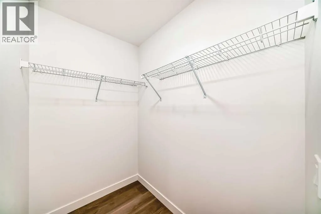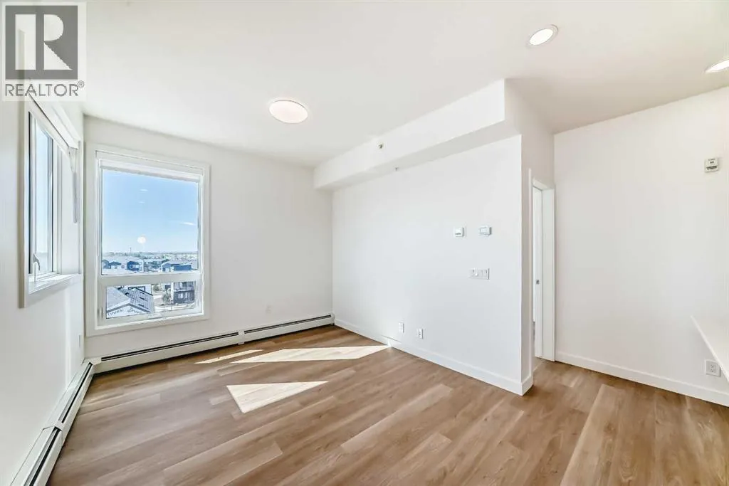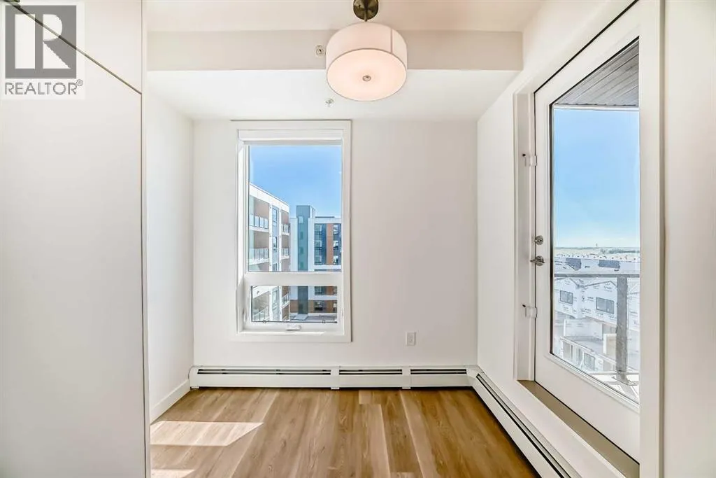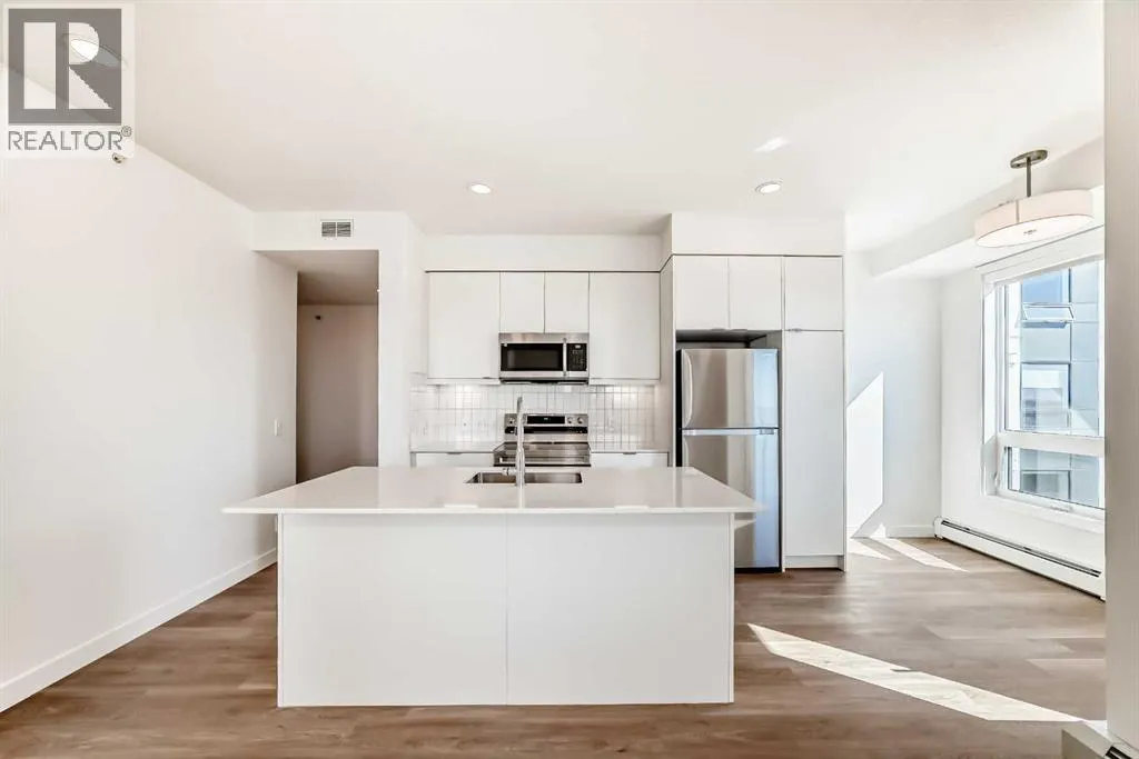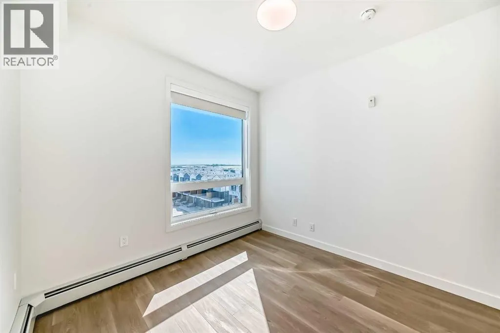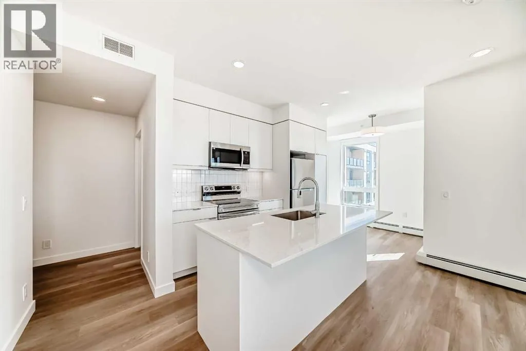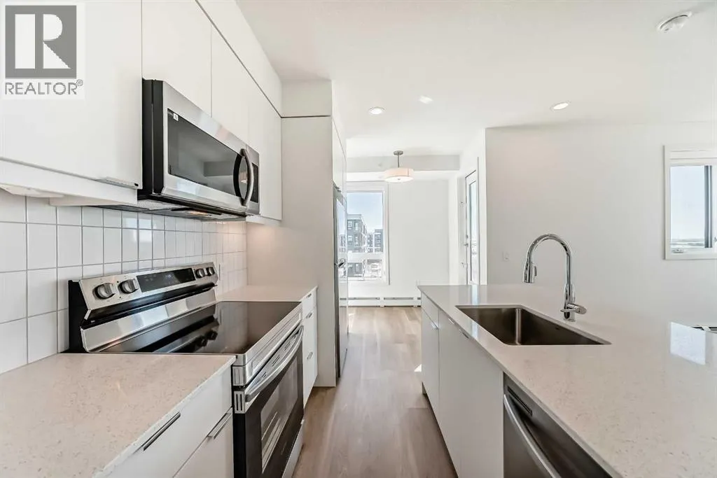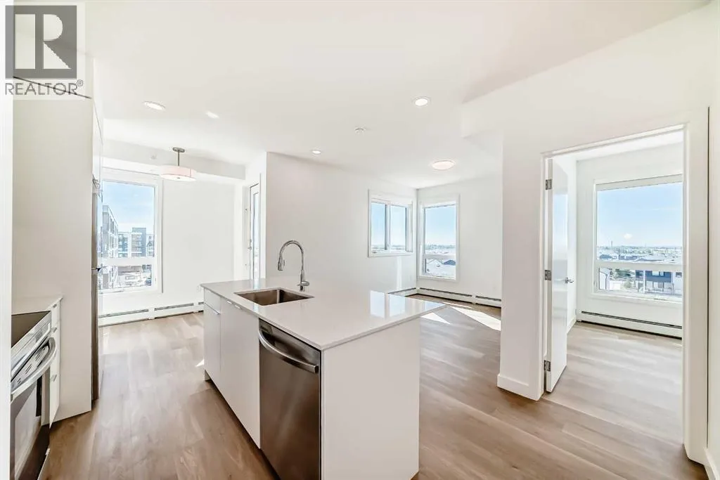 CORNER UNIT WITH 2 ENSUITE BATHROOMS. This bright 5th-floor corner unit features two spacious bedrooms, each with its own walk-in closet and ensuite bathroom. Located in East Hills Crossing, the home also includes underground parking and a storage locker. Enjoy being just steps from East Hills Shopping Centre (Costco, Walmart, Cineplex, banking), parks, and walking trails, with quick access to Stoney Trailâand only a 20-minute drive to downtown Calgary.Inside, the open-concept layout offers sleek white cabinetry, a large eating bar, and a dedicated dining space. Expansive corner windows flood the condo with natural light, while south and east views highlight its prime position. The dining area opens to a private balcony, perfect for morning coffee or relaxing on sunny afternoons.With in-suite laundry, titled underground parking, and a separate storage unit, this condo delivers a complete package for first-time buyers, downsizers, or investors. Book your private showing today! (id:27476)