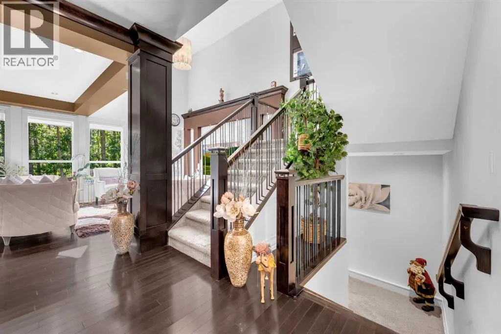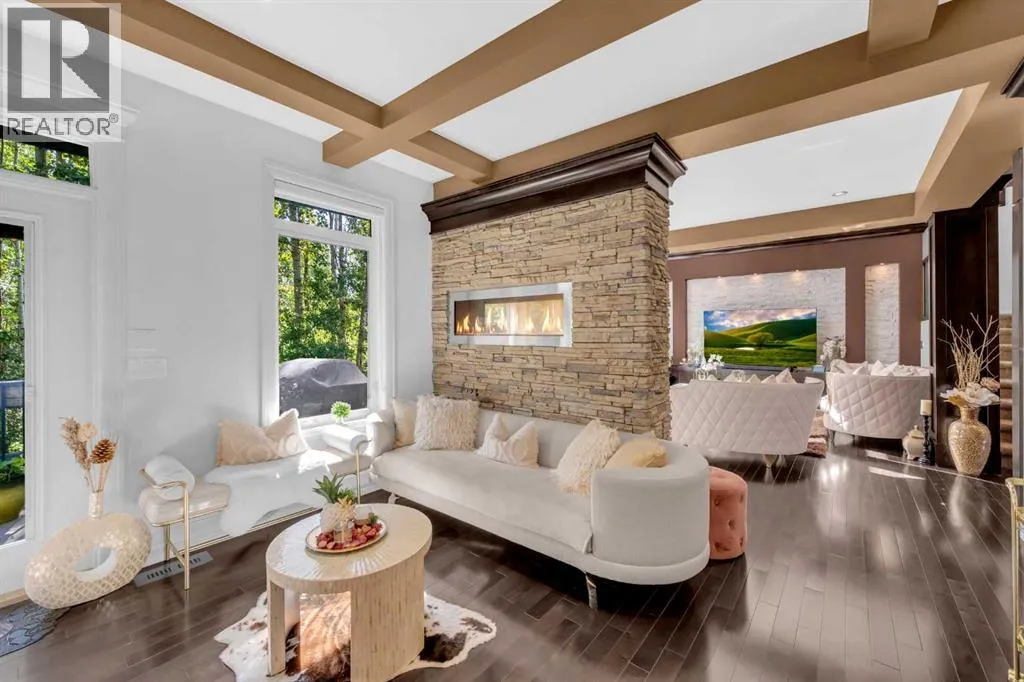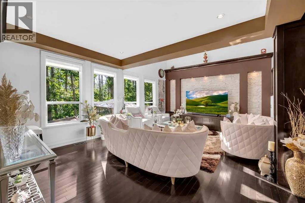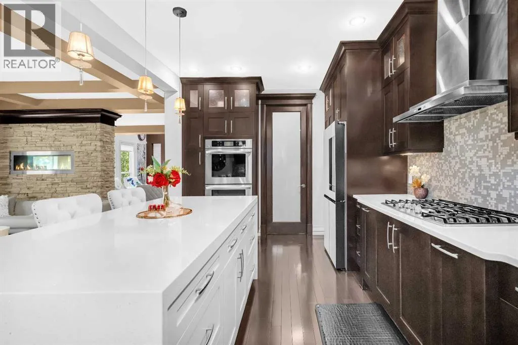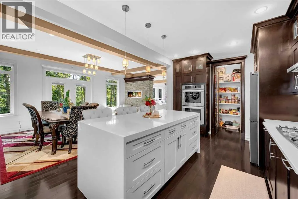 Discover a haven of refined living nestled against a tranquil forest in this former show home, where captivating stone and stucco exterior architecture meets a bespoke wooden trim lined interior that radiates timeless elegance. With over 4900 total square feet throughout this luminous five bedroom, three full bath residence it features an attached triple car garage, two powder rooms, and a main floor defined by soaring 9 foot ceilings, a gracious den, and a majestic 3D gas fireplace. The gourmet kitchen, ensconced beneath a chauffeured ceiling over the dining area offers floor to ceiling cabinetry, built in appliances, a vast pantry, Samsung smart fridge, and colossal island, all crafted for both culinary excellence and effortless entertaining. Upstairs, a sun drenched open-to-below bonus room with an electric fireplace overlooks the living area on the main floor and is accompanied by two bedrooms that share a Jack and Jill style bath with an additional common powder room upstairs. The luxurious master suite serves as an elegant retreat with a cathedral ceiling, pot lights, cozy gas fireplace, and spa-inspired ensuite featuring dual vanities, a two-person air tub, an opulent steam shower, and his and hers walk in closets creating a truly one of a kind space and atmosphere. The walkout lower level beckons as a radiant entertainment sanctuary, offering ample natural light through oversized windows, a near full kitchen including high end Electrolux appliances and combo oven/microwave, two additional bedrooms, and another versatile space ideal for a den or media lounge. Premium amenities within the home encompass central air conditioning, dual furnaces, water filtration system, abundant pot lighting and much much more. The southeast facing backyard flows seamlessly into a private wooded backdrop, crafting an idyllic extension of your indoor sanctuary and presenting the perfect space for any gathering you could have. Just minutes from top tier schools such as William D. Pratt School and Royal Oak School, the YMCA, shopping centers, and grocery stores, this residence delivers an extraordinary fusion of elevated design, sophistication, and effortlessly accessible community luxury that can only be gained by making this home yours. (id:27476)