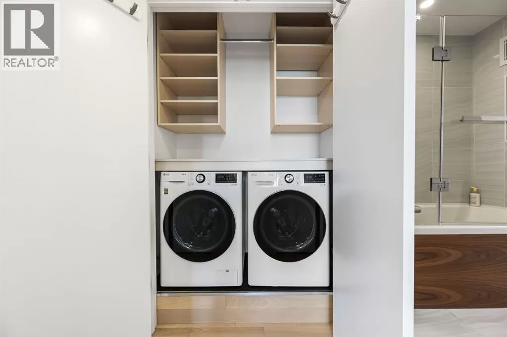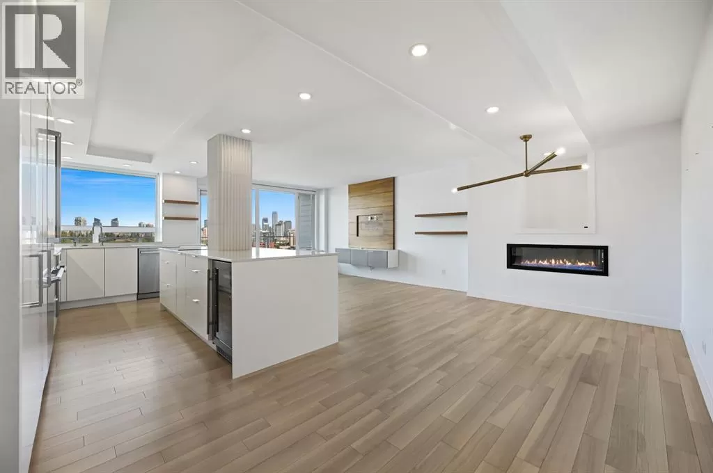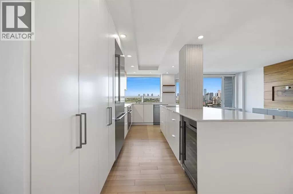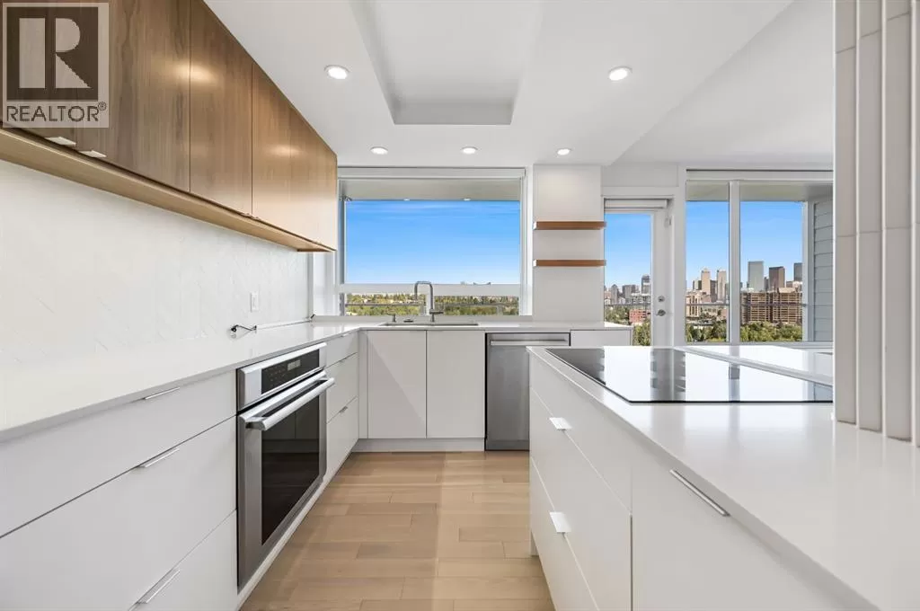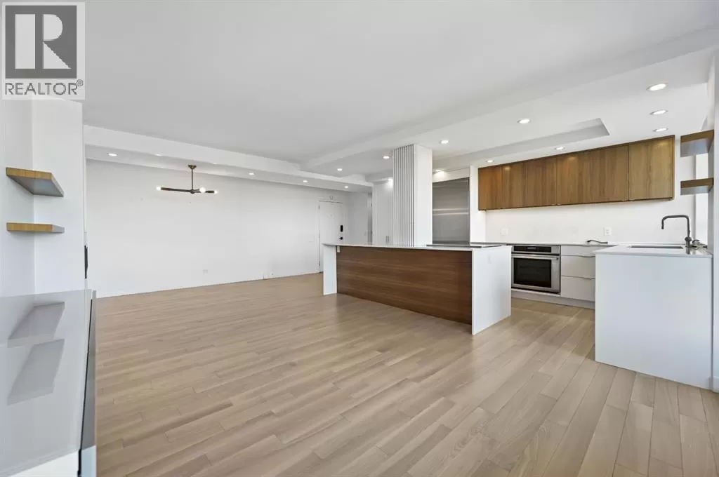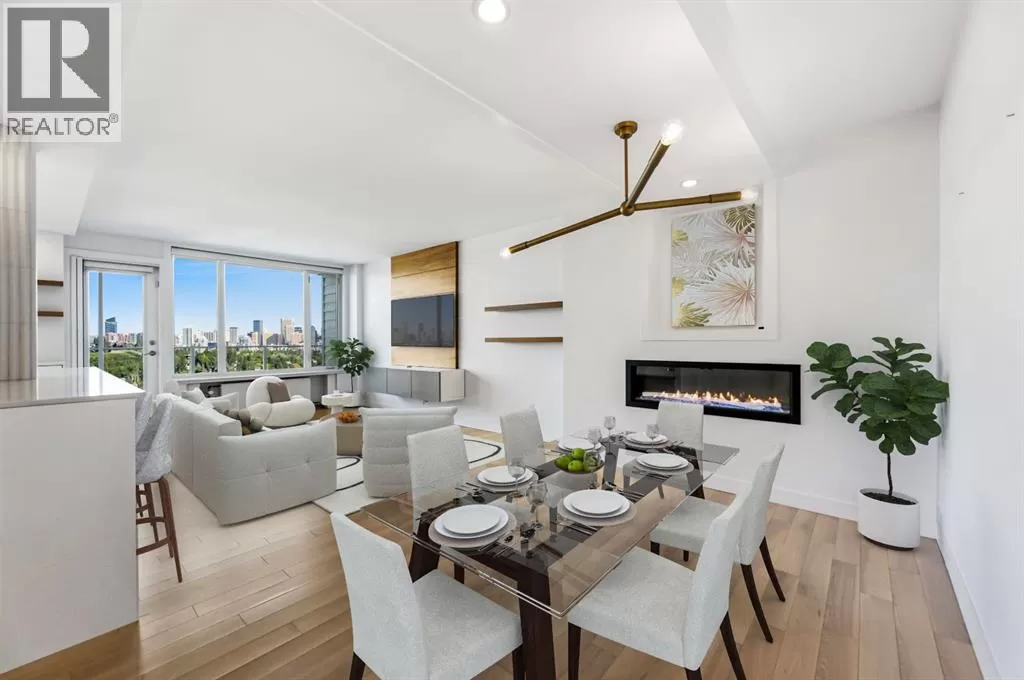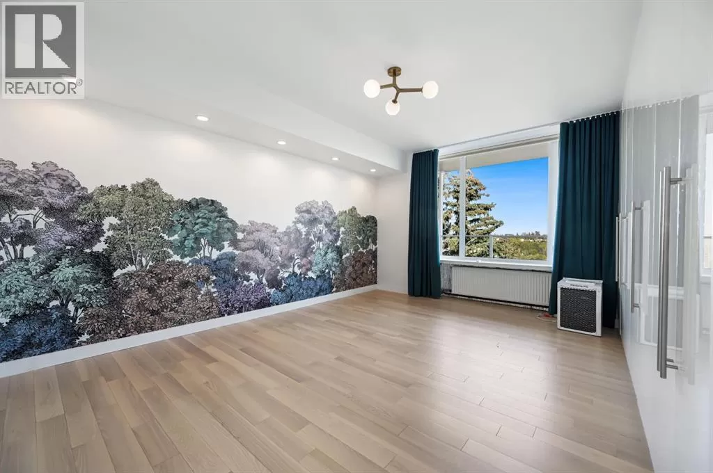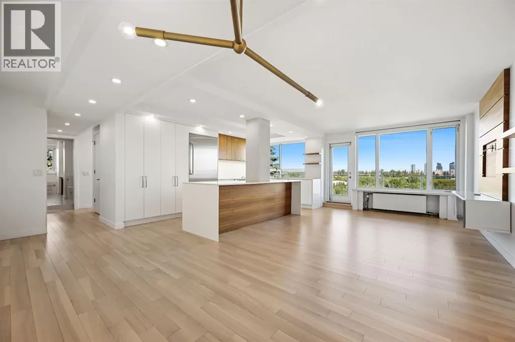 Uninterrupted panoramic views of Calgaryâs downtown skyline define this recently renovated two-bedroom, one-bathroom end unit on the 6th floor of the renowned Renfrew House.Renovated in 2016, the transformation went far beyond aesthetics. The unit was completely rebuilt to modern standards with new windows, electrical wiring and panel, updated plumbing lines, enhanced soundproofing, and hardwired CAT 6e networking throughout for seamless connectivity.Inside, mid-century modern design meets contemporary sophistication. Commercial-grade Coswick hardwood floors, dimmable LED lighting with designer fixtures, and Lutron controls create a polished ambiance, while unique touchesâlike the restored original milk delivery door and custom quartz-topped radiator coversâpreserve timeless character.The kitchen is a culinary showpiece, boasting built-in Thermador and Bosch appliances including an induction cooktop, custom soft-close cabinetry, and a striking Italian chevron Mutina stone backsplash lit by LED under-cabinet lighting. A built-in electric fireplace enhances the dining area, while the living room is anchored by a walnut-paneled TV feature wall framed by sweeping city views.Custom closet systems maximize storage throughout, while the spa-inspired bathroom offers a walnut vanity, quartz counters, Grohe and Kohler fixtures, and a dedicated makeup station. The primary bedroom provides elegant, functional closet solutions, and the spacious second bedroom is perfect for guests or a home office.The home includes underground parking and a storage unit, all within 13 acres of park-like grounds atop the hillâan unmatched setting combining green space, privacy, and city convenience.Book your private showing today. (id:27476)