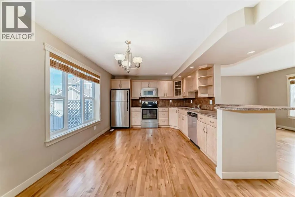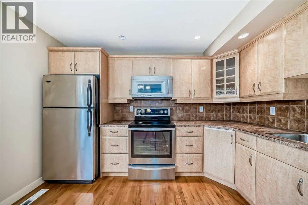 **Price reduced 16K. 3 New windows facing at the front were just installed** Welcome to this beautiful 2 storey, 2 bedrooms, both with walk-in-closet and ensuite bathroom fully finished home in Garrison Woods. Located close to the French school and a short walk to shopping or public transport. The exterior features poured sidewalks in the front and extensive custom decking in the back yard leading to the double garage. Natural hardwood flooring all through the main floor. Kitchen is highlighted by maple colour cabinets, stainless steel appliances and a gas fireplace in living room. The upper floor has two generous bedrooms, each with walk in closets and ensuite bathrooms. The lower level has a 3 pieces bathroom and huge family room, currently used as the home office with the remainder of the lower level could be used as an exercise area, a TV or recreation room. Well kept and neat as a pin this is a true pride of ownership home. **Newer roof 2024, New hot water tank 2025, New 3 windows at front facing.** (id:27476)