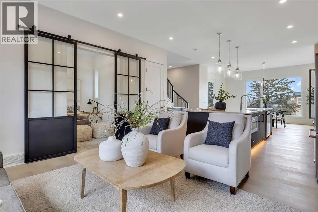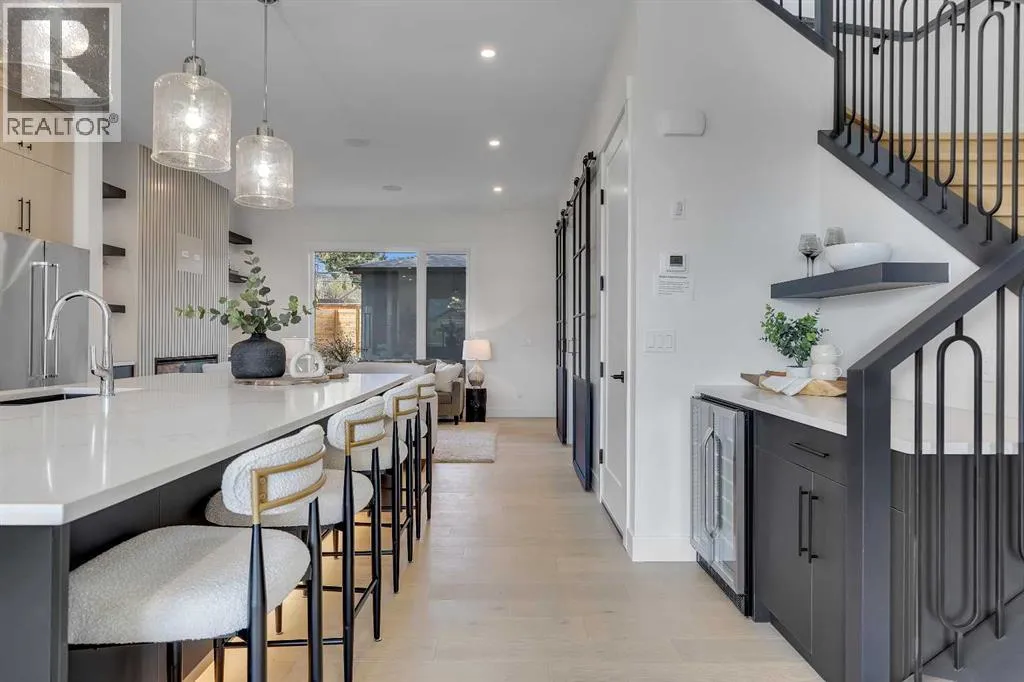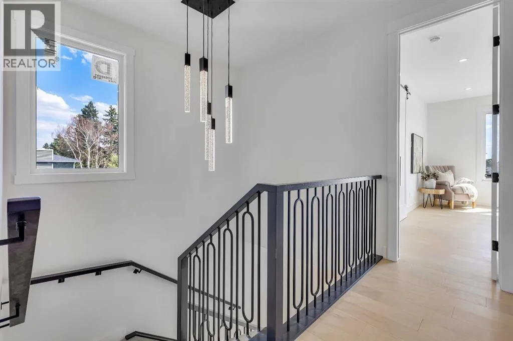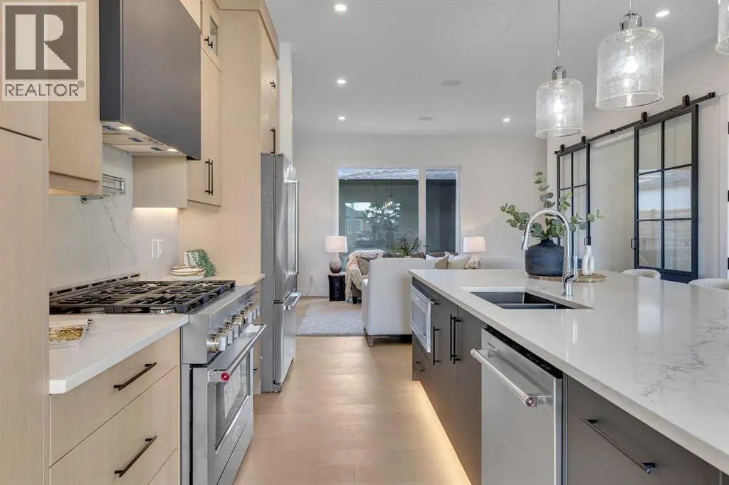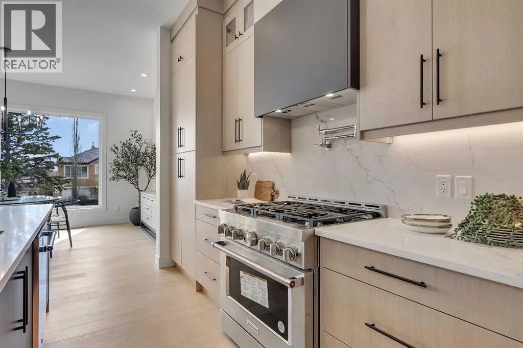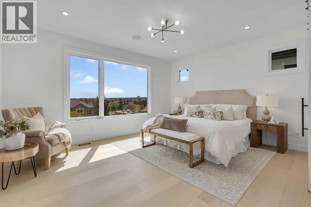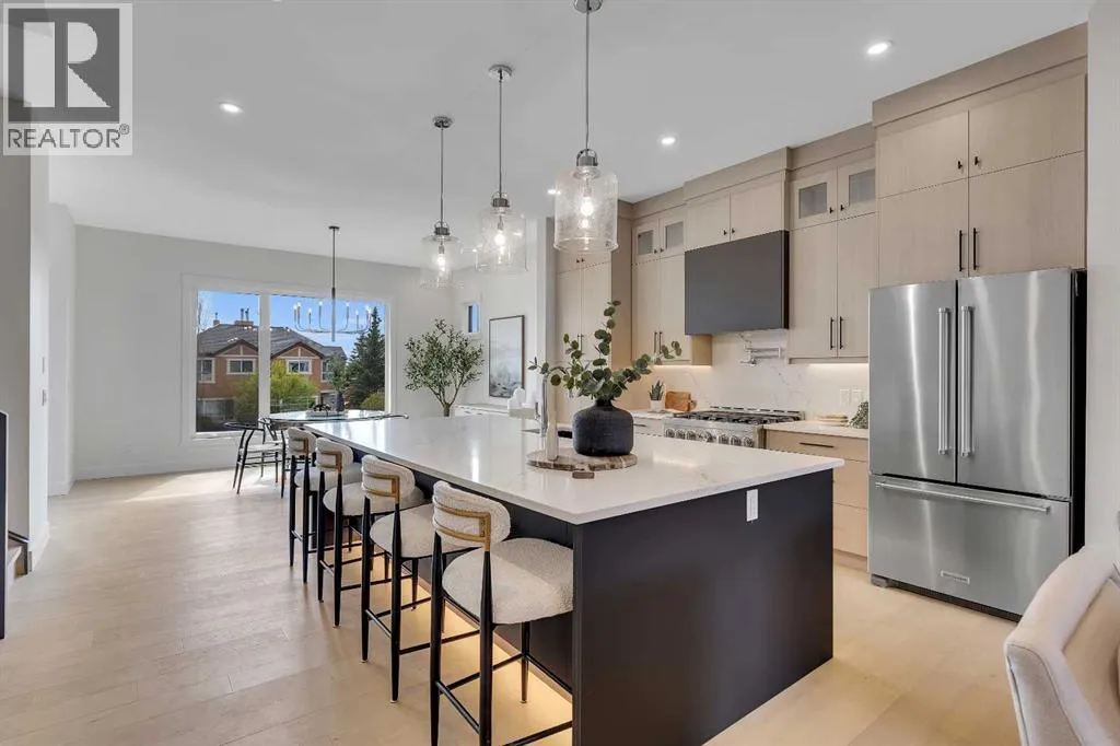 COLLINGWOOD LUXURY CUSTOM HOME | ATTACHED DOUBLE GARAGE | LEGAL 2 BDRM BASEMENT SUITE. Welcome to 42 Collingwood Place. Situated on a 32â x 100â lot atop a quiet cul-de-sac in Collingwood Place, this custom-built home features over 3,000 sqft of total living area. Every detail has been meticulously planned for OPTIMAL LIVING. The main floor features 10â CEILINGS and a bright south-facing dining area to house all your guests over the holidays. The chefâs kitchen is built with an OVERSIZED ISLAND with quartz counters and LED-under-lighting, matching quartz backsplash, full-height cabinetry and a pot-filler above the 36â gas range. A COFFEE BAR with cabinetry and a beverage fridge adds convenience. A private office is secluded by custom French-inspired iron and glass casement sliding doors provides a sanctuary. The living room features an electric fireplace, custom LED shelving, an in-ceiling speaker system, and a powder room near the mudroom which featuring floor-to-ceiling cabinetry for ample gear storage. The ATTACHED double garage is FULLY INSULATED, drywalled, and includes a 200 AMP breaker, and gas heater and EV charger rough-ins. Upstairs, the primary suite offers breathtaking views of DOWNTOWN CALGARY and the ROCKY MOUNTAINS, an expansive walk-in closet, and a dual vanity ensuite with an OVERSIZED SOAKER TUB, STEAM SHOWER with dual niches, and a standalone VANITY COUNTER with a light-up mirror. A frosted glass window provides privacy while allowing in natural light. The laundry room features quartz counters, a sink, and full-height cabinetry. Two additional bedrooms overlook NOSEHILL PARK, each with custom closet built-ins. A main bathroom and linen closet complete this level. All bathrooms (except the powder room) include IN-FLOOR HEATING and LED underlighting. The LEGAL BASEMENT SUITE boasts 9â ceilings, a spacious kitchen, a large living area, and TWO BEDROOMS. The suite comes with a full kitchen / laundry appliance package. The mechanical room features TWO furnaces, an A/C unit for the main, a sump pump, radon rough-in, and an oversized hot water tank. The private courtyard-style backyard (vinyl decking) includes outdoor speaker rough-ins and a gas outlet for a BBQ or fire table. CONFEDERATION PARK is just steps away to the south, with Nose Hill Park to the north. Short walk to Collingwood elementary school , St. Francis High School & bus stops, plus easy access to downtown. Close to all amenitiesâCalgary Winter Club, shopping malls, U of C, Children and Foothills Hospitals. This home blends urban convenience with natural beauty and offers downtown & mountain views. Fully hardwired for security systems and cameras, it also qualifies for CMHCâs 30-year amortization and GST rebatesâcheck with your lender/accountant! Built by Archway Developments, a family-owned business with 20+ years of experience, this home is backed by Progressive New Home Warranty. (id:27476)
